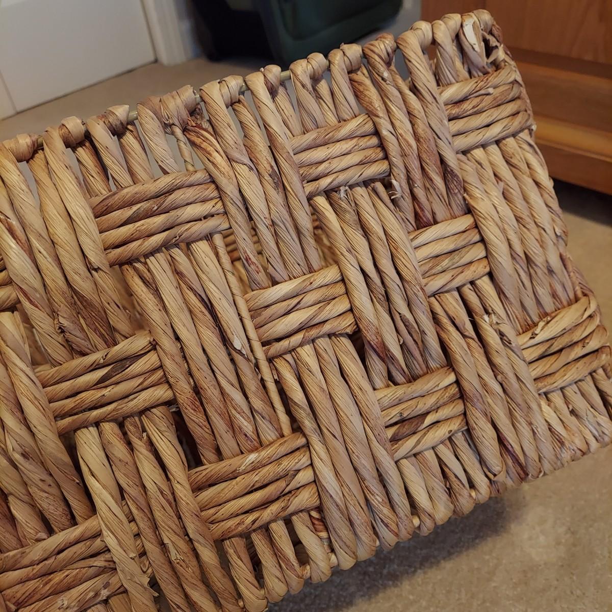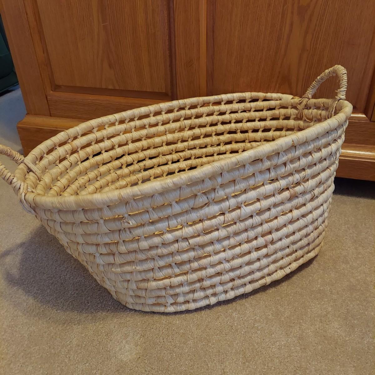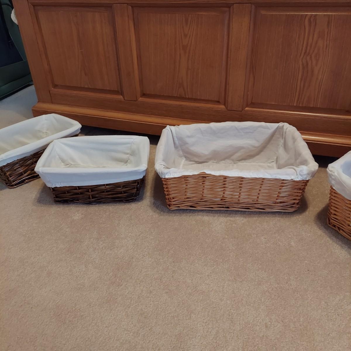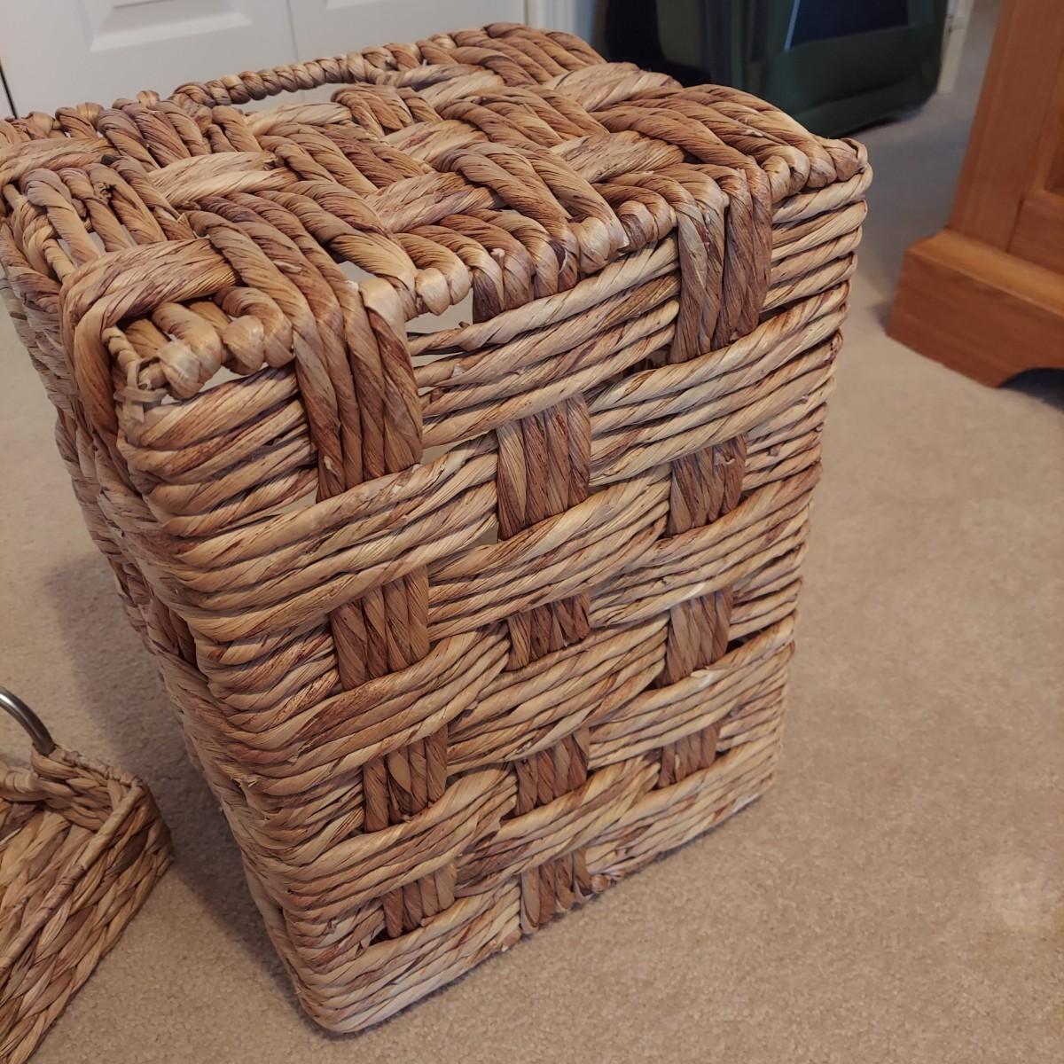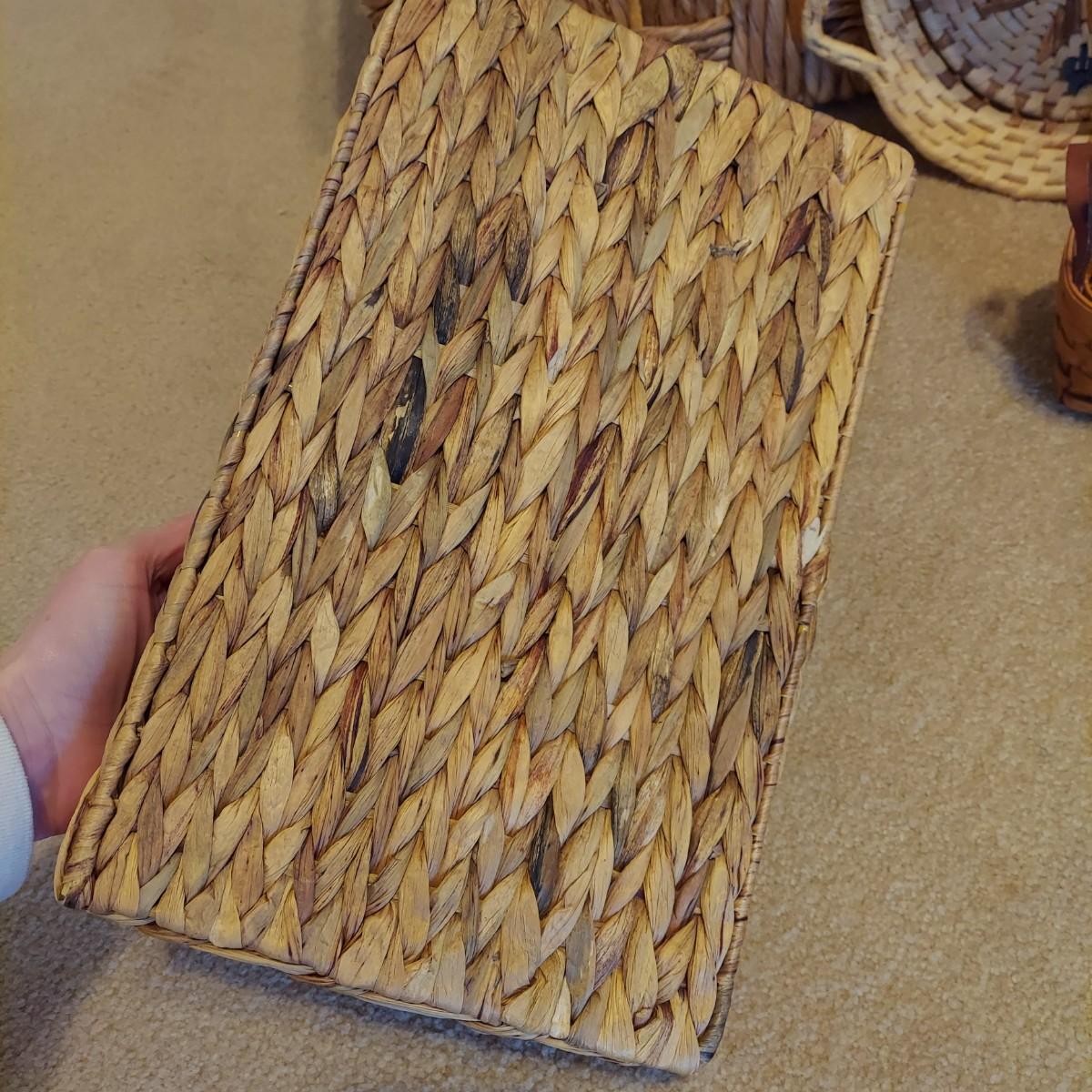 Nine baskets of various sizes and materials. The large, rectangular basket shown on the far left measures 16” x 12” x 11"H. The Longaberger basket is marked on bottom. It measures approximately 6” x 4” x 5"H including the leather handles. Shipping available.