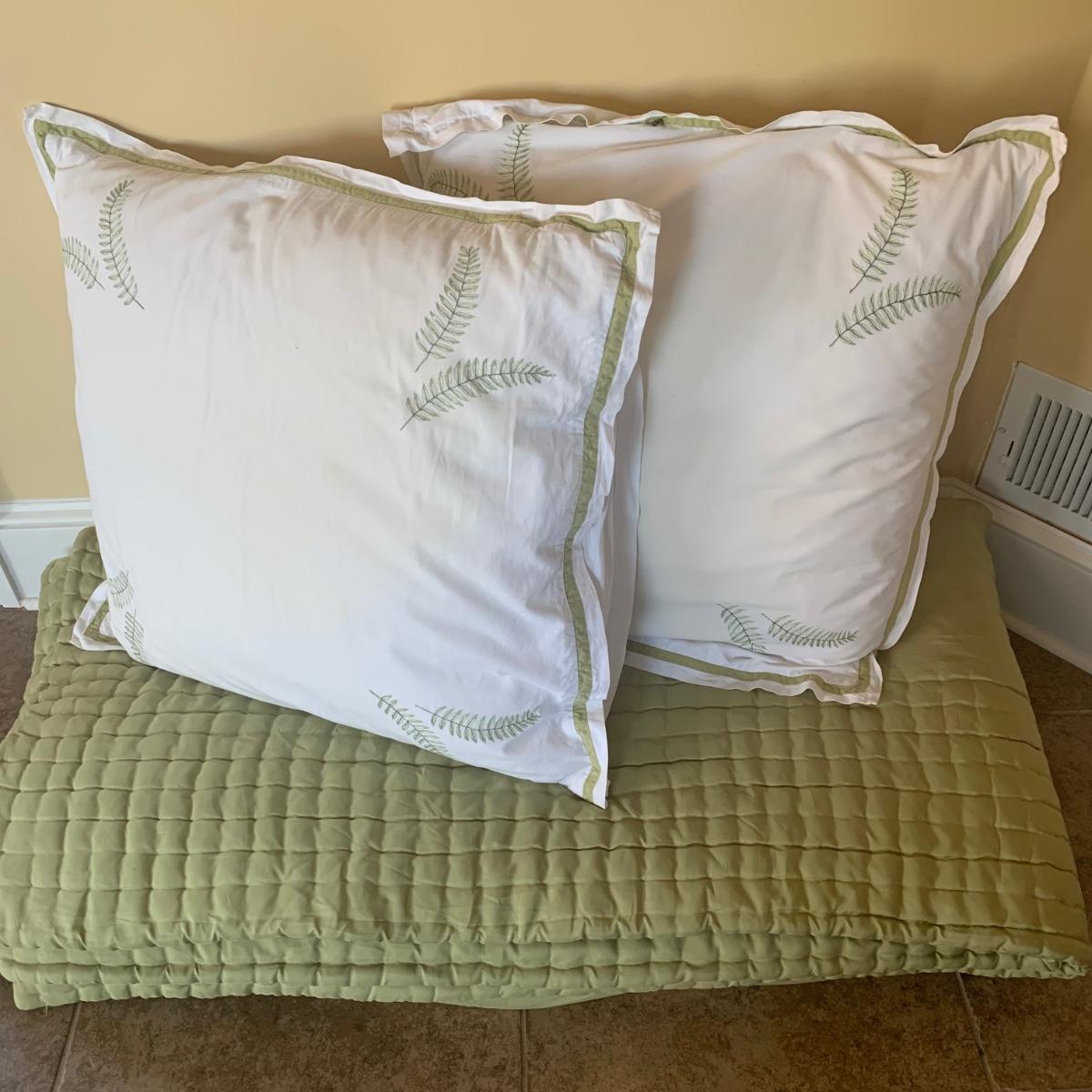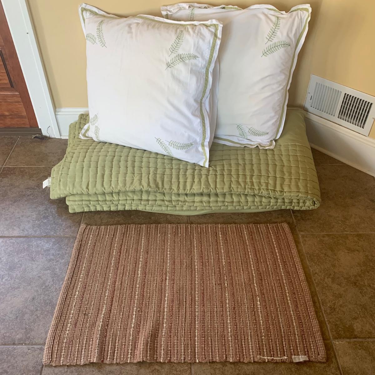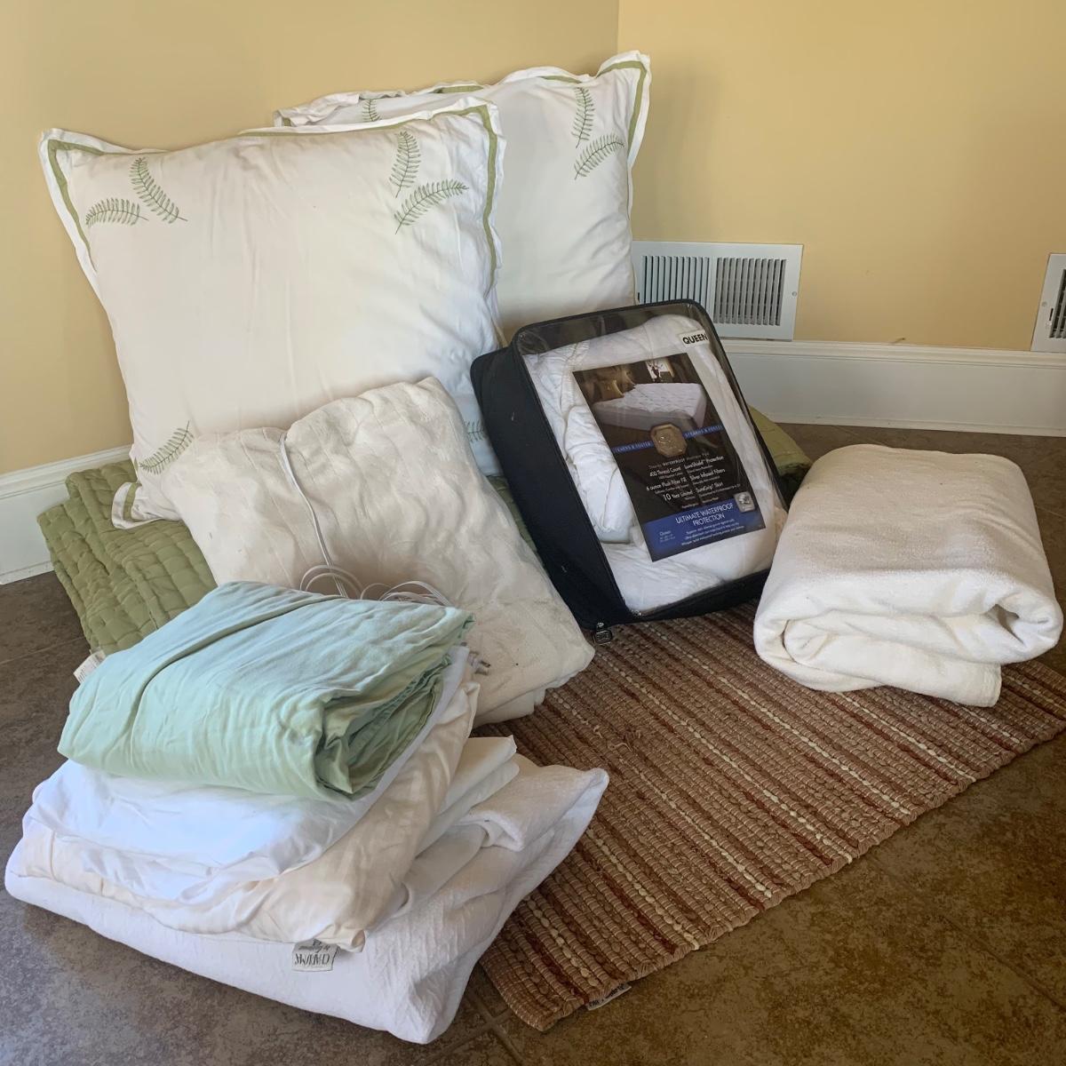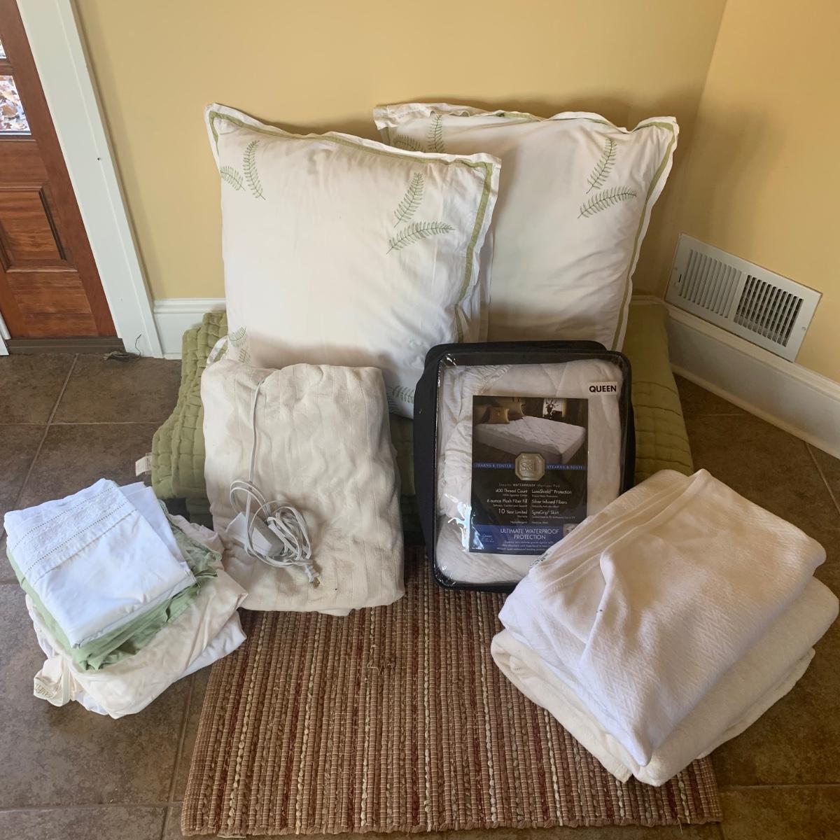 Winter is quickly approaching, keep warm with this large lot of bed linens. Lot includes Queen silk Pottery Barn bedspread, two white and green fern leaf down pillows, one queen waterproof mattress pad, two sets of queen sheets (non-matching), two queen coverlets, small Pier-One Imports rug, and a SensorPedic micro fleece electric blanket. All blankets will need to be cleaned as they have been in storage. Small Pier-One Imports rug does have some wear. See photos for more details. Electric blanket powers on and heats up quickly!