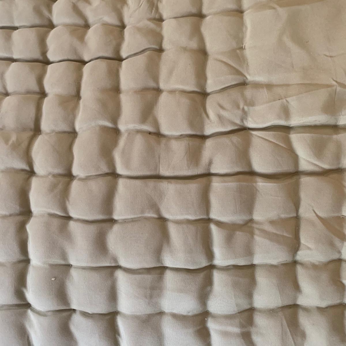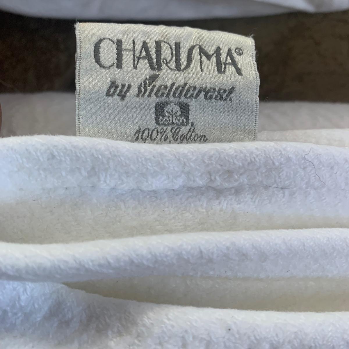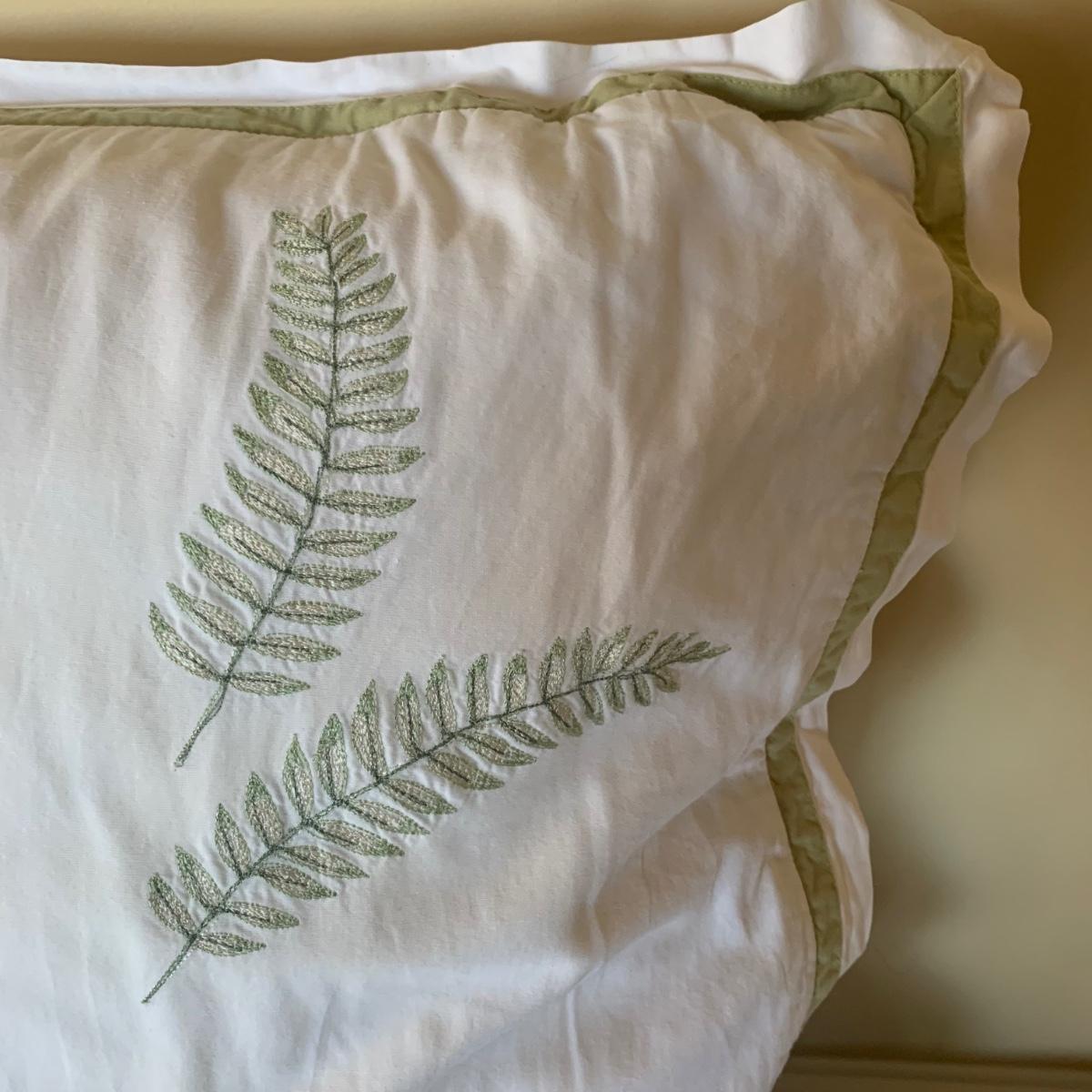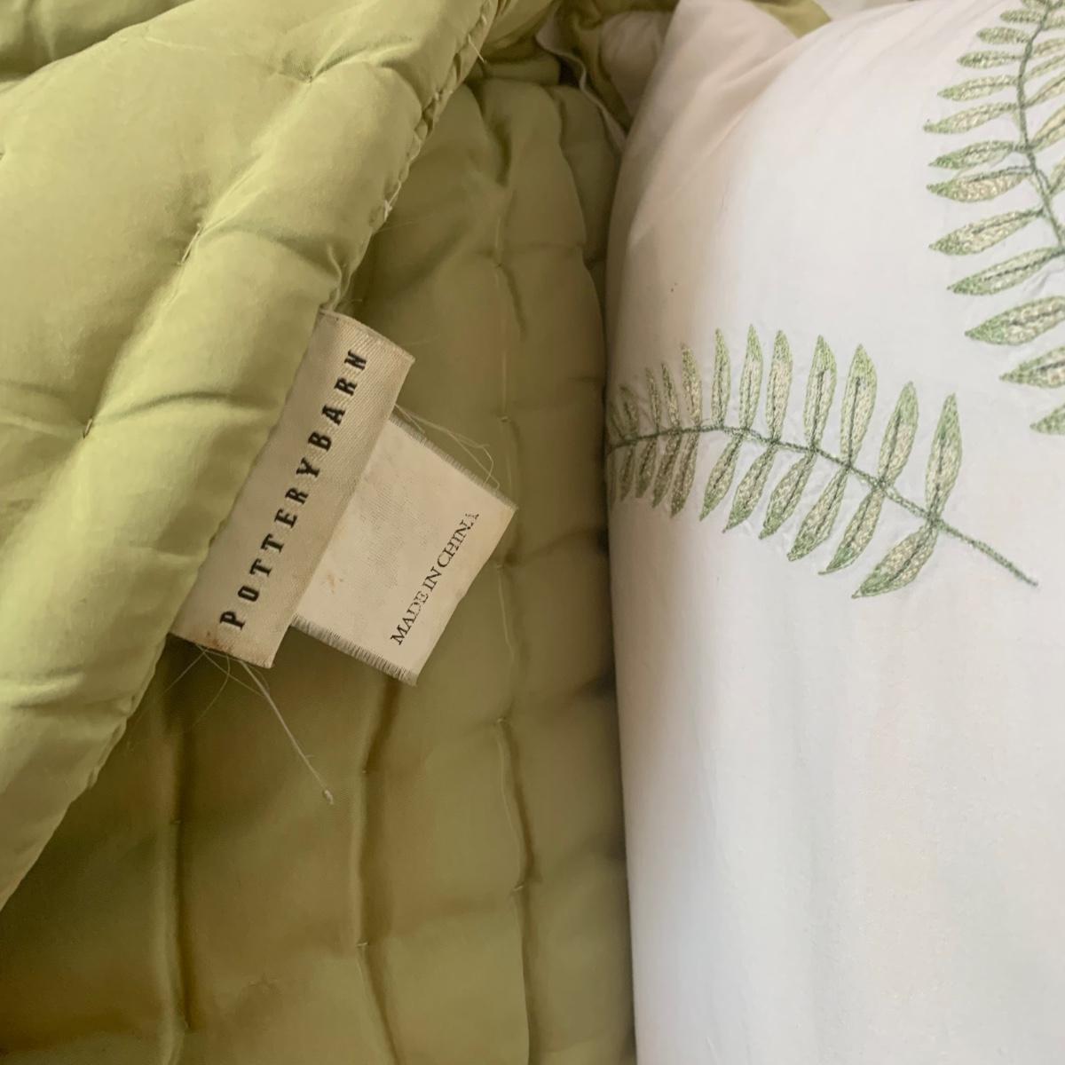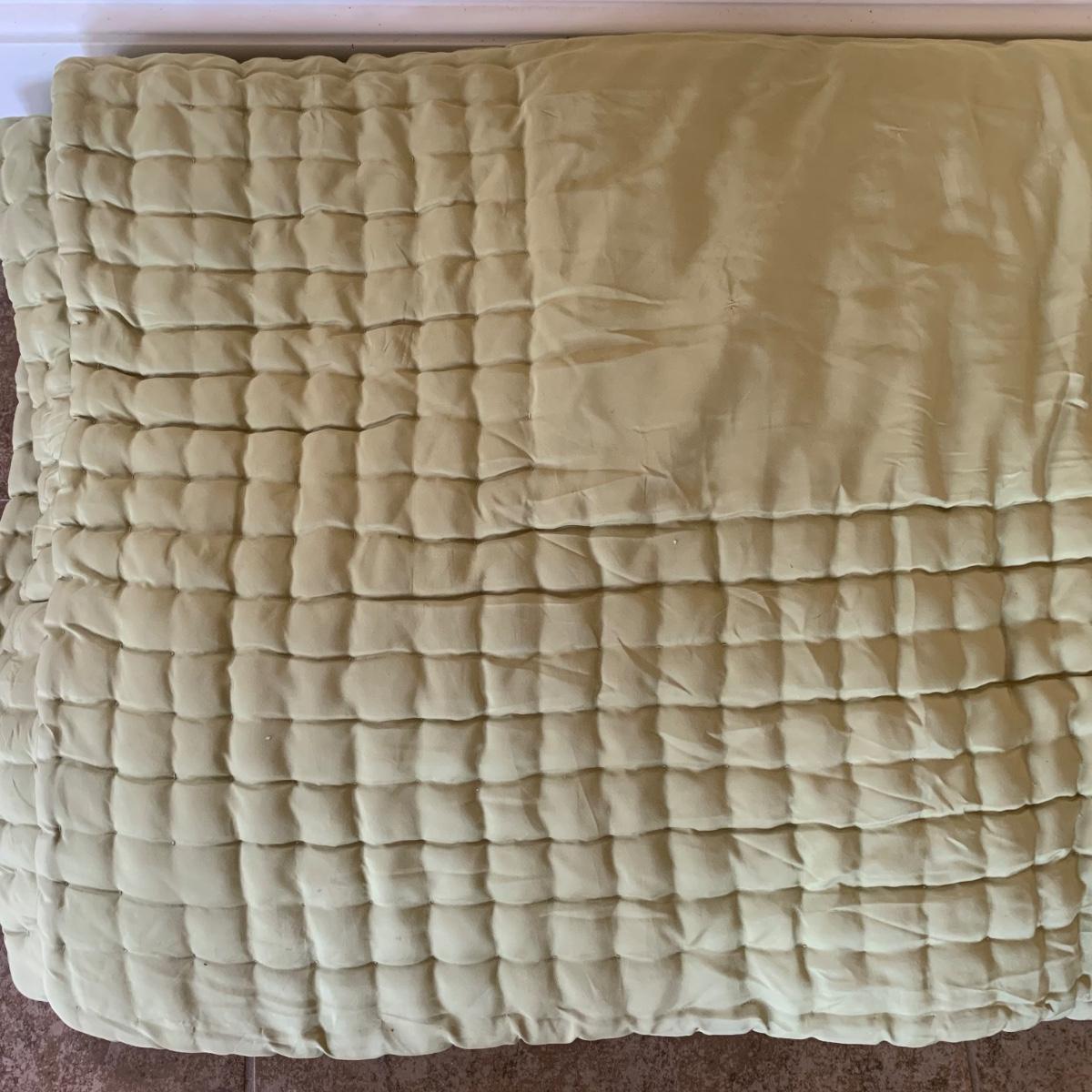 Winter is quickly approaching, keep warm with this large lot of bed linens. Lot includes Queen silk Pottery Barn bedspread, two white and green fern leaf down pillows, one queen waterproof mattress pad, two sets of queen sheets (non-matching), two queen coverlets, small Pier-One Imports rug, and a SensorPedic micro fleece electric blanket. All blankets will need to be cleaned as they have been in storage. Small Pier-One Imports rug does have some wear. See photos for more details. Electric blanket powers on and heats up quickly!
