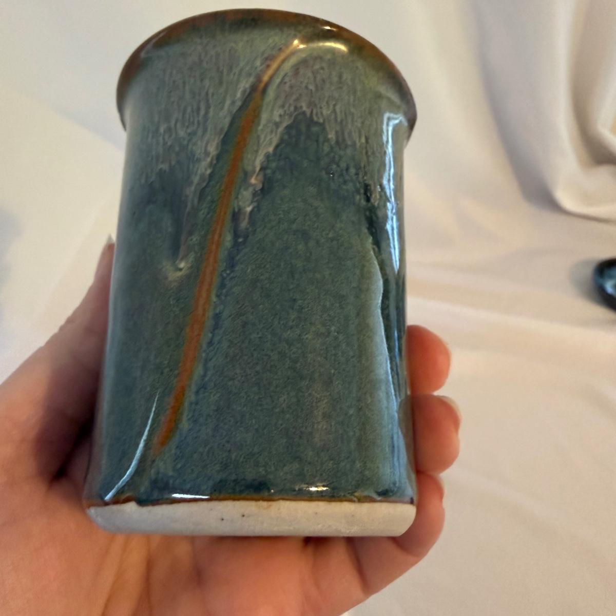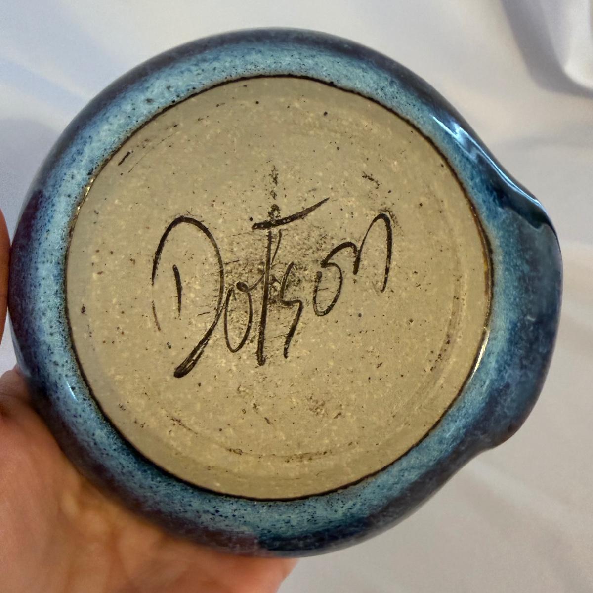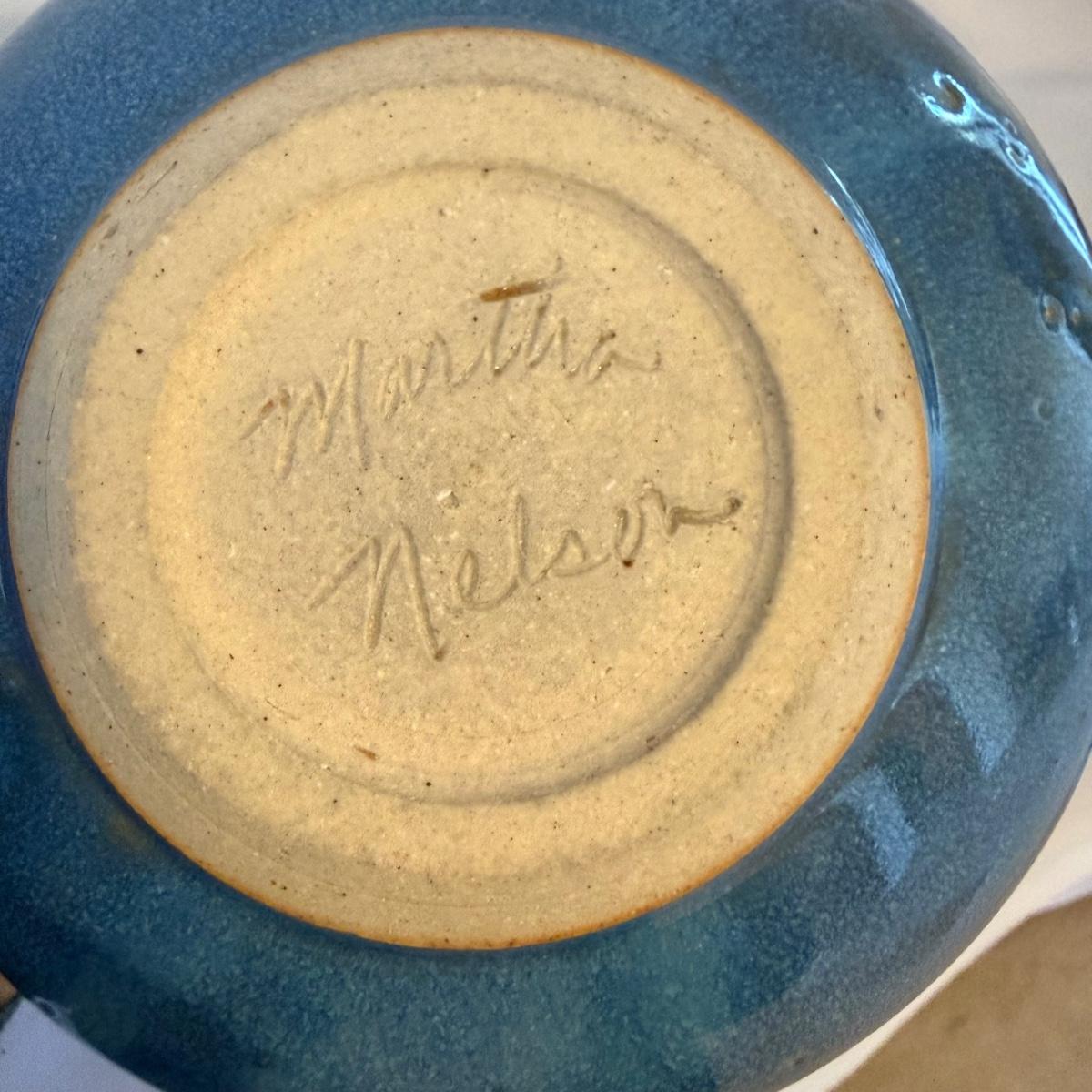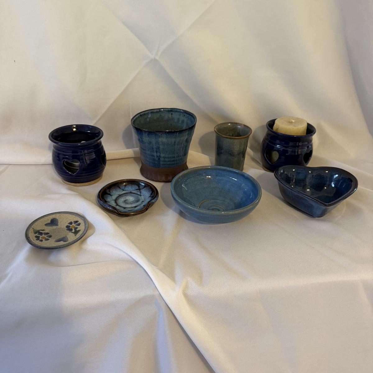 This lot contains eight pieces of blue glazed pottery. Included are two royal blue candle holders with heart shaped windows that both measure 4”D x 3.75”H. A lovely beeswax candle is included. Next are a beautiful blue Remi pot from BB Barns, as well as a cup. There's also a heart shaped candy dish that measures 5.5” x 5” x 2”H. We also have a blue bowl with a fun spiral in the center, signed Martha Nelson (likely local Asheville artist), as well a tiny blue plate with blue flowers. Our last item in this lot is a gorgeous blue spoon rest signed Dotson, indicating artist Tracy Dotson, known for her blue fish scale style designs. Please see pictures for signatures and details.