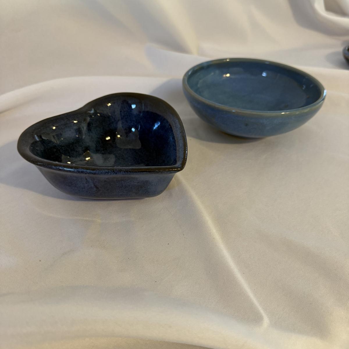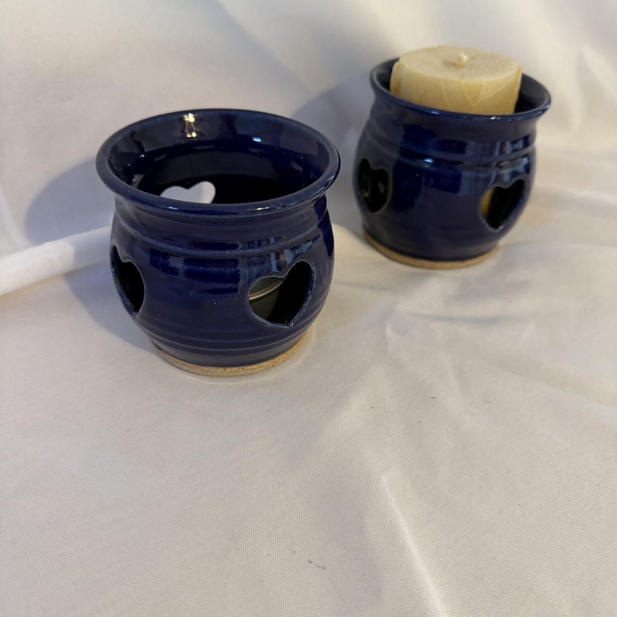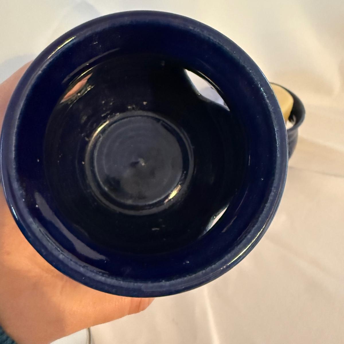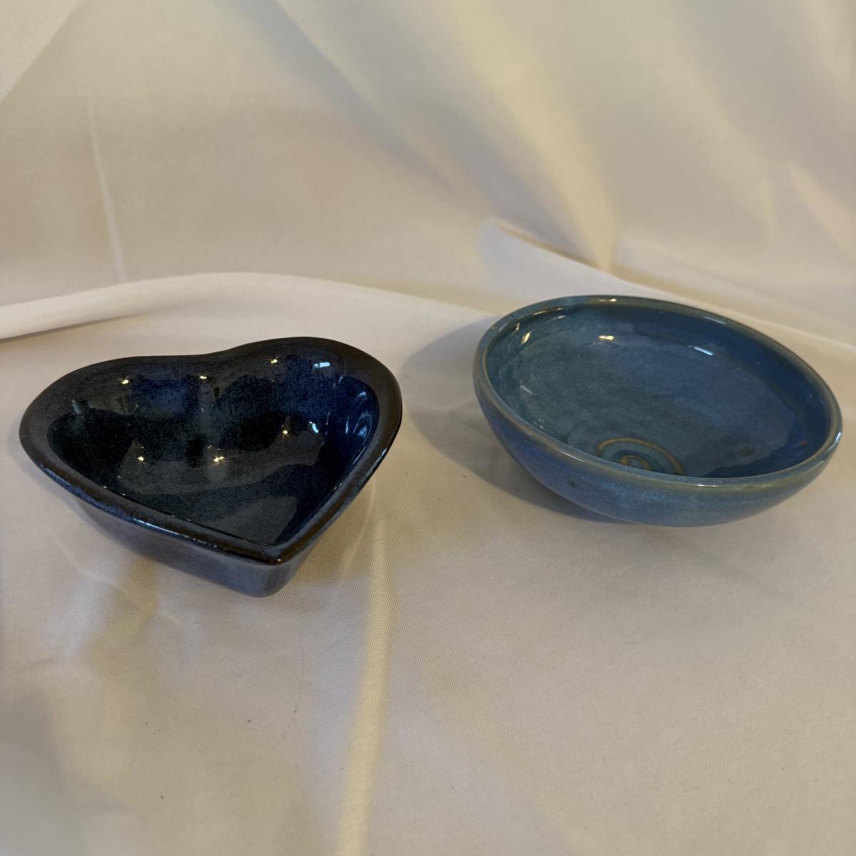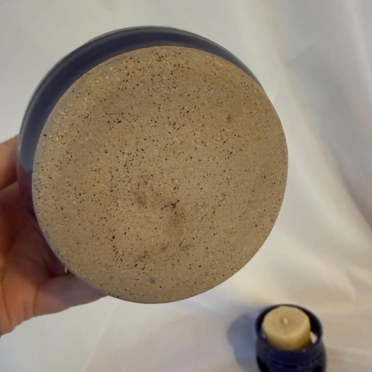 This lot contains eight pieces of blue glazed pottery. Included are two royal blue candle holders with heart shaped windows that both measure 4”D x 3.75”H. A lovely beeswax candle is included. Next are a beautiful blue Remi pot from BB Barns, as well as a cup. There's also a heart shaped candy dish that measures 5.5” x 5” x 2”H. We also have a blue bowl with a fun spiral in the center, signed Martha Nelson (likely local Asheville artist), as well a tiny blue plate with blue flowers. Our last item in this lot is a gorgeous blue spoon rest signed Dotson, indicating artist Tracy Dotson, known for her blue fish scale style designs. Please see pictures for signatures and details.