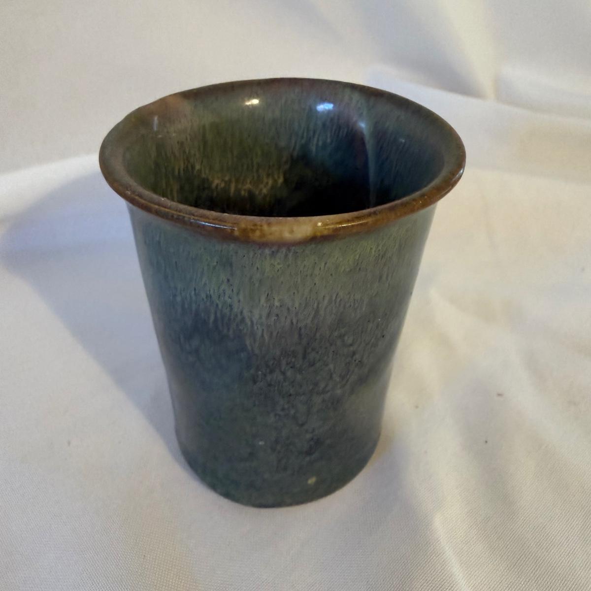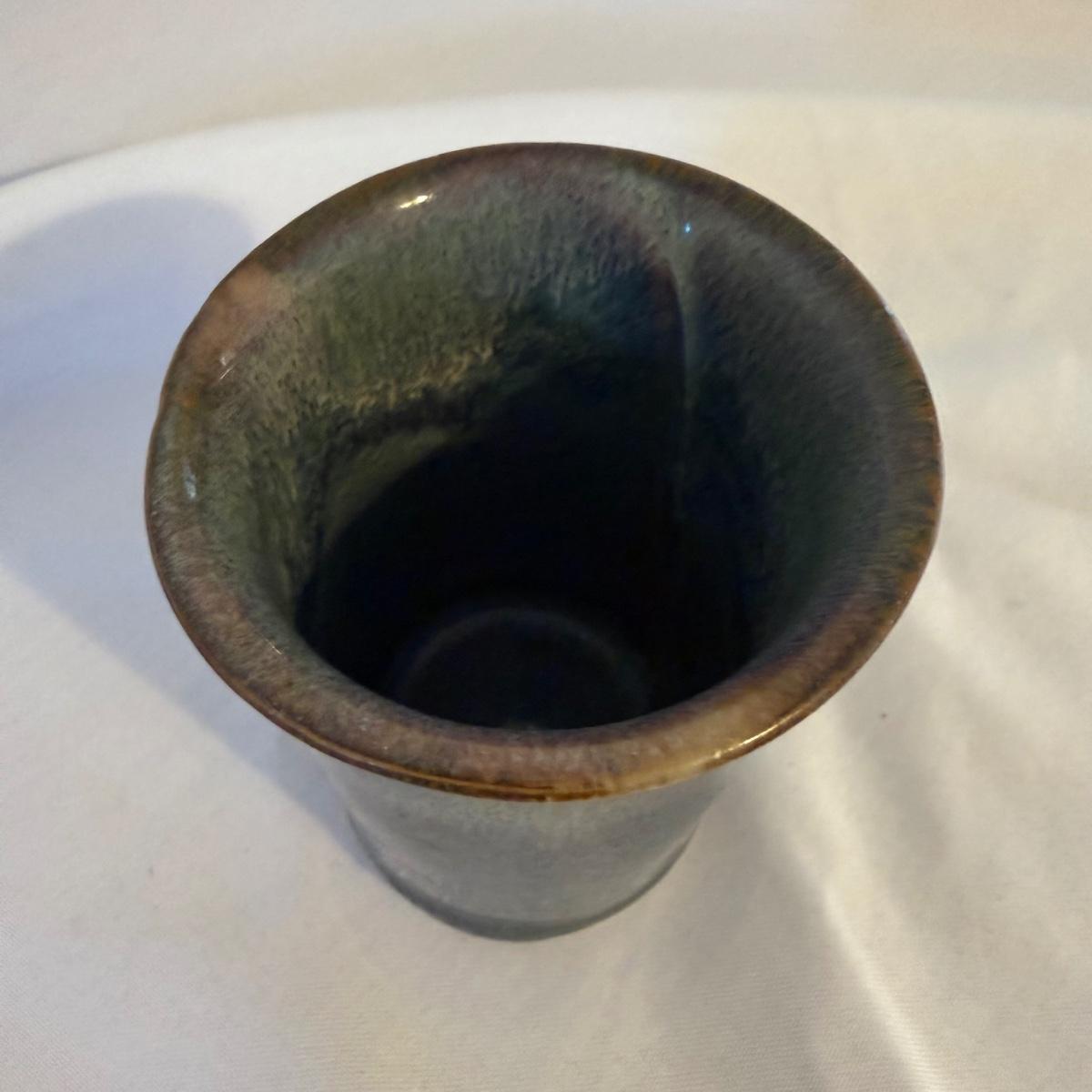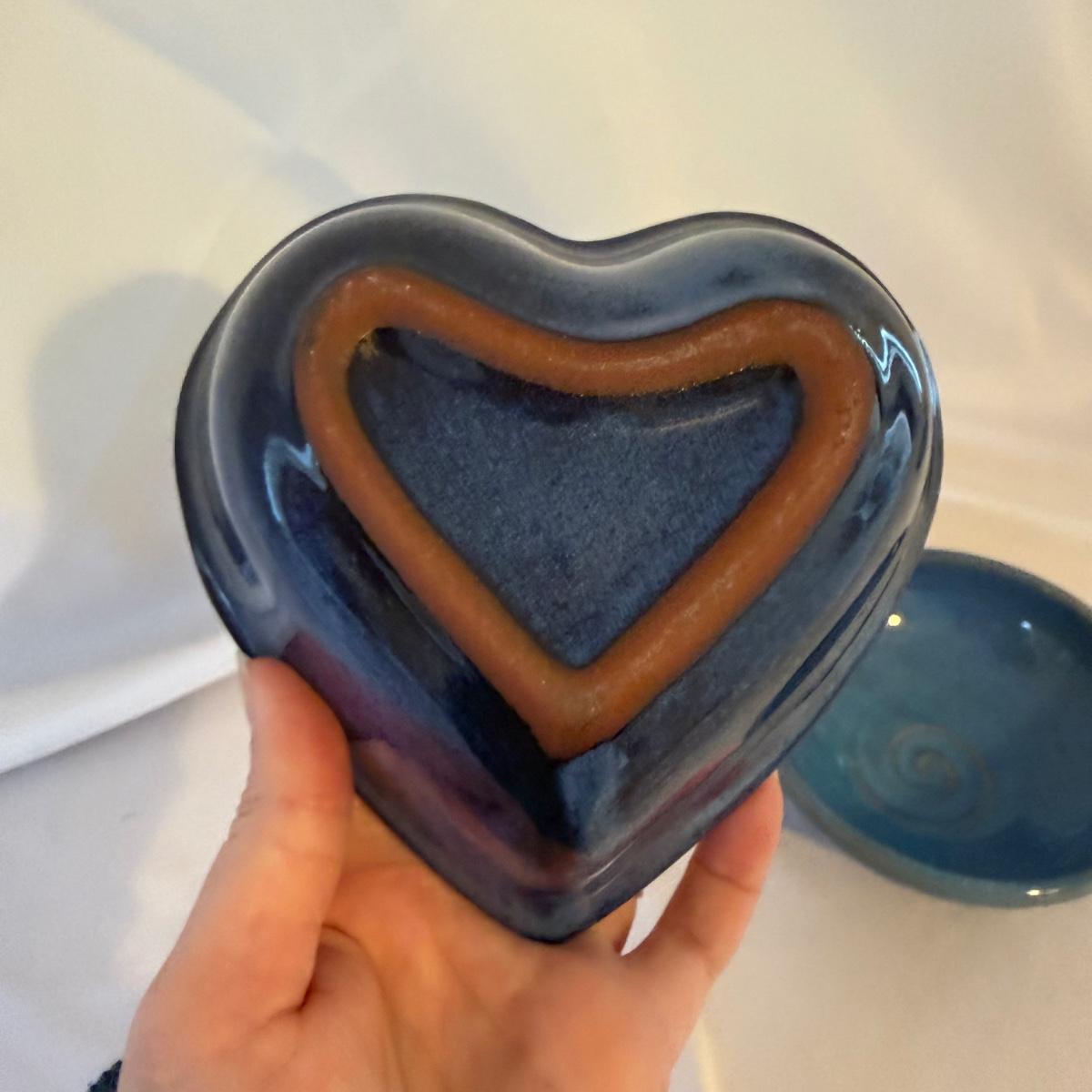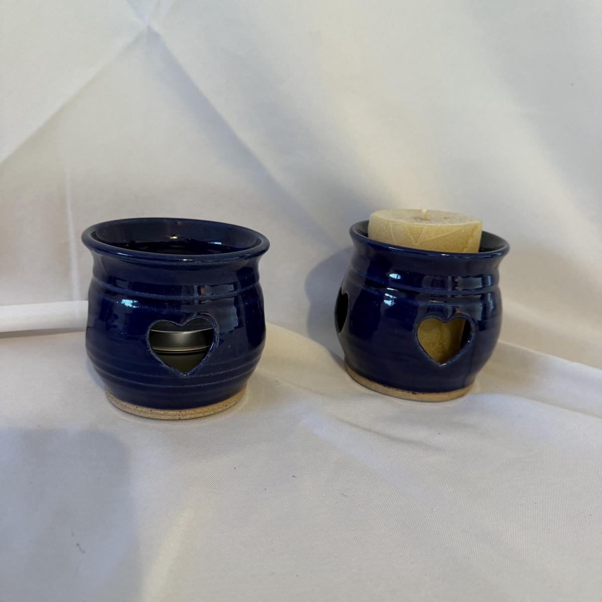 This lot contains eight pieces of blue glazed pottery. Included are two royal blue candle holders with heart shaped windows that both measure 4”D x 3.75”H. A lovely beeswax candle is included. Next are a beautiful blue Remi pot from BB Barns, as well as a cup. There's also a heart shaped candy dish that measures 5.5” x 5” x 2”H. We also have a blue bowl with a fun spiral in the center, signed Martha Nelson (likely local Asheville artist), as well a tiny blue plate with blue flowers. Our last item in this lot is a gorgeous blue spoon rest signed Dotson, indicating artist Tracy Dotson, known for her blue fish scale style designs. Please see pictures for signatures and details.