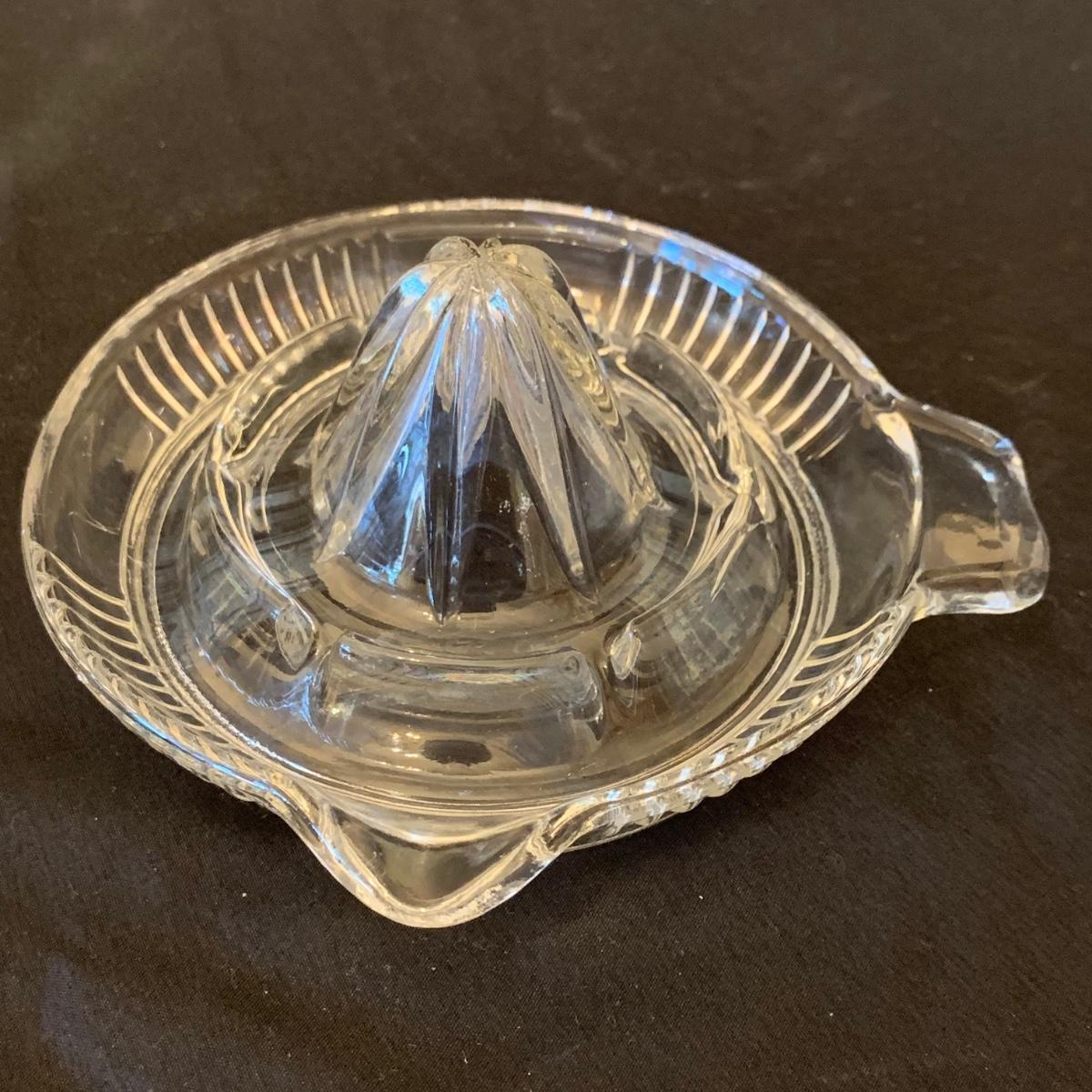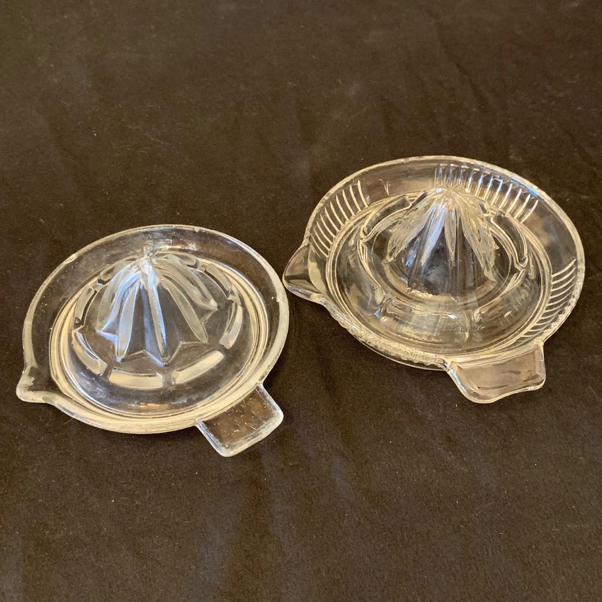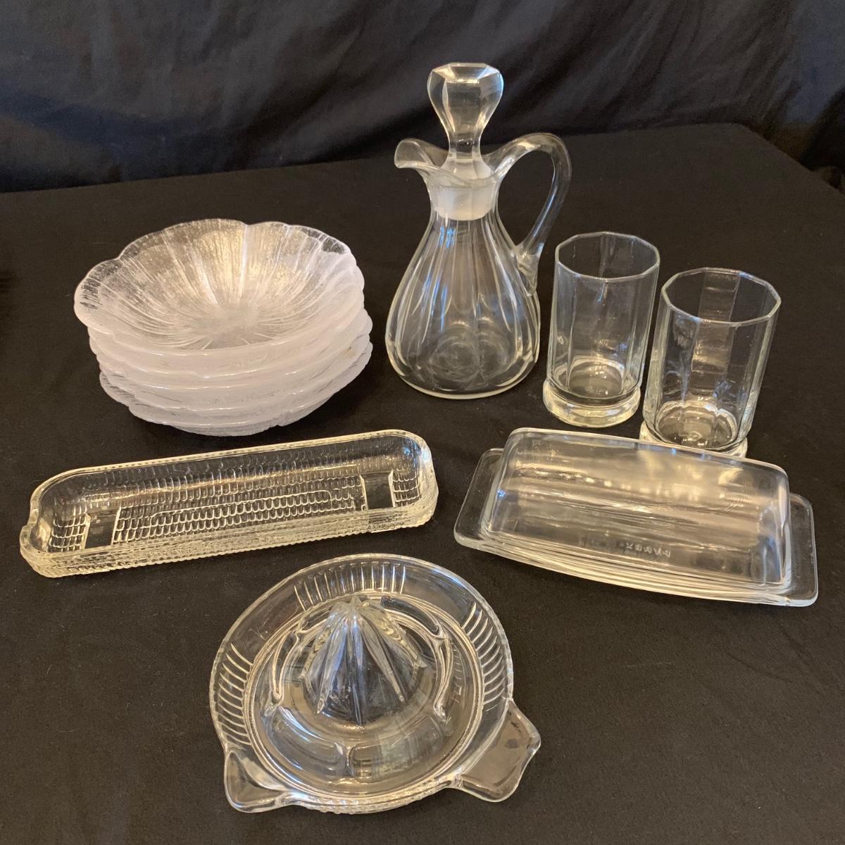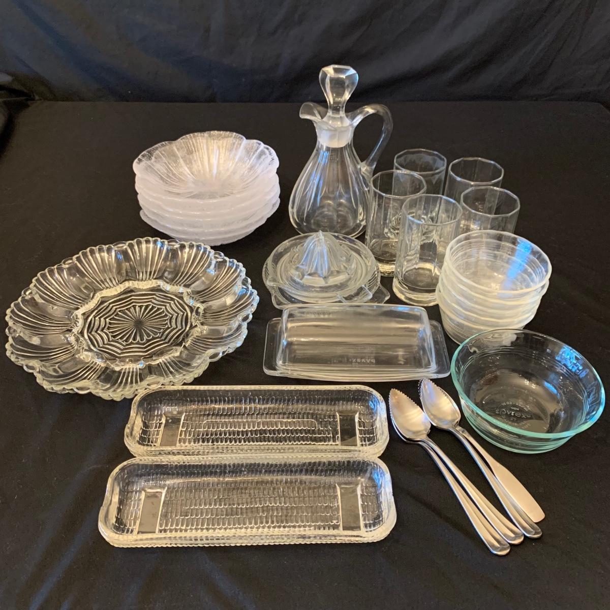This collection of kitchenware includes: a lidded cruet, a set of five salad bowls, a deviled egg plate, two corncob dishes, a Pyrex butter dish, a 10 oz. Pyrex bowl, five 6 oz. Pyrex bowls, five Anchor Hocking juice glasses, and two glass juicer reamers, as well as four grapefruit spoons. The deviled egg dish is 10”D. Most items are in good condition. A few small chips are found on a corncob dish and a juicer reamer, and some areas of cloudiness and/or small scratches are seen on a few of the other items from being used.