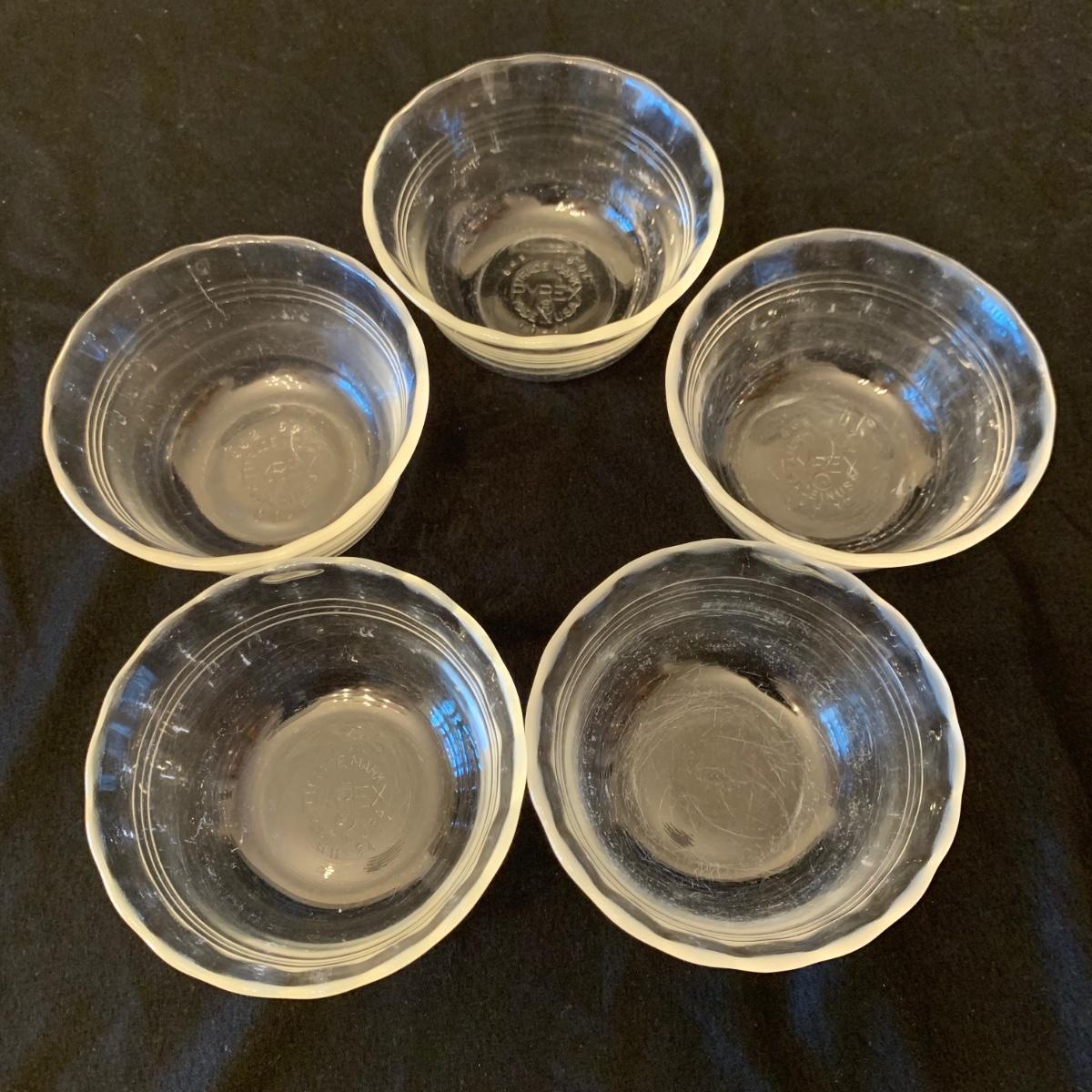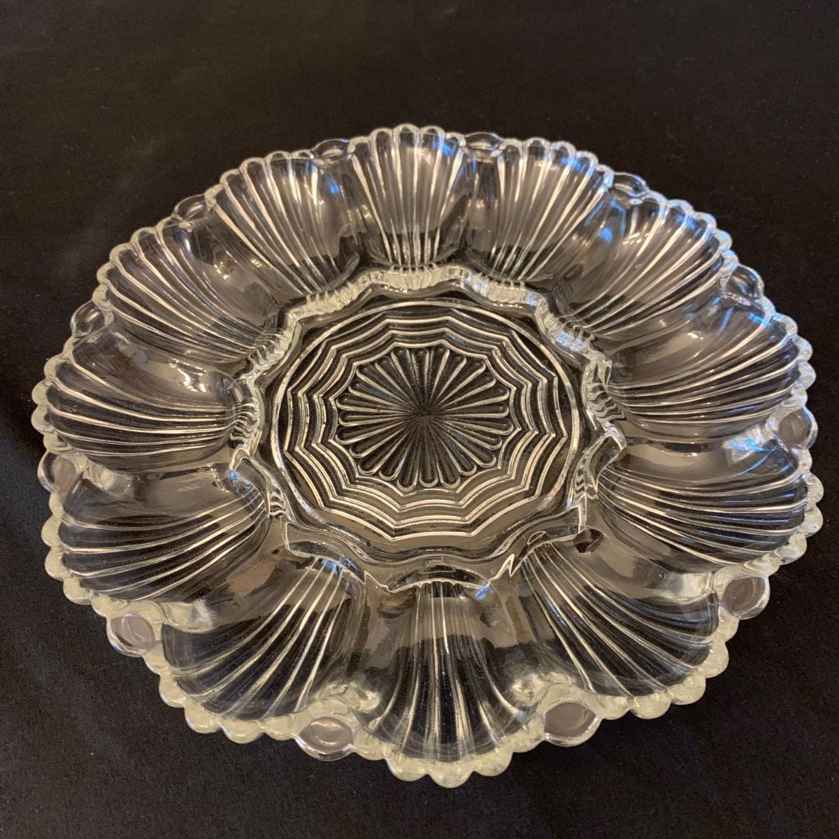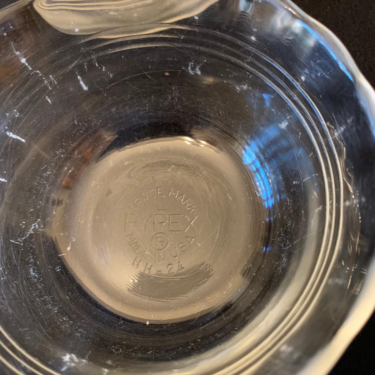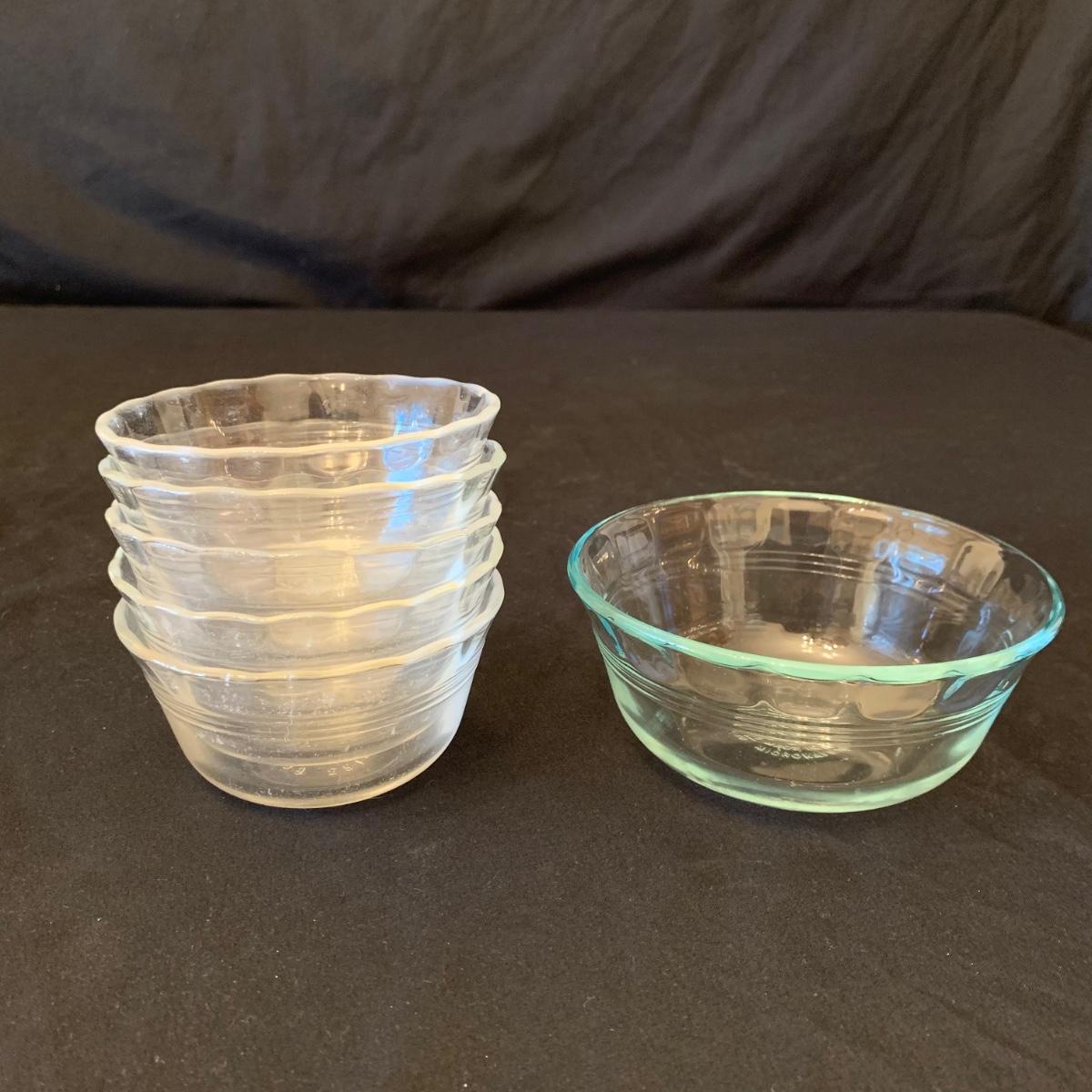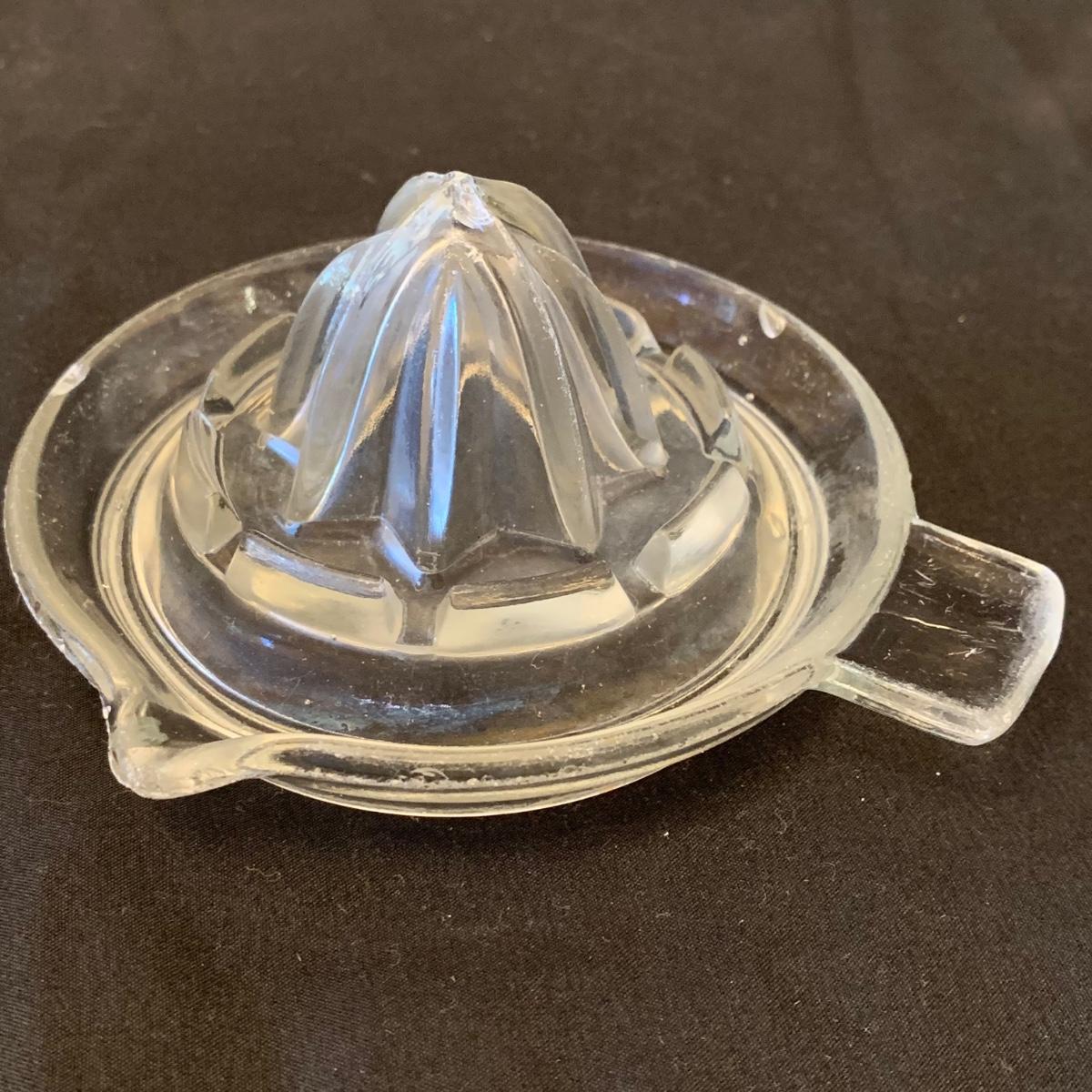 This collection of kitchenware includes: a lidded cruet, a set of five salad bowls, a deviled egg plate, two corncob dishes, a Pyrex butter dish, a 10 oz. Pyrex bowl, five 6 oz. Pyrex bowls, five Anchor Hocking juice glasses, and two glass juicer reamers, as well as four grapefruit spoons. The deviled egg dish is 10”D. Most items are in good condition. A few small chips are found on a corncob dish and a juicer reamer, and some areas of cloudiness and/or small scratches are seen on a few of the other items from being used.