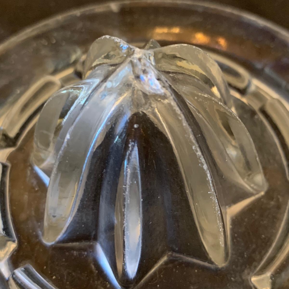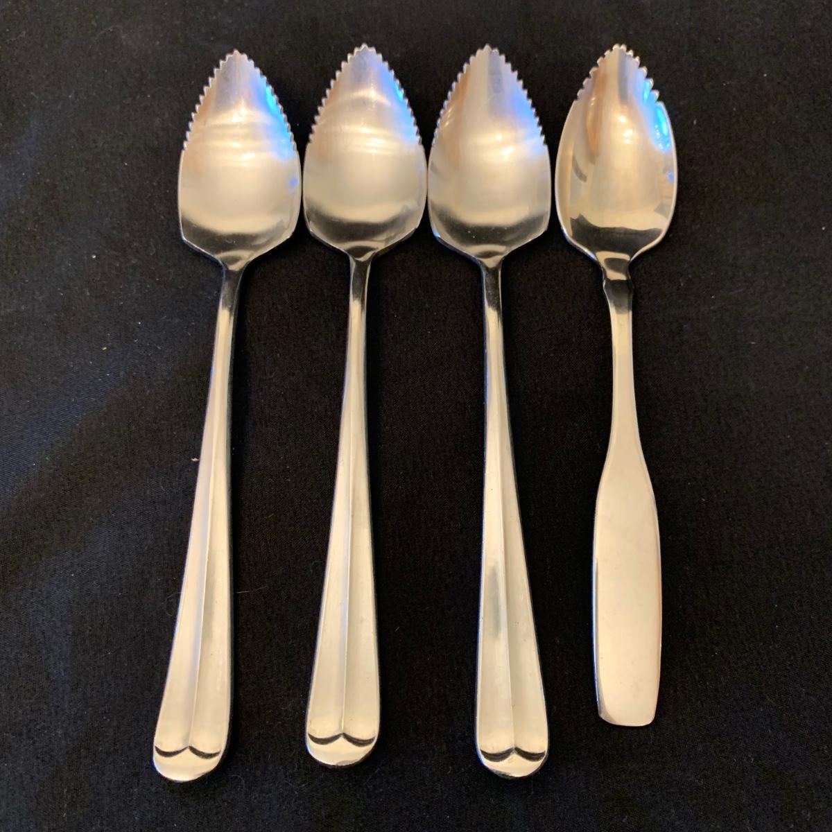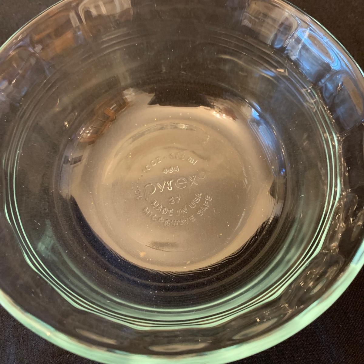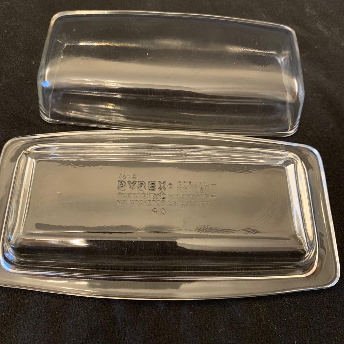This collection of kitchenware includes: a lidded cruet, a set of five salad bowls, a deviled egg plate, two corncob dishes, a Pyrex butter dish, a 10 oz. Pyrex bowl, five 6 oz. Pyrex bowls, five Anchor Hocking juice glasses, and two glass juicer reamers, as well as four grapefruit spoons. The deviled egg dish is 10”D. Most items are in good condition. A few small chips are found on a corncob dish and a juicer reamer, and some areas of cloudiness and/or small scratches are seen on a few of the other items from being used.