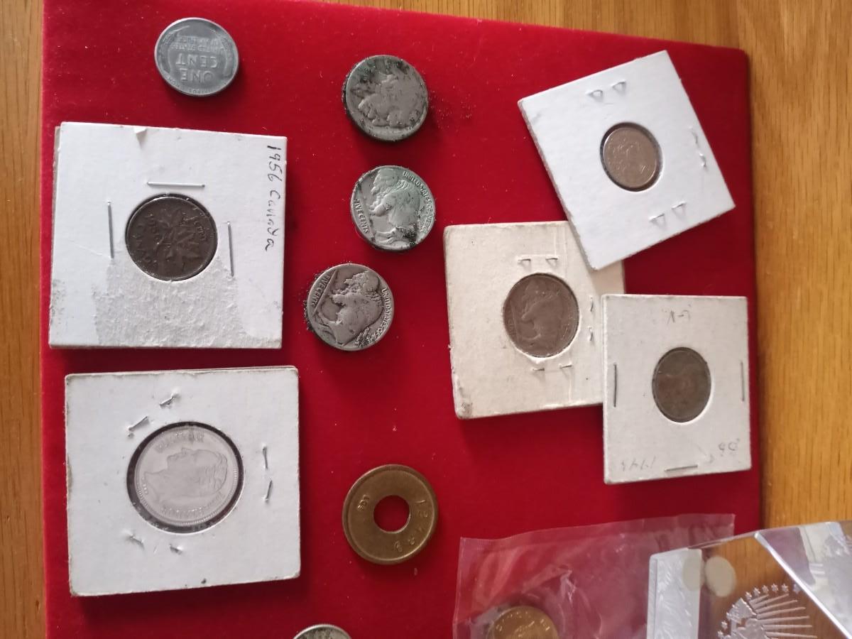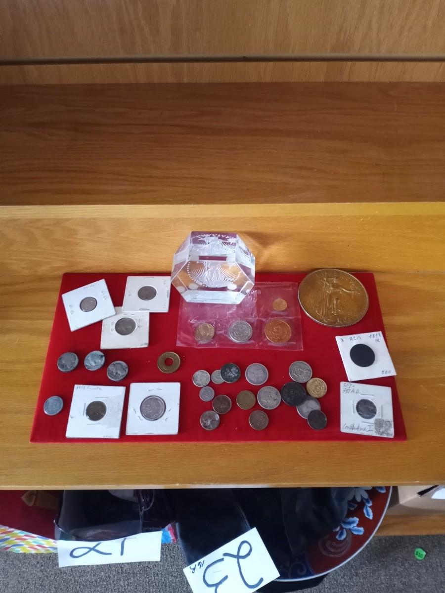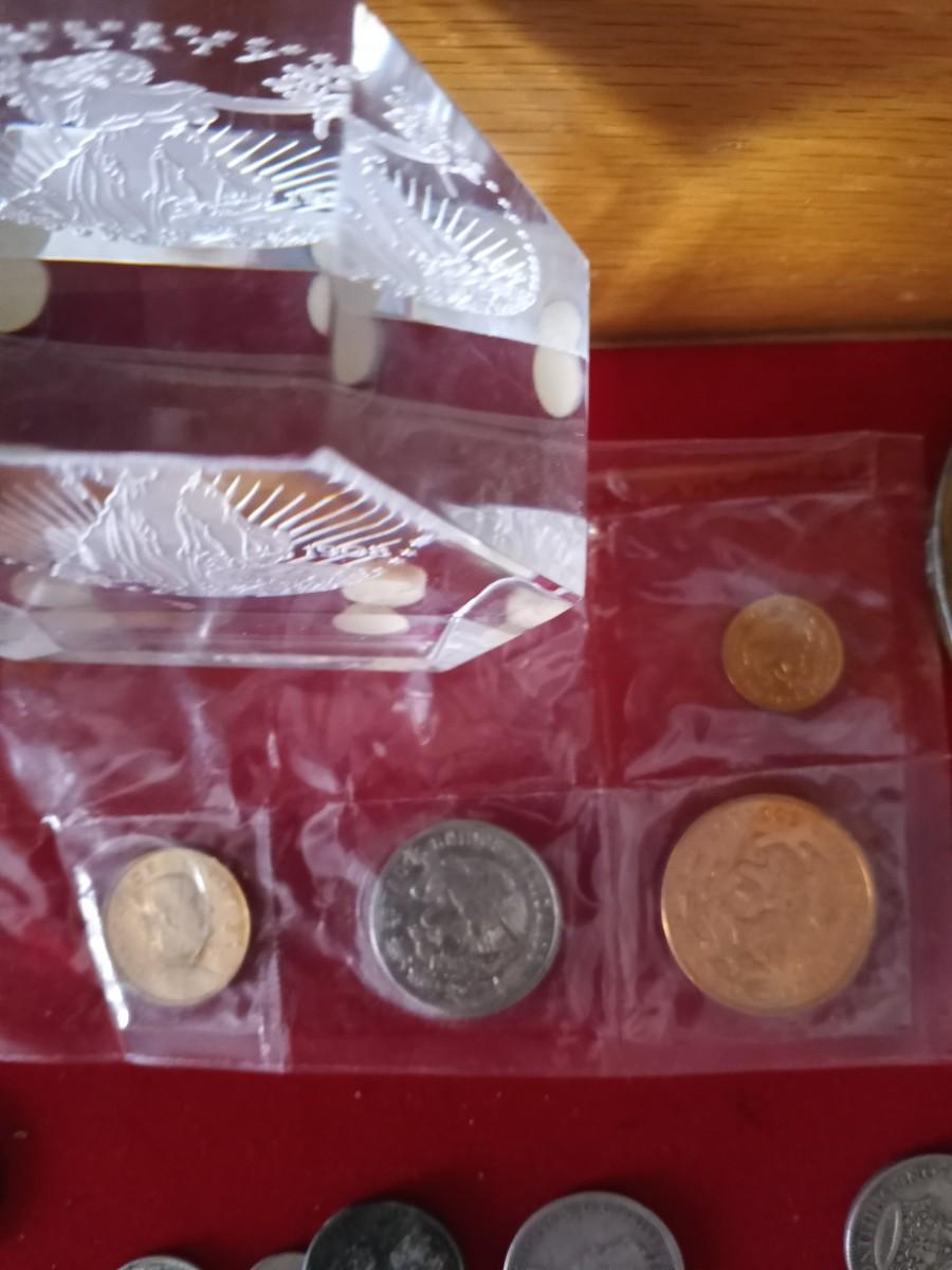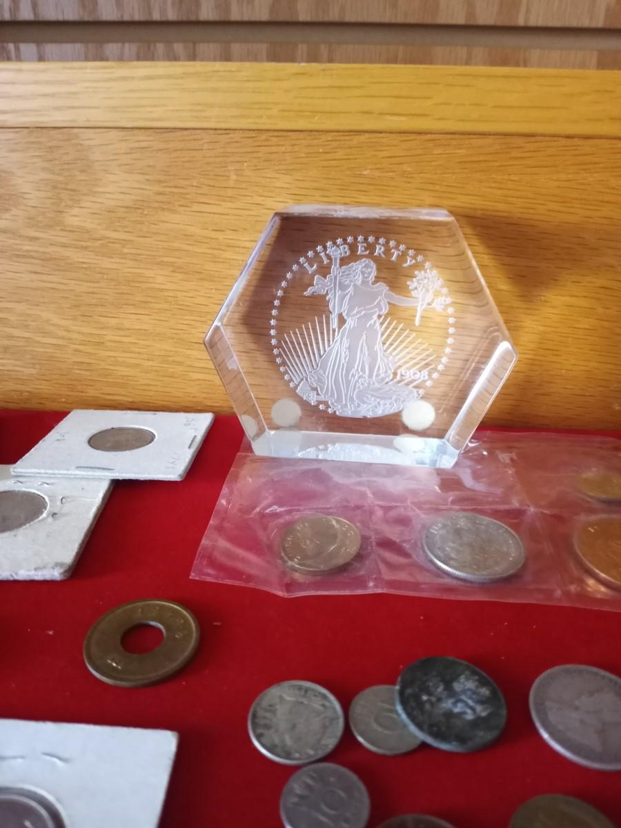 VARIETY OF COLLECTIBLE COINS AND ENGRAVED GLASS DECOR PAPERWEIGHT