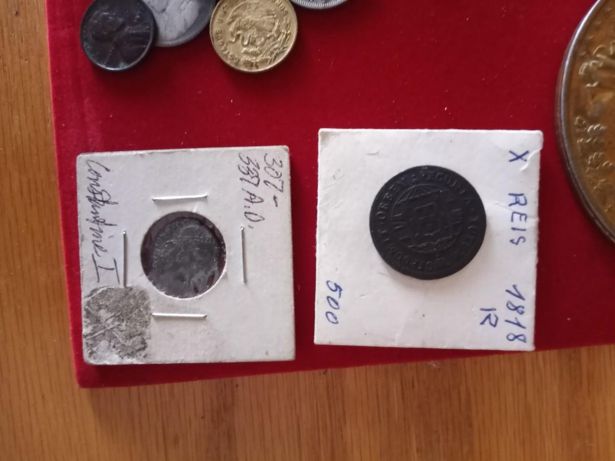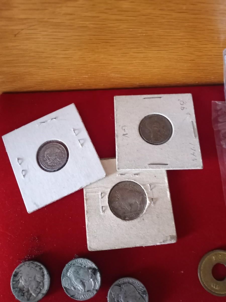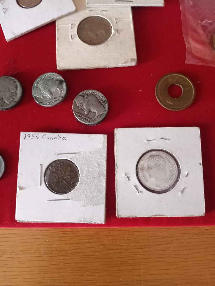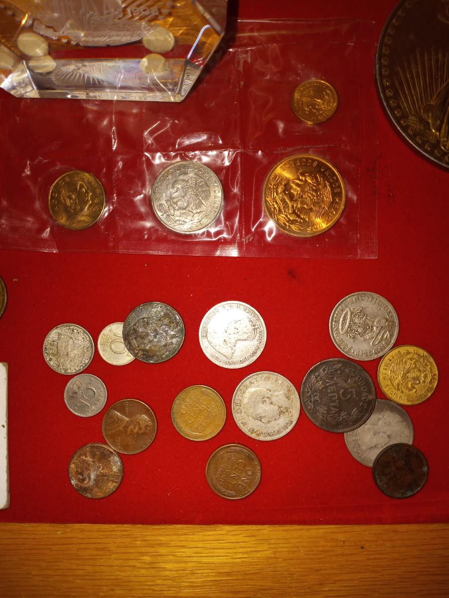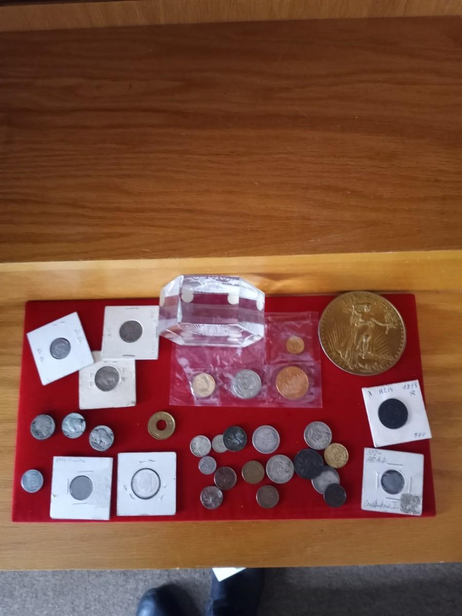 VARIETY OF COLLECTIBLE COINS AND ENGRAVED GLASS DECOR PAPERWEIGHT