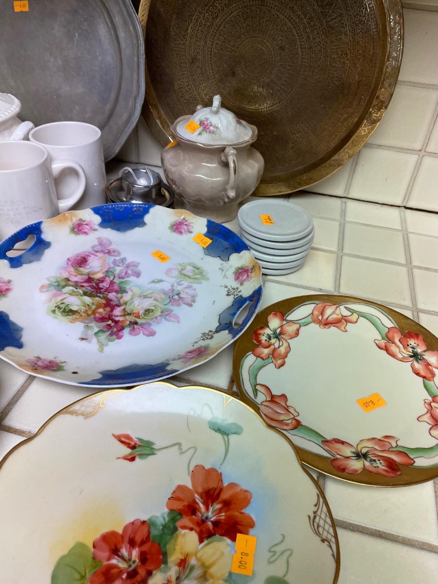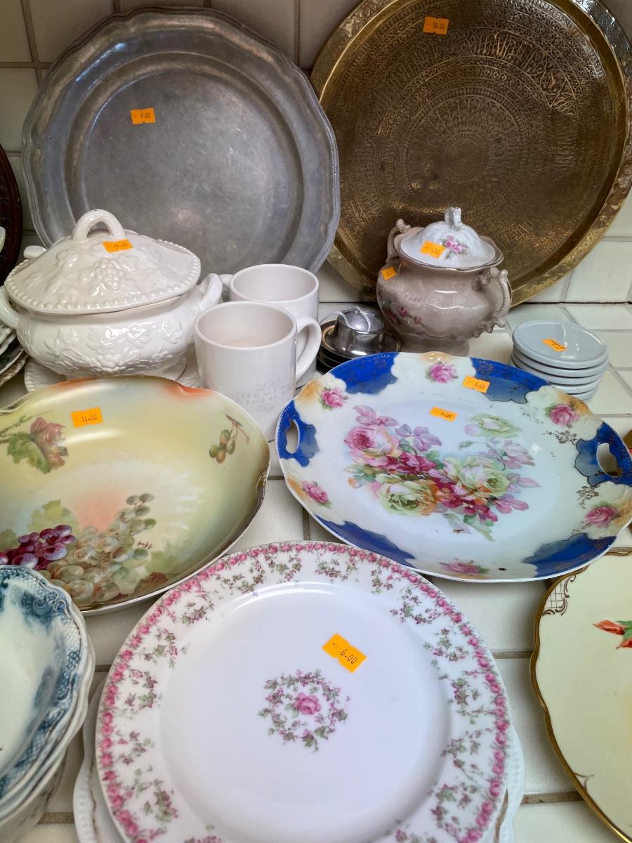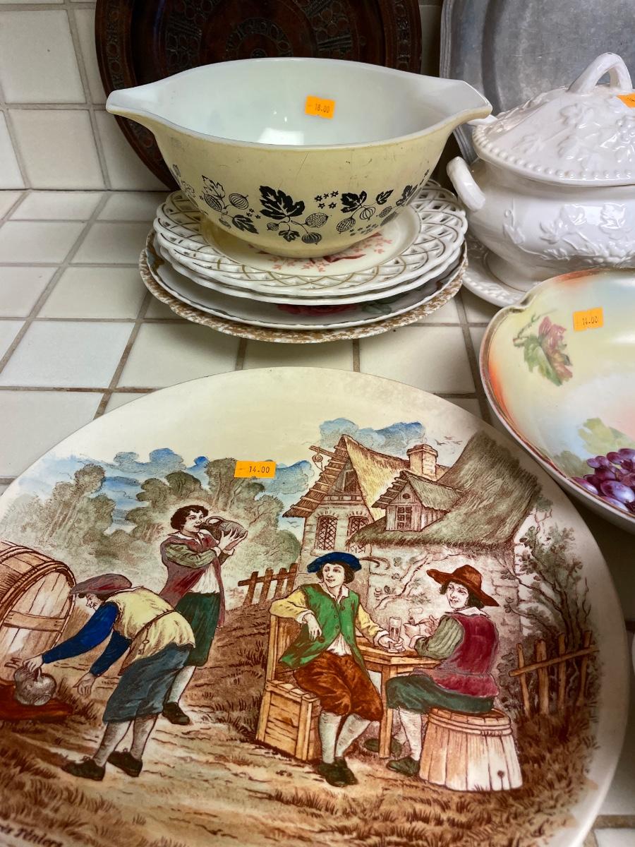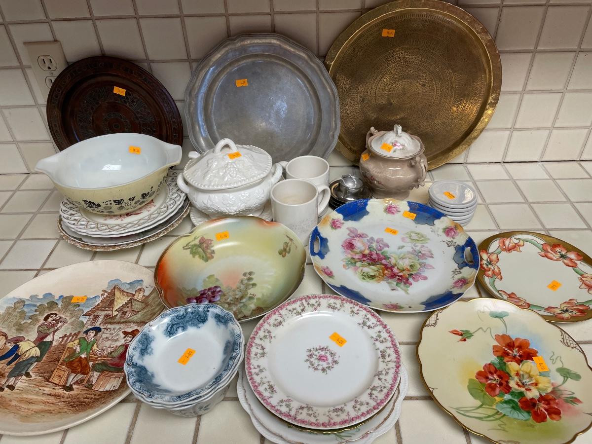 Variety of dishware, including Pyrex, brass platter and decorative plates