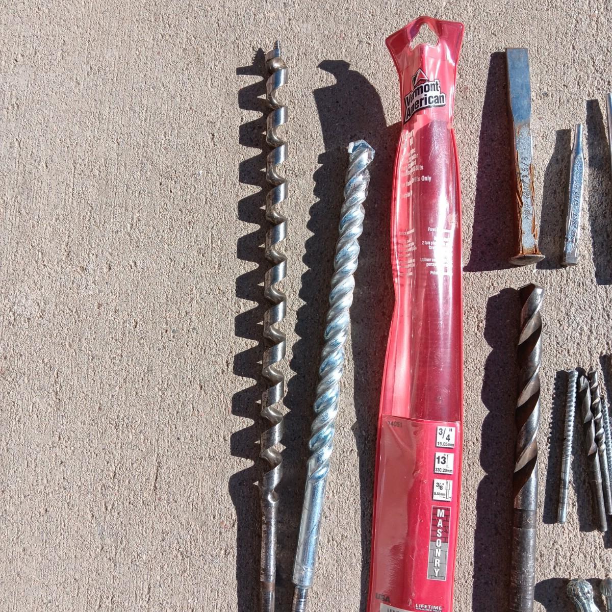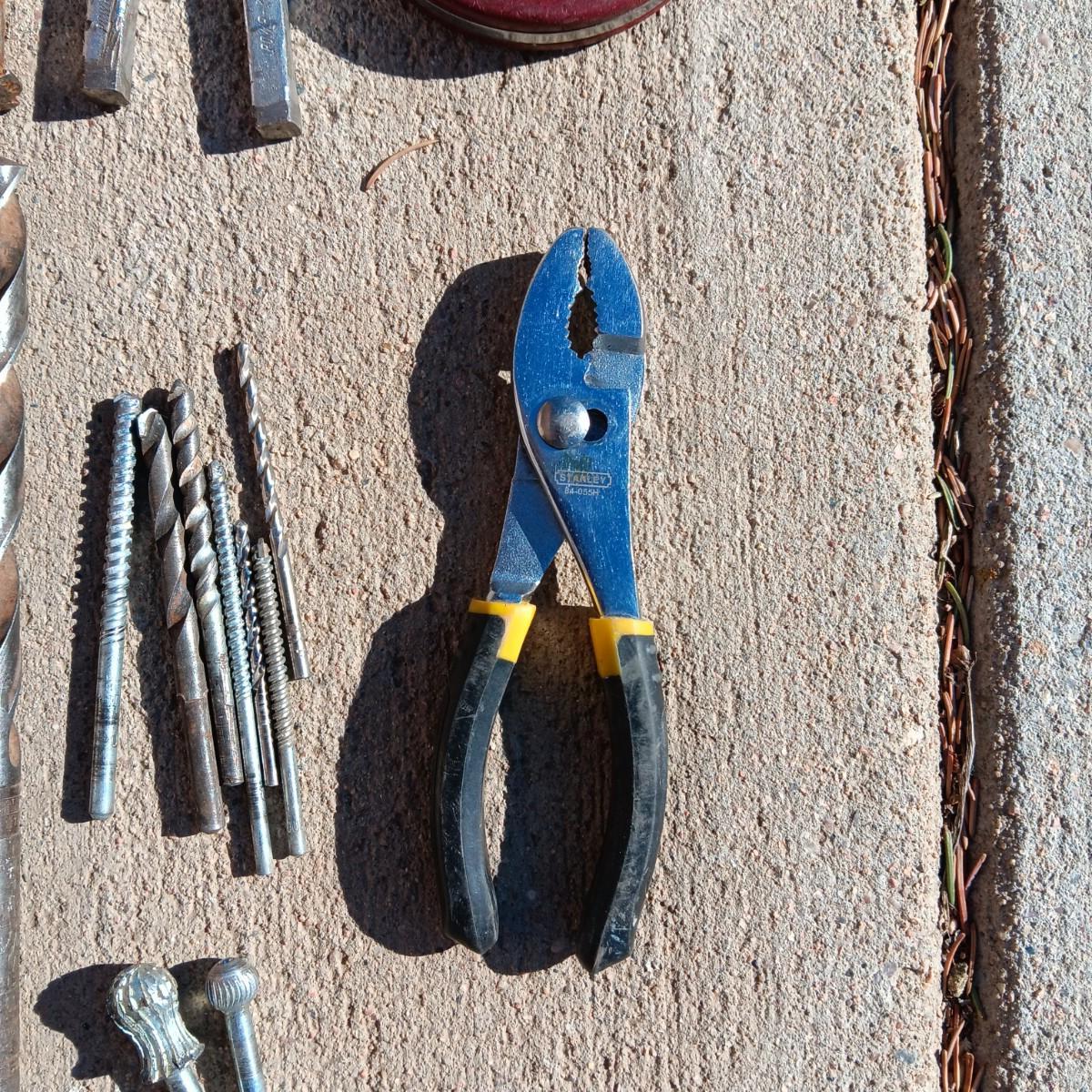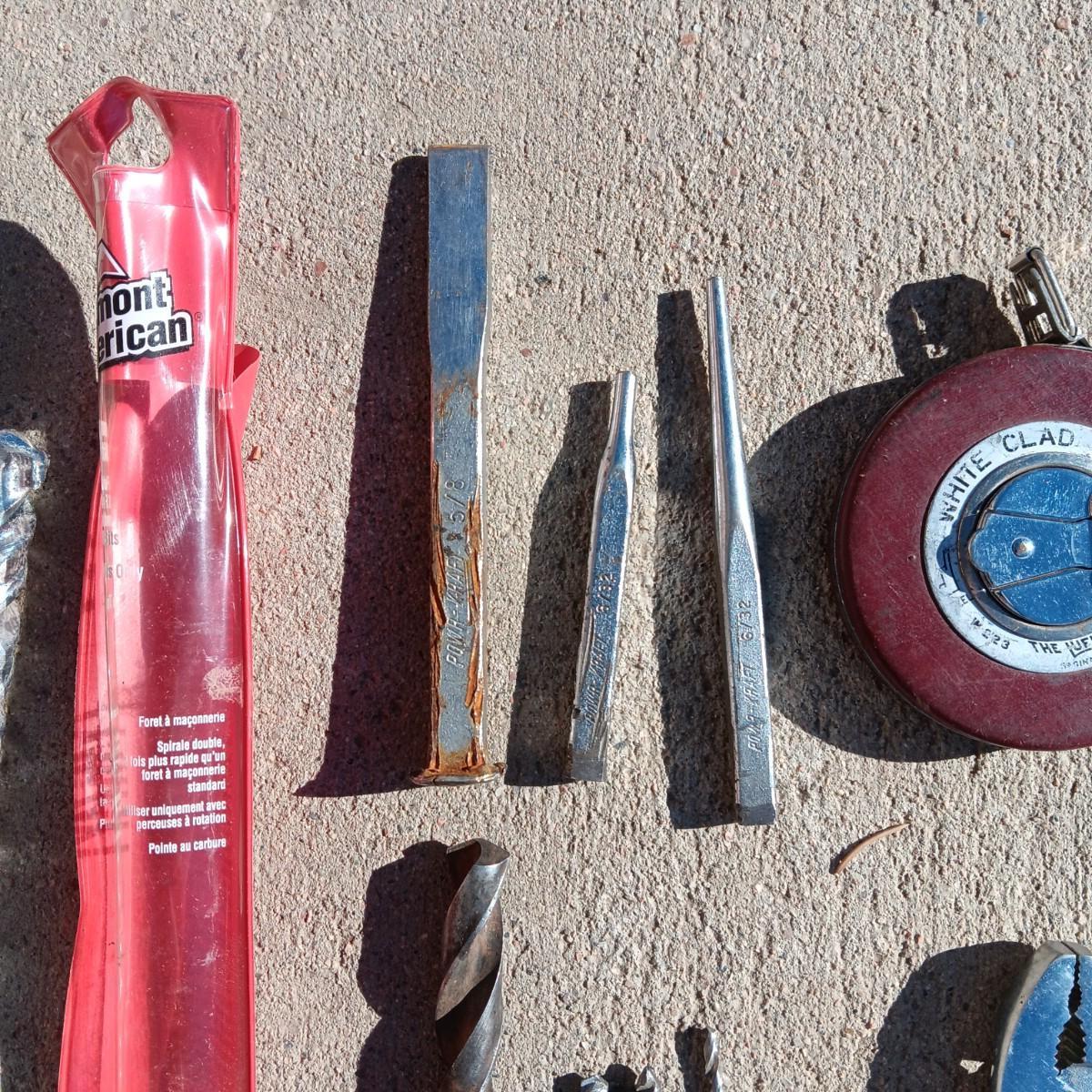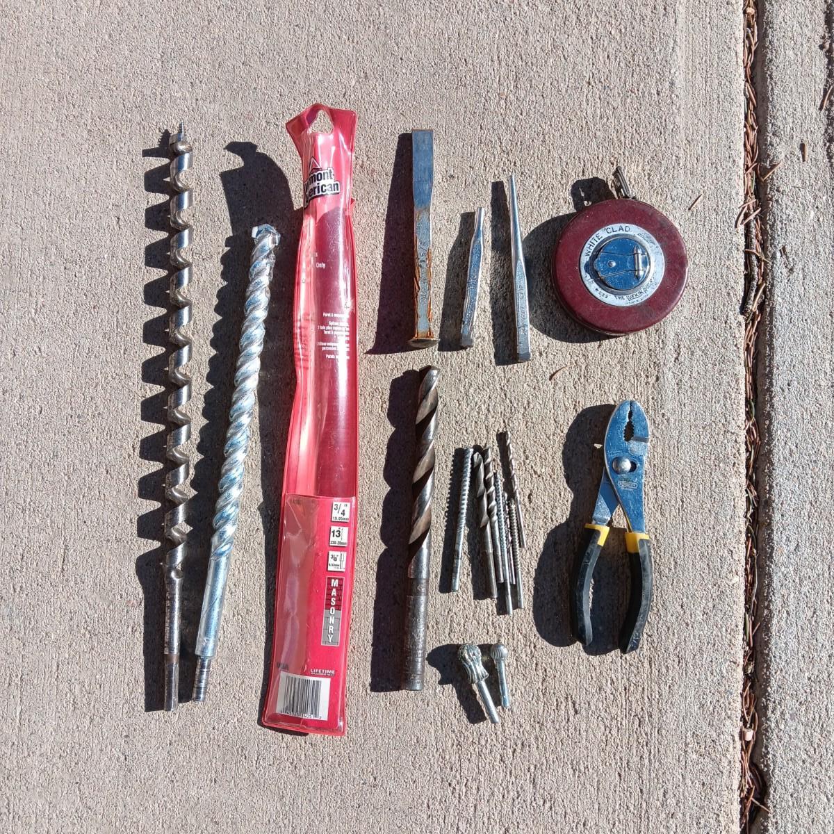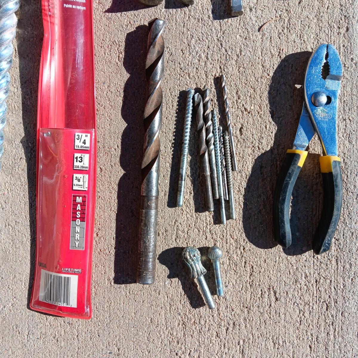 VARIETY OF DRILL BITS, TAPE MEASURE, PLIERS, AWLS AND MORE