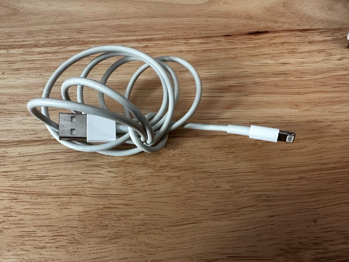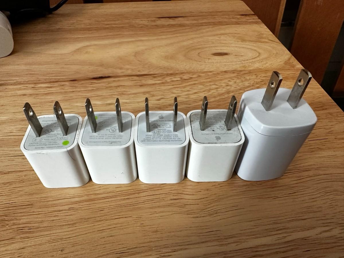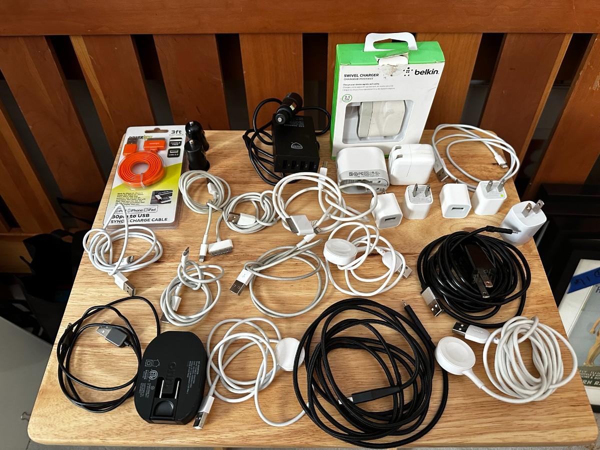 Assortment of USB cubes, car charger adapters, iphone cords, iwatch chargers