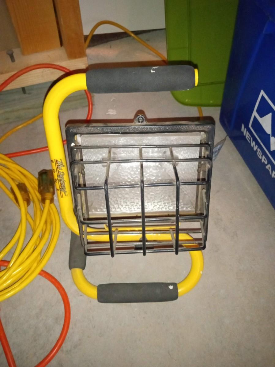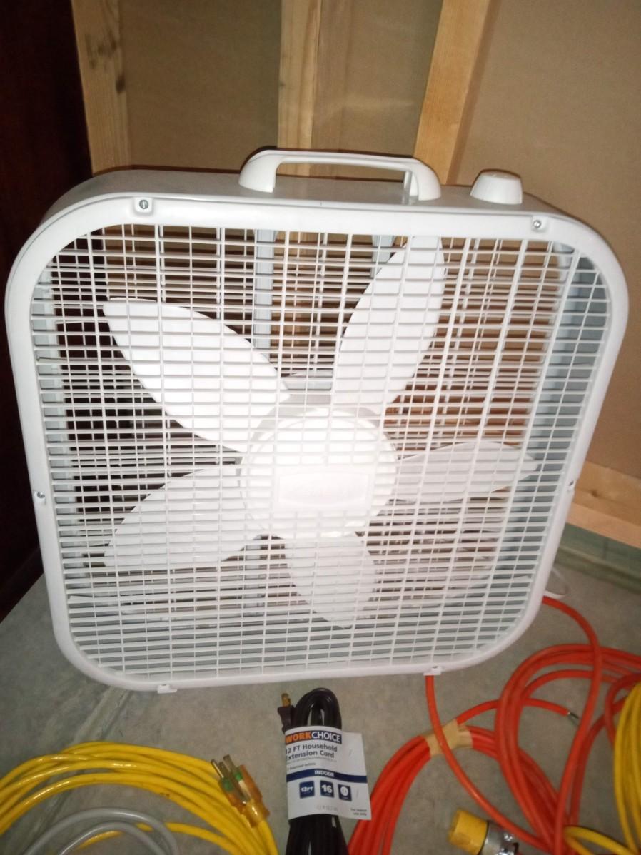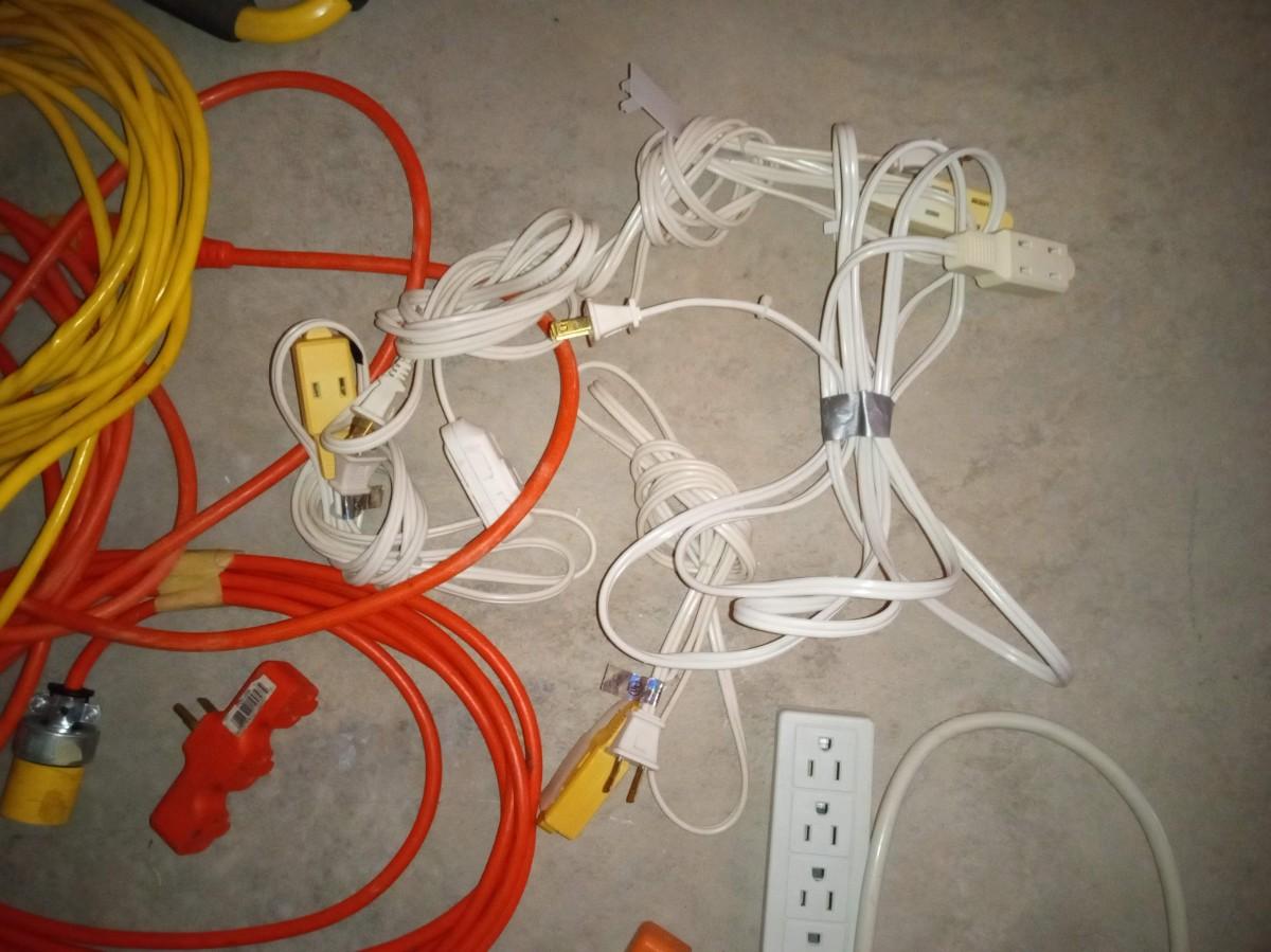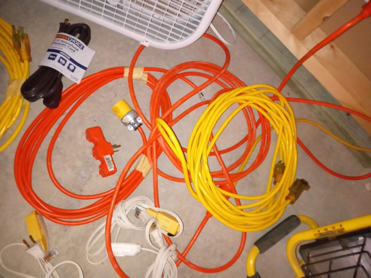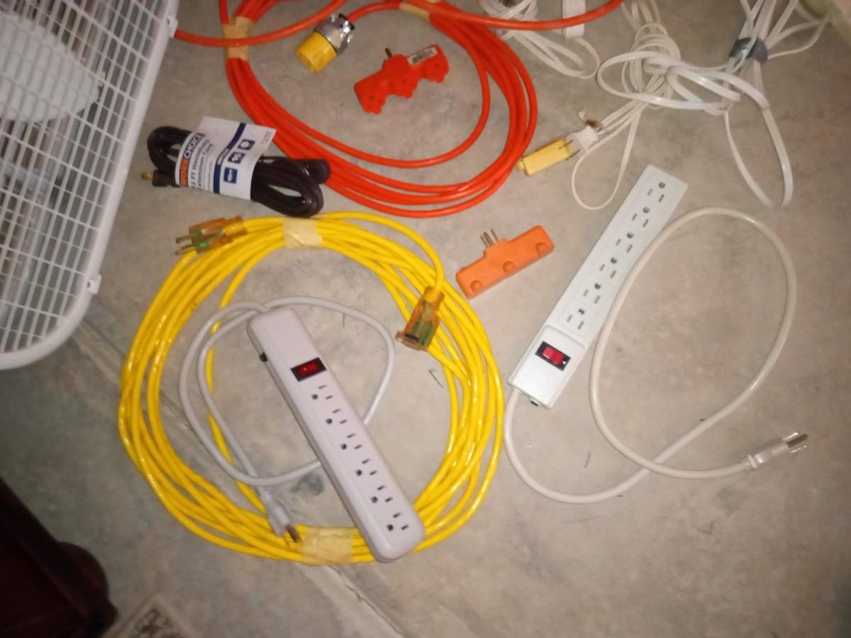 VARIETY OF EXTENSION CORDS, BOX FAN, SURGE BOXES AND HALOGEN WORK LIGHT