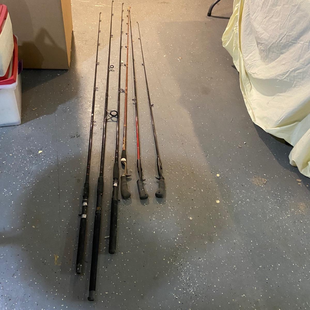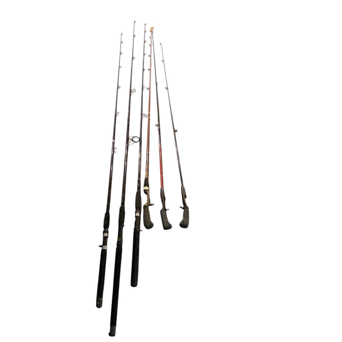 In this lot is a total of six different fishing poles. The first is a ‘Ted Williams’ “Professorial Model” fishing pole that is 72” long. The second is a ‘Shakespeare’ “Patriot” fishing rod measuring 72” long. The third is an ‘Abu Garcia’ “Conolon 200” and measures 96.5”, this is the longest pole in the lot. The fourth is a “Roughneck” by ‘Berkley Taiwan’. This one expands and contrasts at its longest it’s 85.5” and shortest is 72”. The fifth pole is another ‘Berkley’ “Roughneck”. The last rod is the shortest, it’s an ‘Abu Garcia’ “400 Balanced Action” measuring 65.5”. Shipping available.