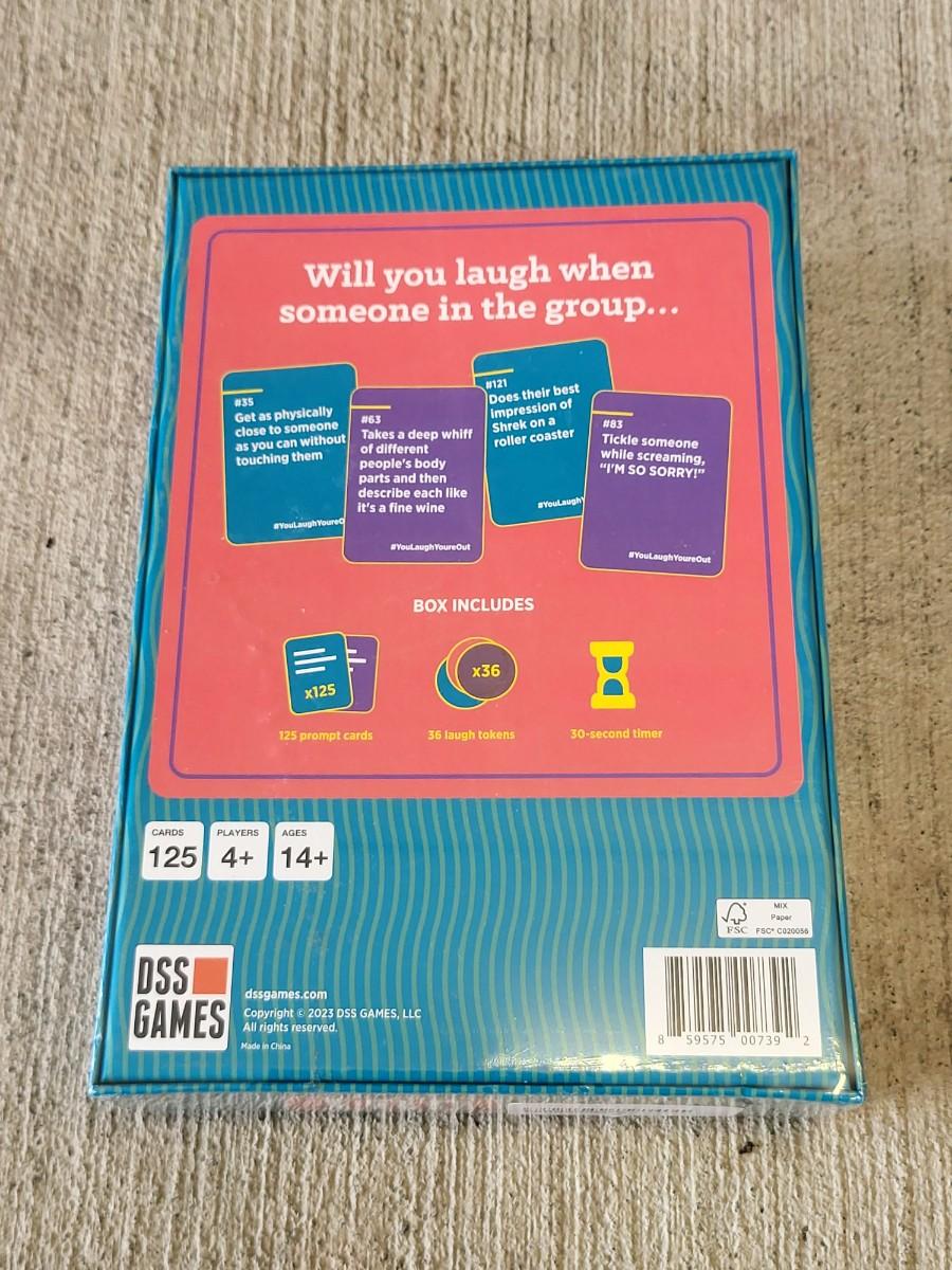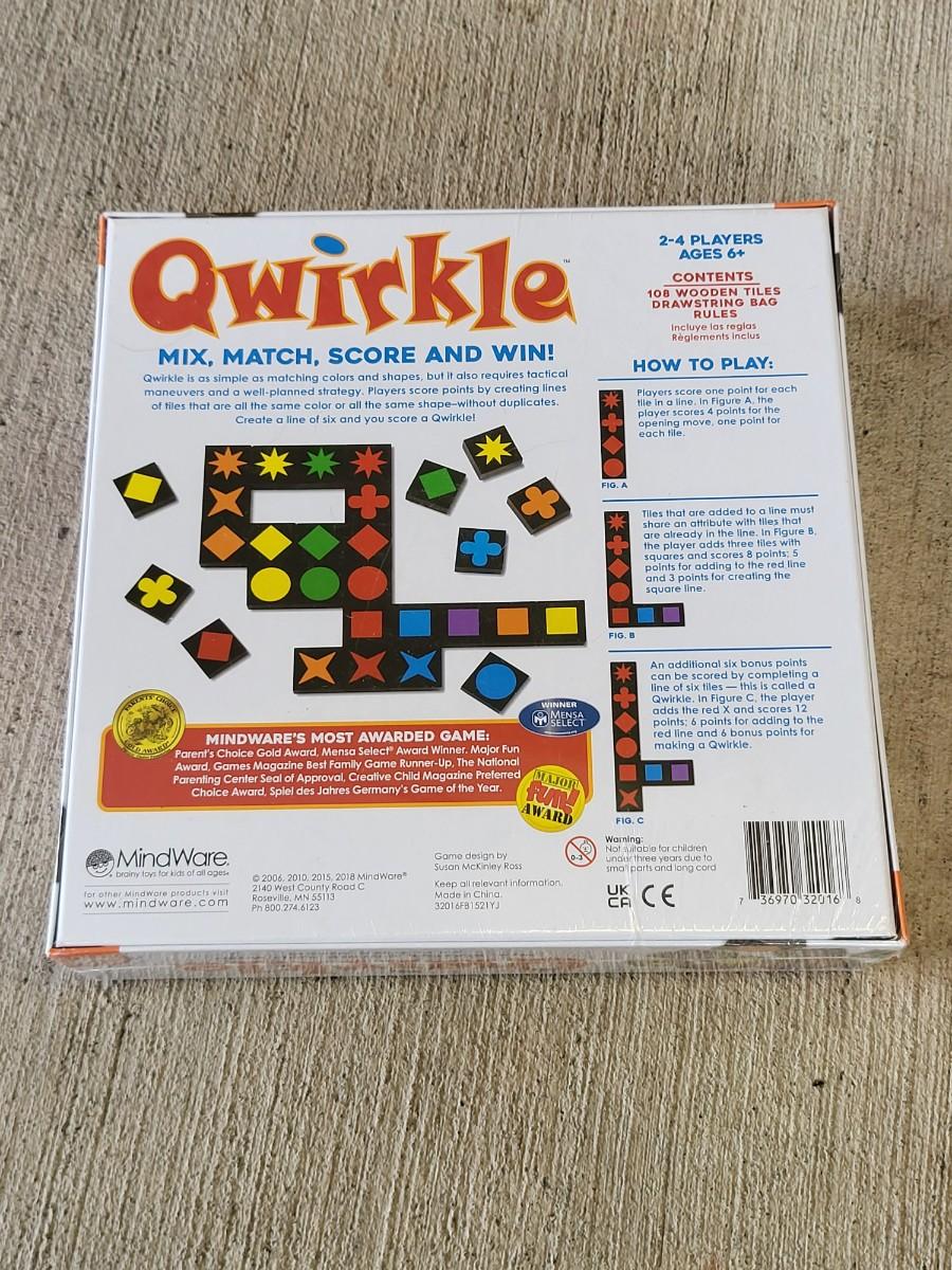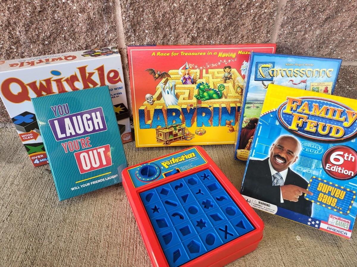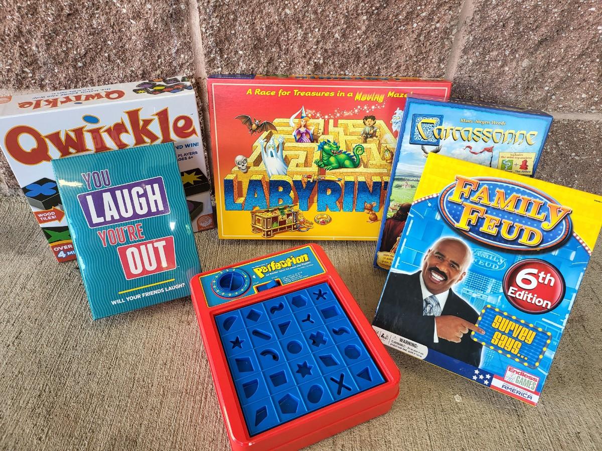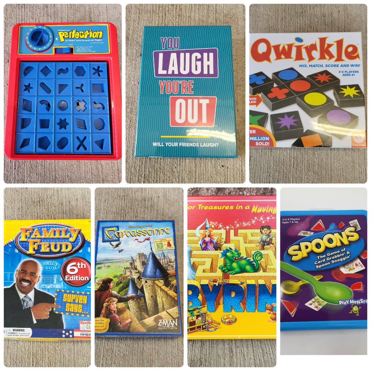 Qwirkle, You Laugh You're Out, and Spoons have never been opened. The other games are Labyrinth, Perfection, Family Feud, and Carcassonne.