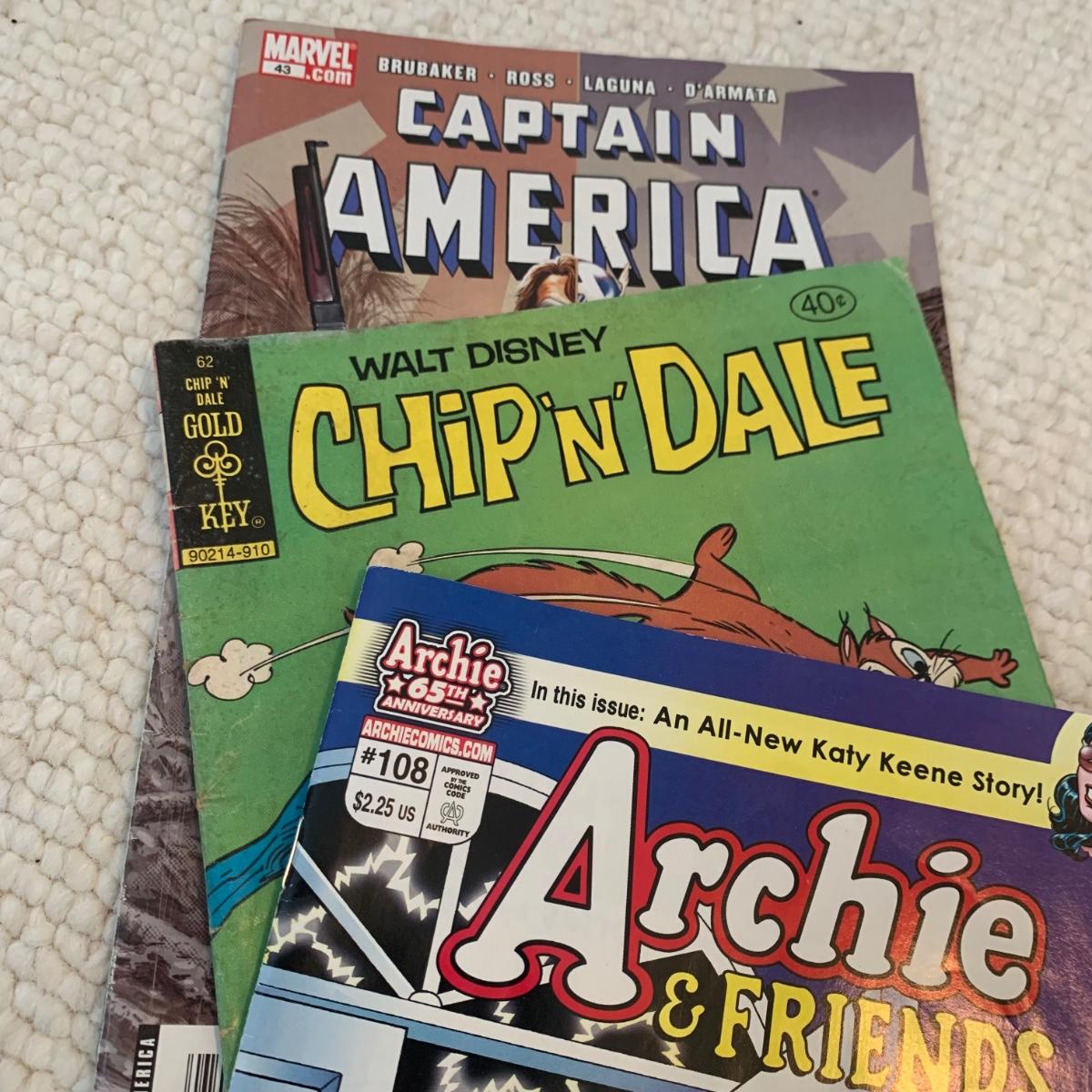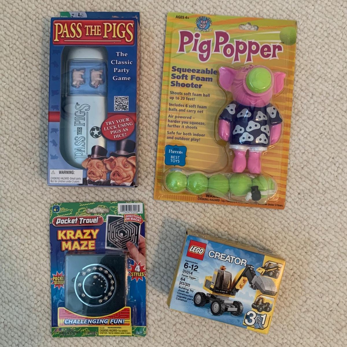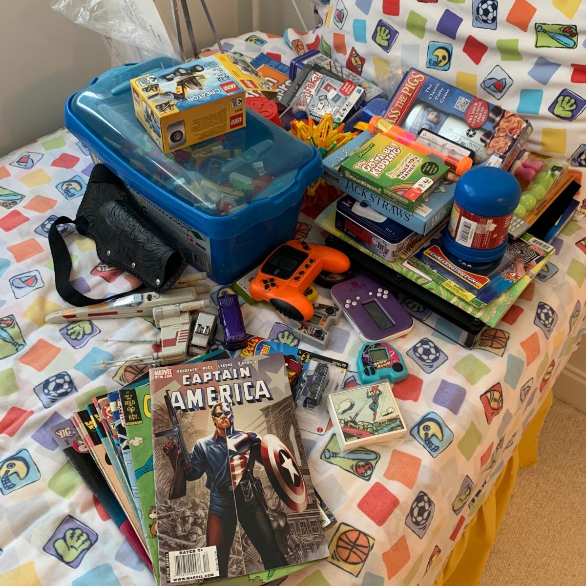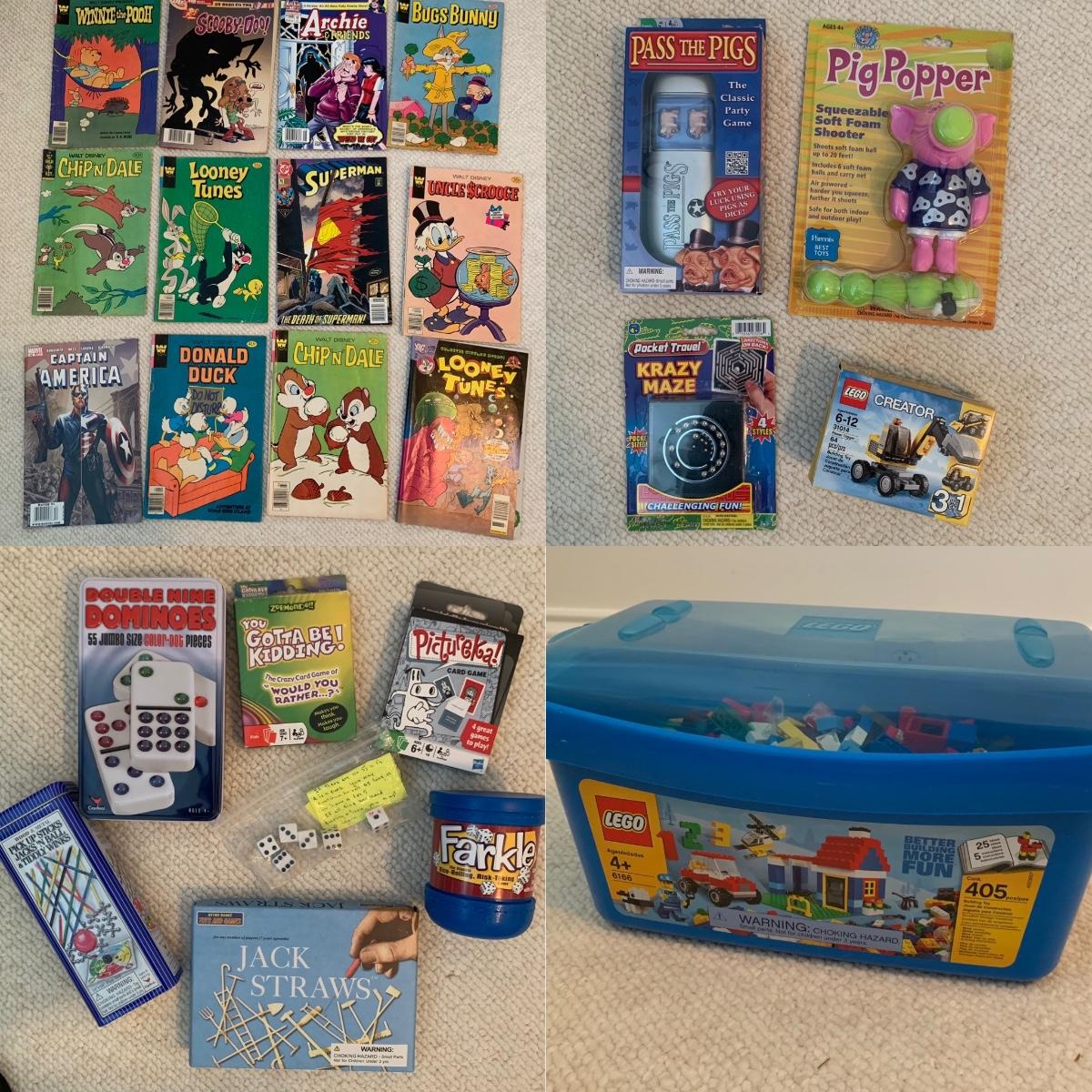 Big variety of toys and games for the older kids. There are a handful of comic books, as well as unopened toys, games, legos, and much more! Please see photos for inventory and details.