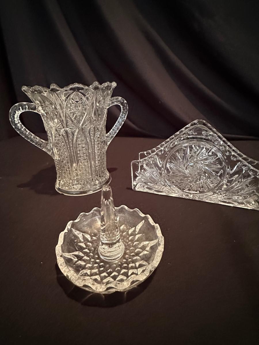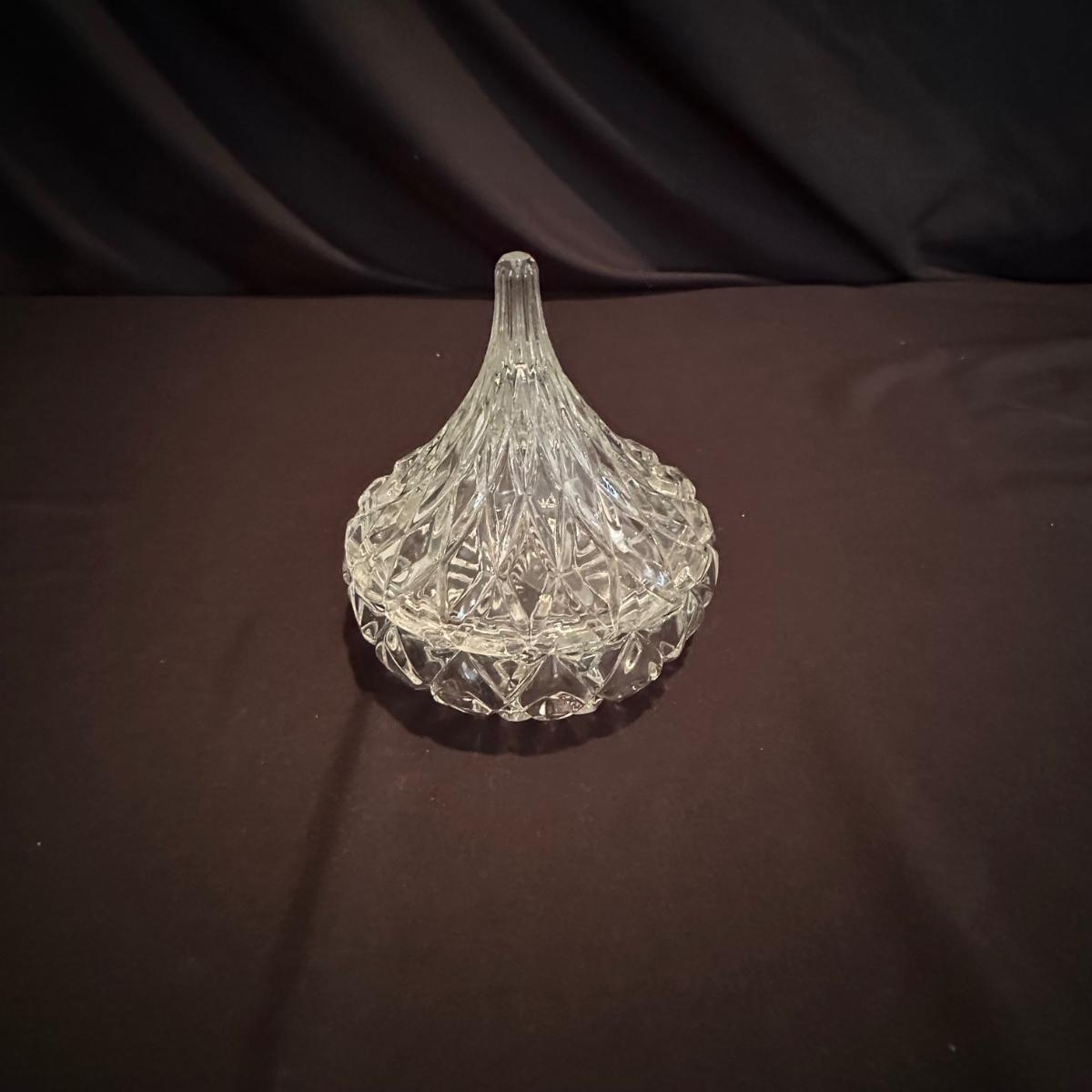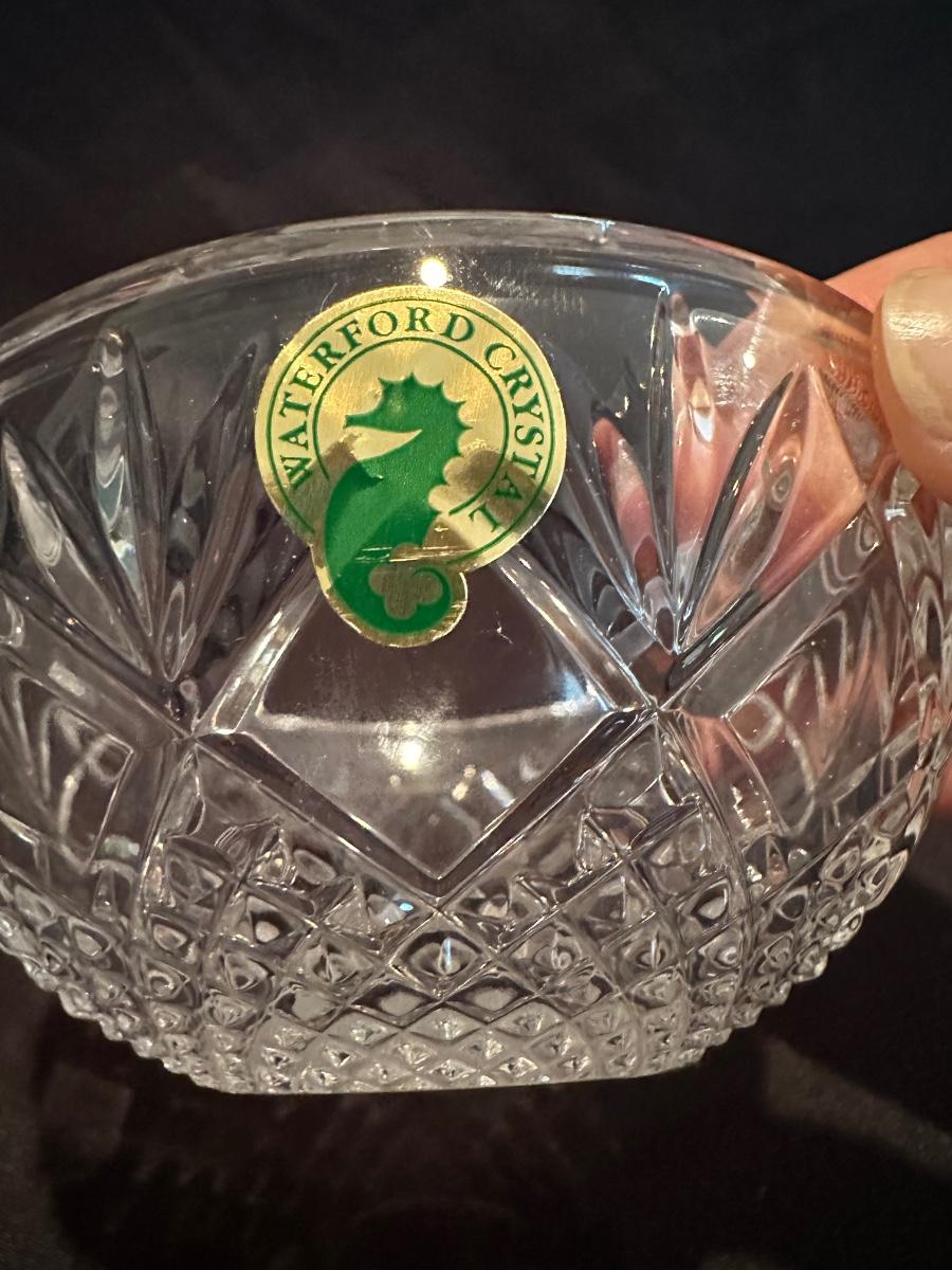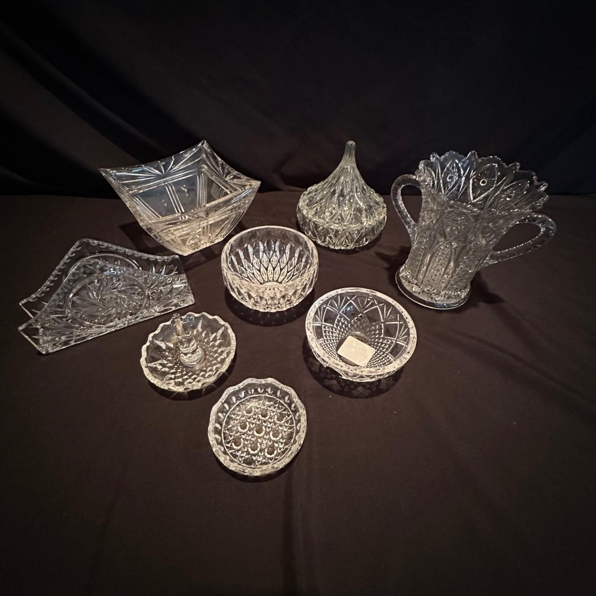 An eclectic combination of Waterford glass, vintage Hershey Kiss cut glass candy dish with lid, two additional glass bowls, a ring holder, napkin stand and flower vase.