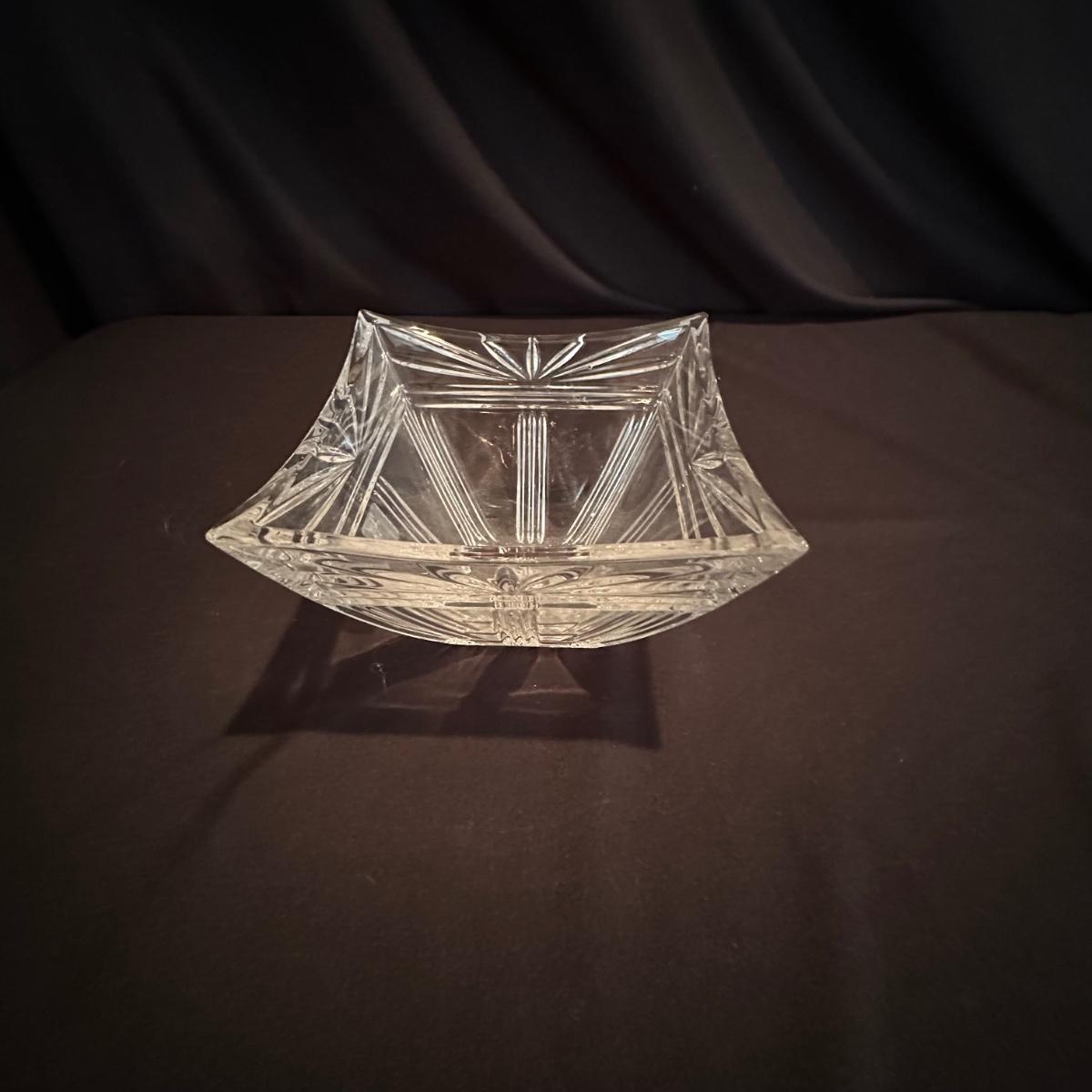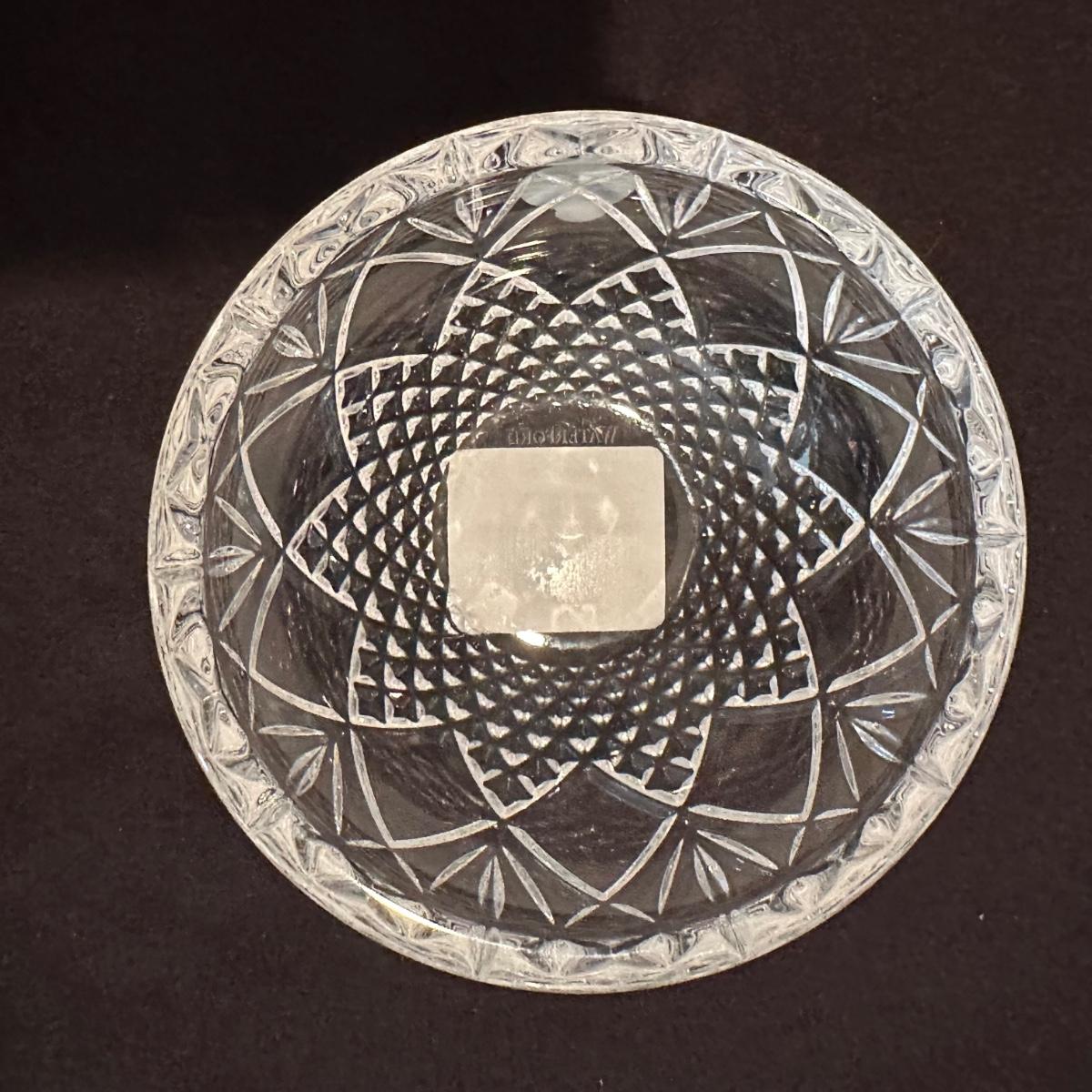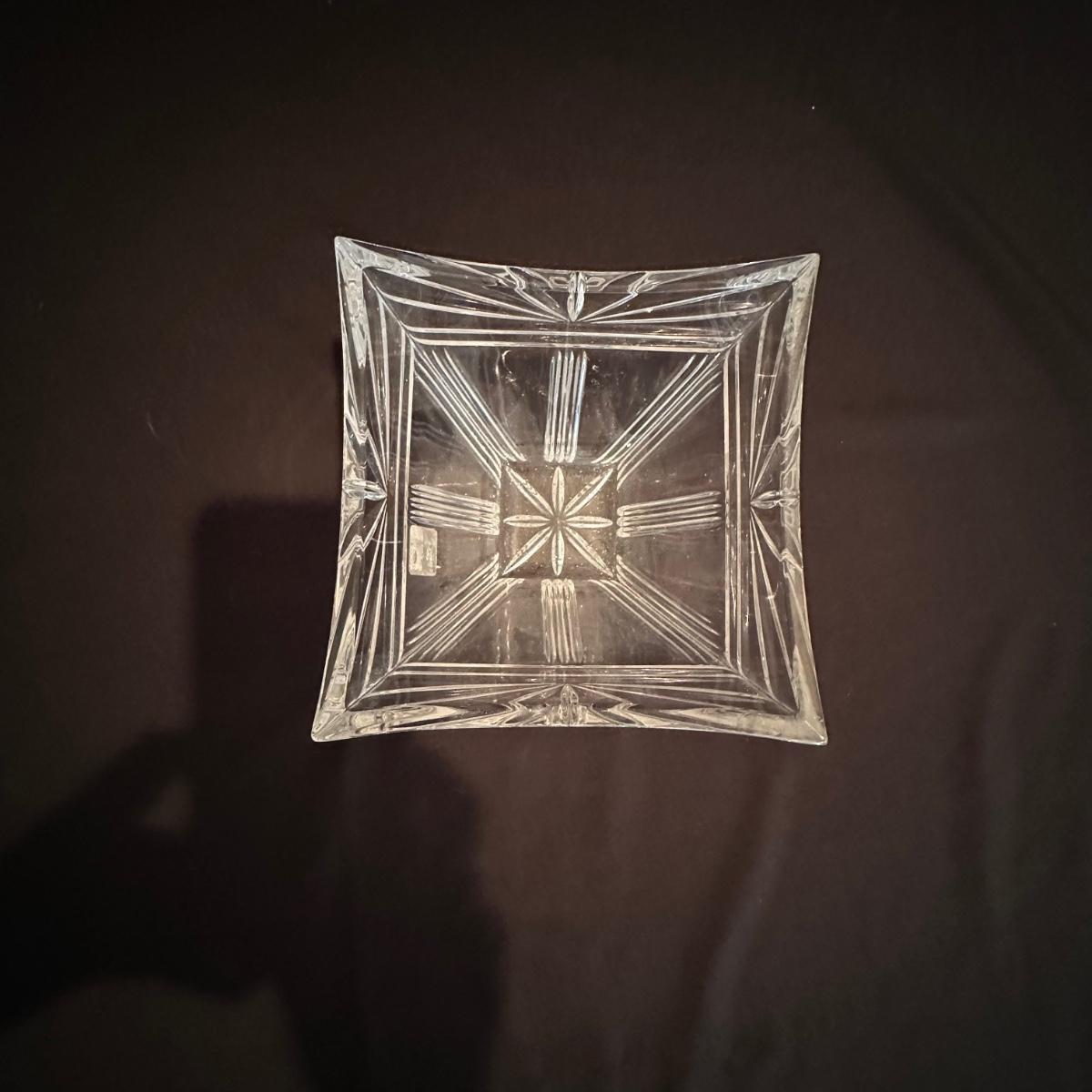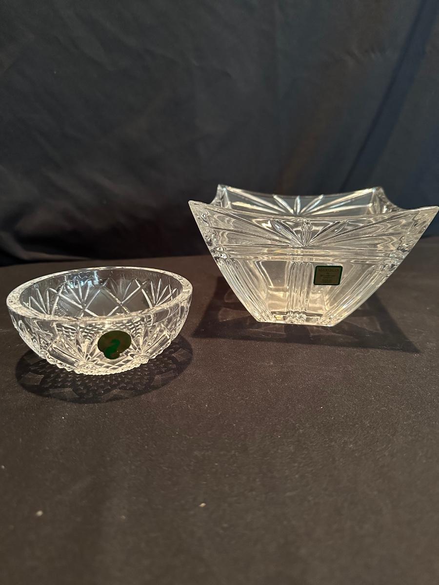 An eclectic combination of Waterford glass, vintage Hershey Kiss cut glass candy dish with lid, two additional glass bowls, a ring holder, napkin stand and flower vase.
