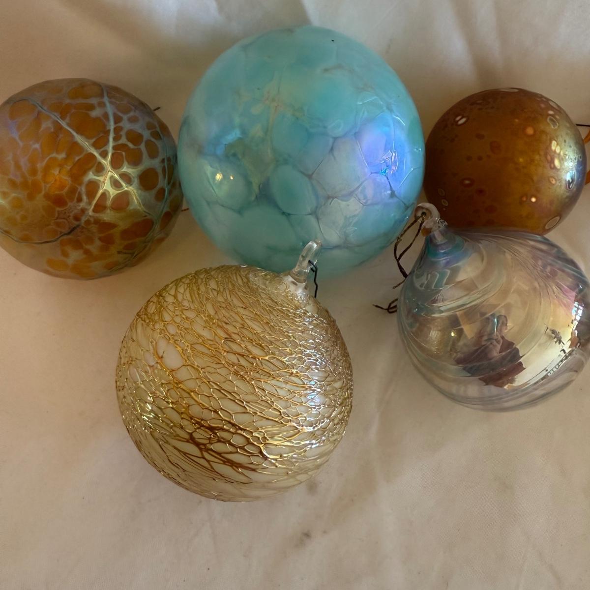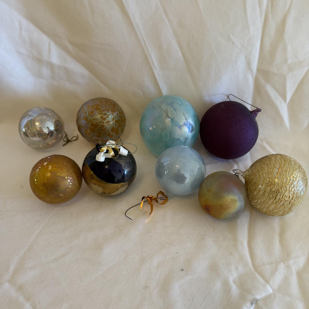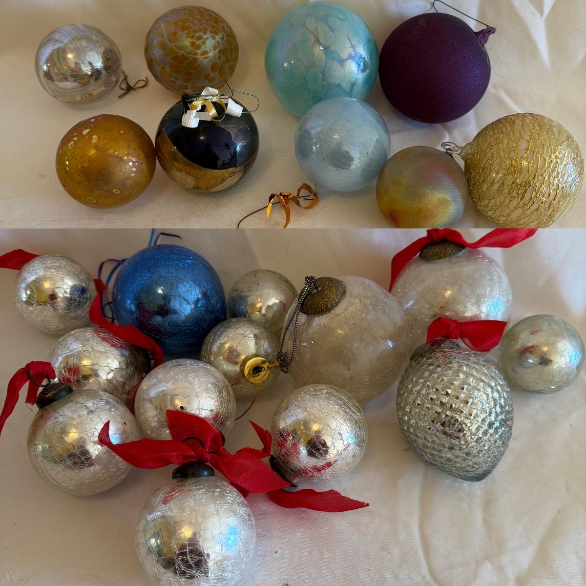 This lot contains a total of 22 glass bulb ornaments. Nine of them seem to be hand blown and in various colors and shapes. Smallest is 3” x 3”H, largest is 4.5” x 5”. The other 13 are different sizes and a couple different shapes but do match a bit. See pictures for details. Shipping available.