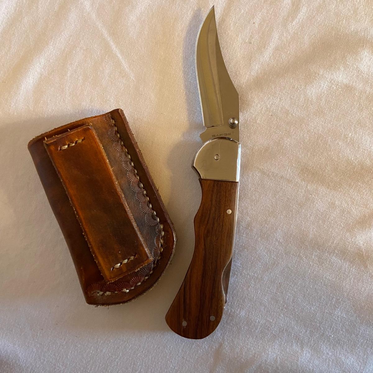 Lovely dovetail handmade wooden boxes in a variety of shapes and sizes. Lot also includes small wooden bowl and stainless steel stamped Sarge knife with leather sheath. This lot includes a medium sized music box, a large jewelry box that measures 11” x 8.5” x 6”H, two narrow boxes with slide tops, a small rectangle box, and three small square boxes the largest of which measures 4.25” x 4.25” x 3”H, all with fitted tops and every box in lot is lined with felt. No markings found. Shipping available.