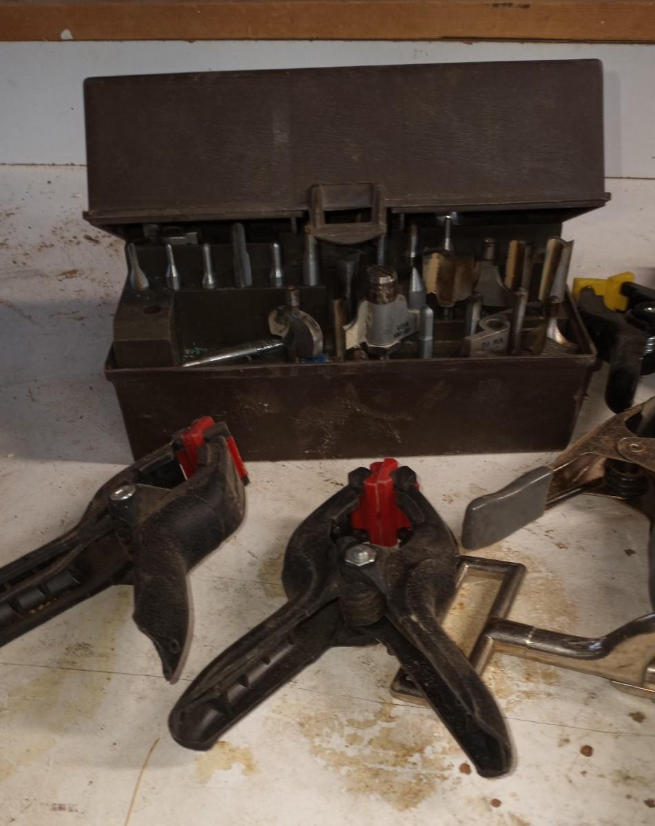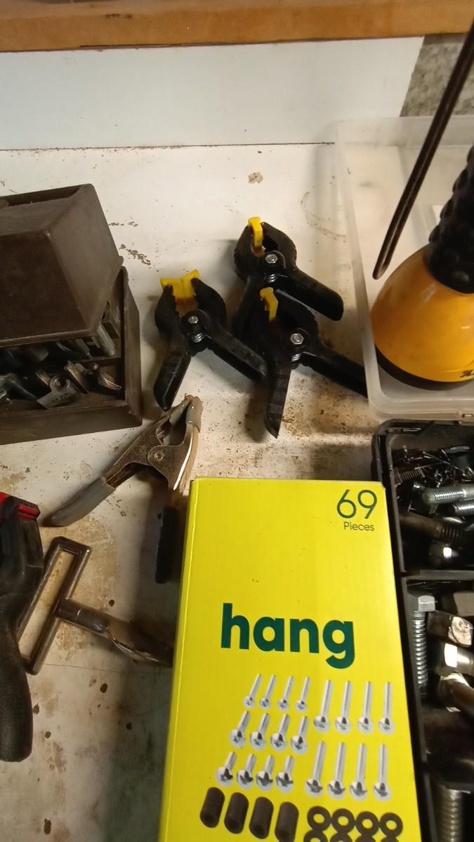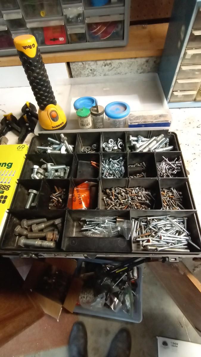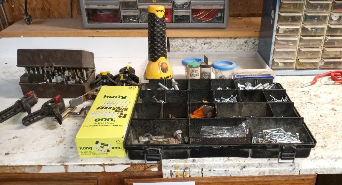 VARIETY OF HARDWARE IN ORGANIZER-FLASHLIGHT-SMALL CLAMPS AND MORE