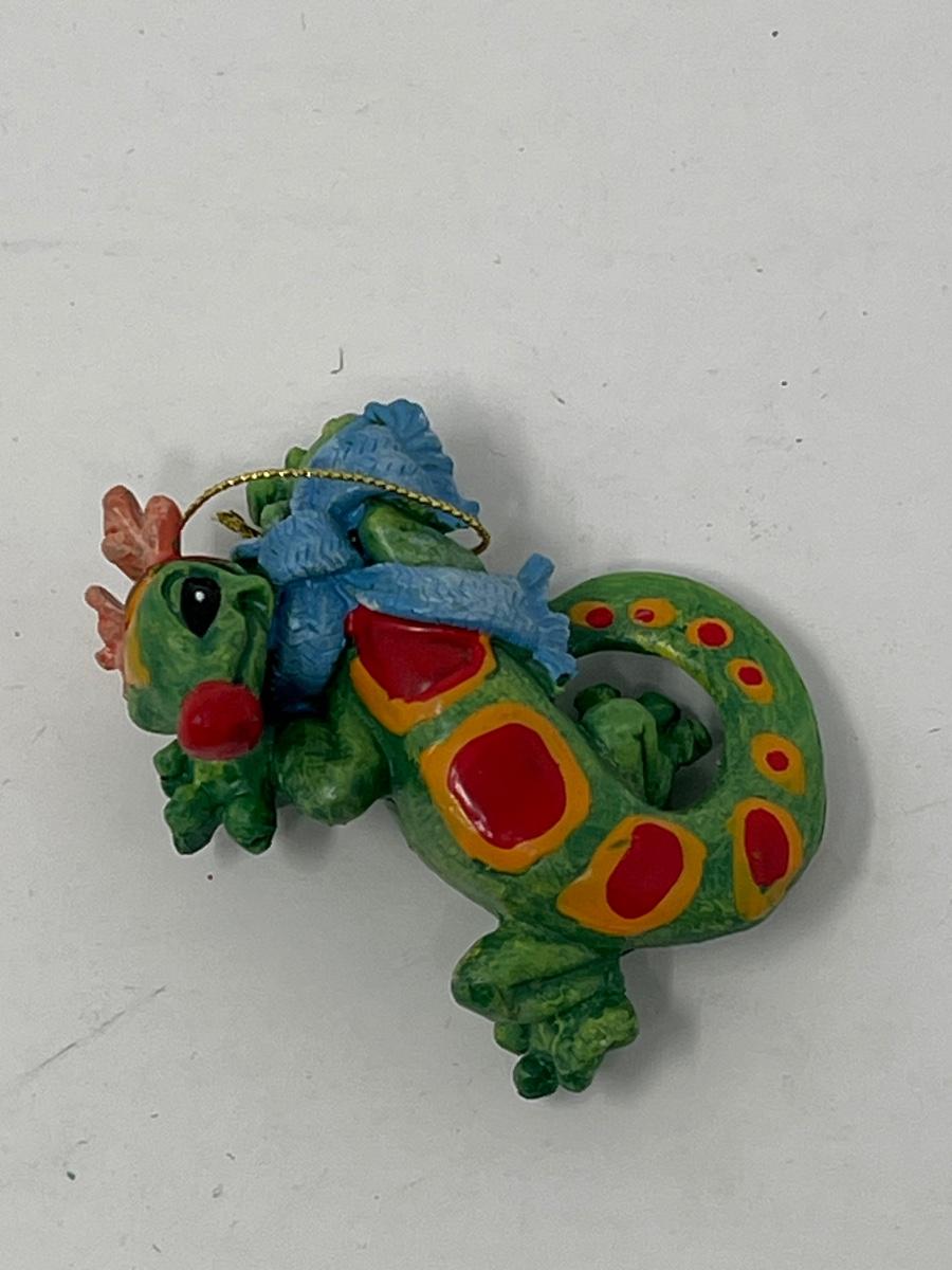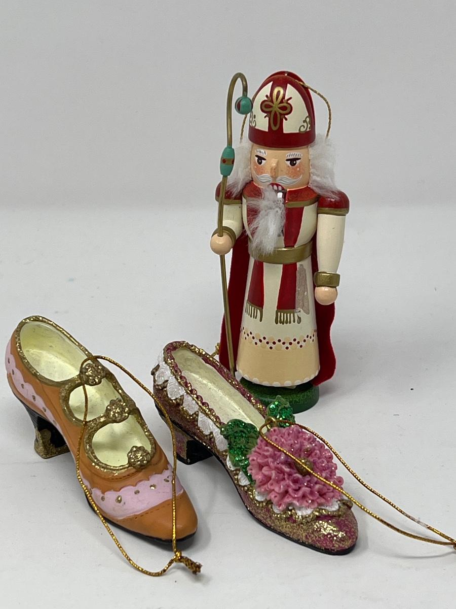Various ornaments including ceramic shoes, neon tropical fish, handcrafted lutes and guitar, Rudolph the red nose Gecko, and nutcracker.