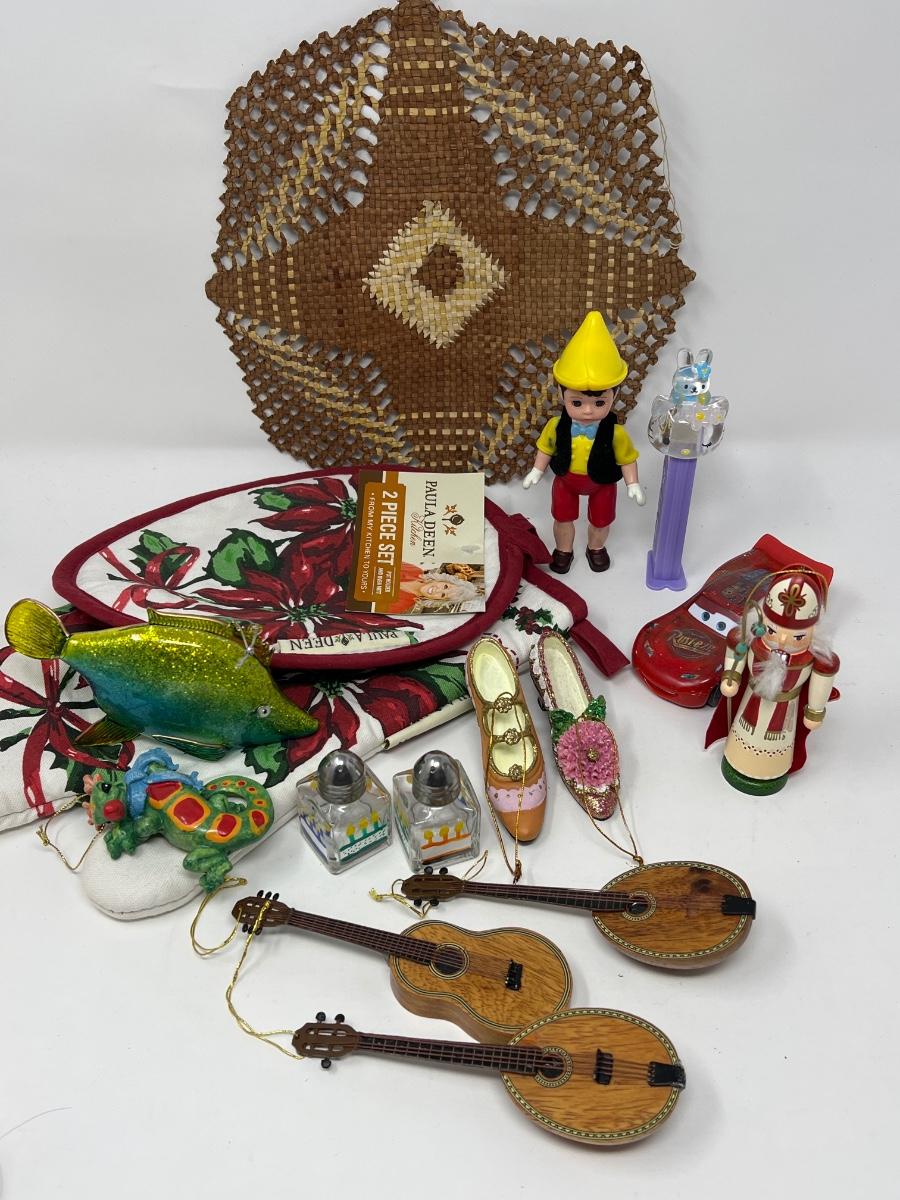 Also included Paula Deen pot holder and mitt (new), Pinocchio McDonalds/Alexander Toy, Pez Clear Hello Kitty, Rusteze from Cars, and 2” tall birthday salt & pepper shakers.