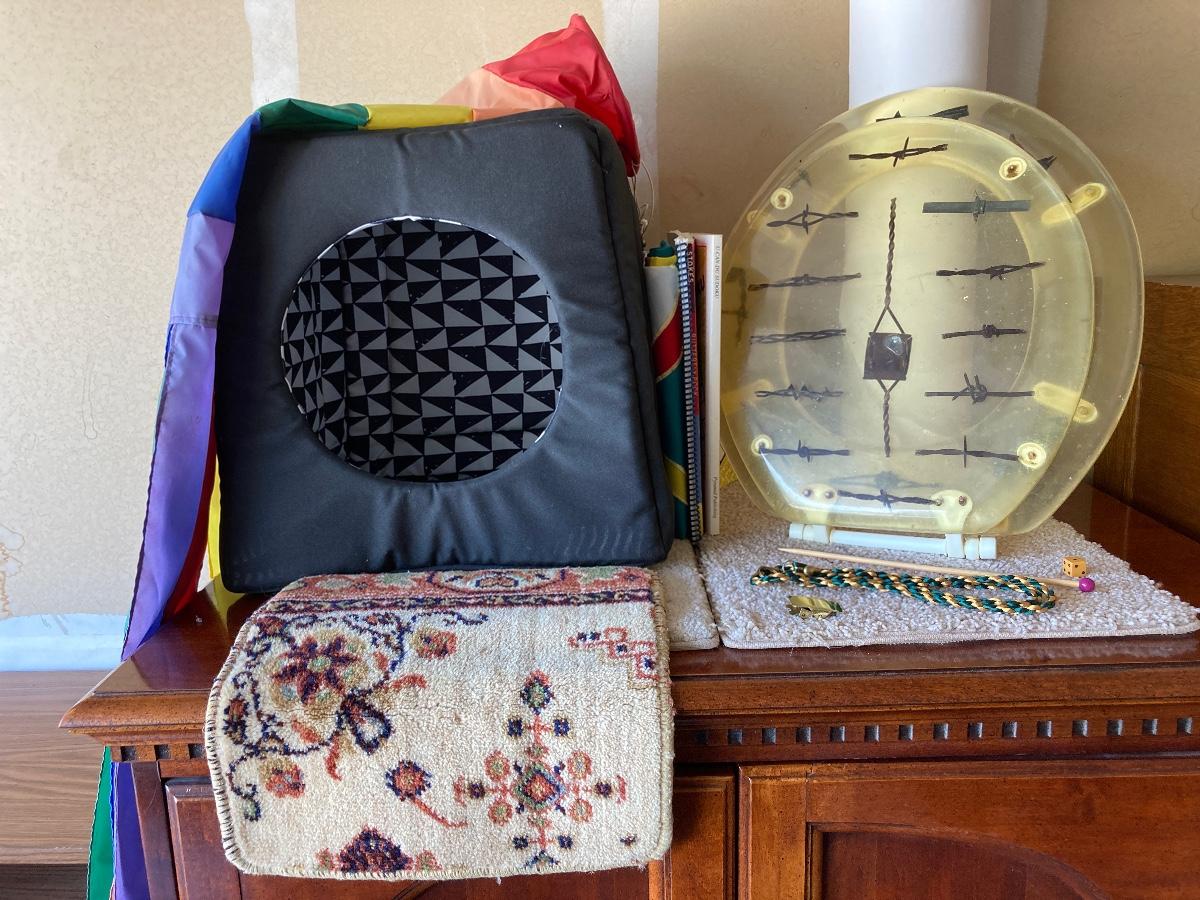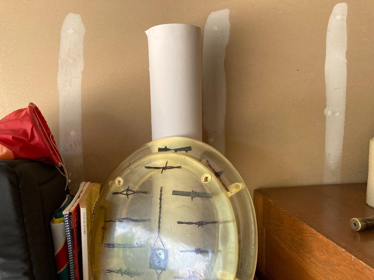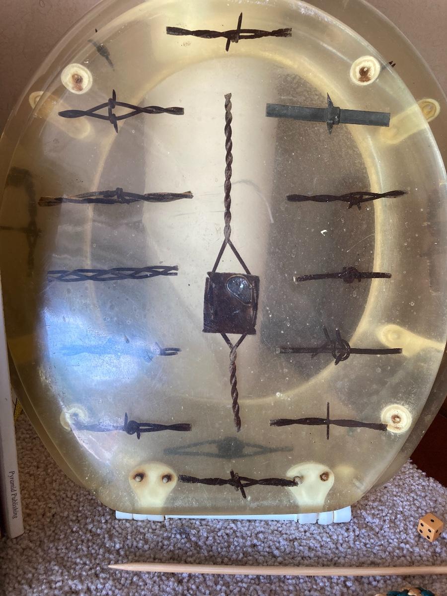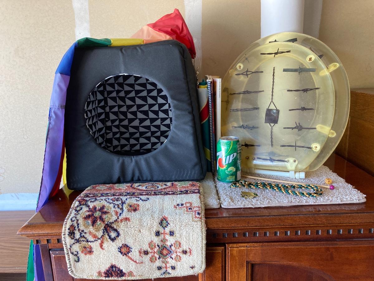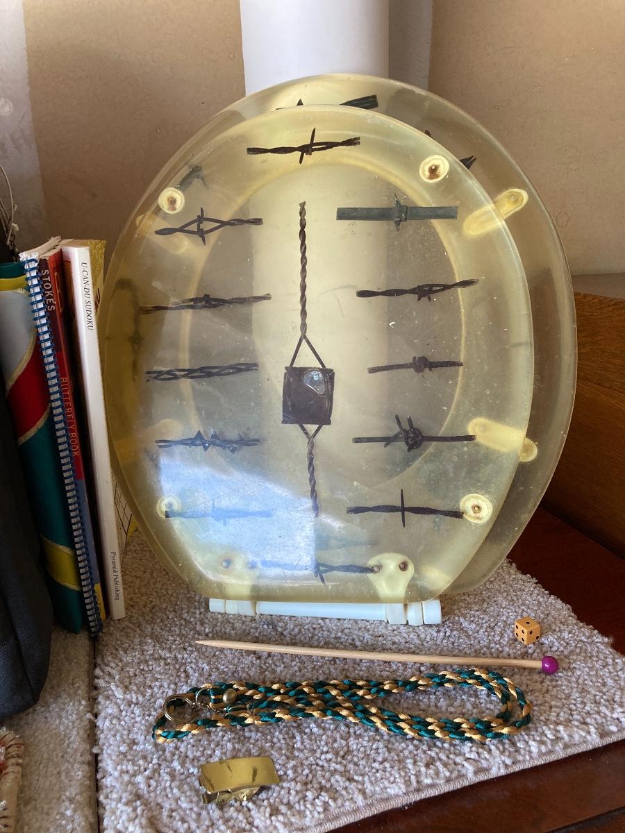 #455 Household Items: Barbed Wire Toilet Seat, Roll of Newsprint Paper, Fabric Doghouse, Windsock, Books, Etc