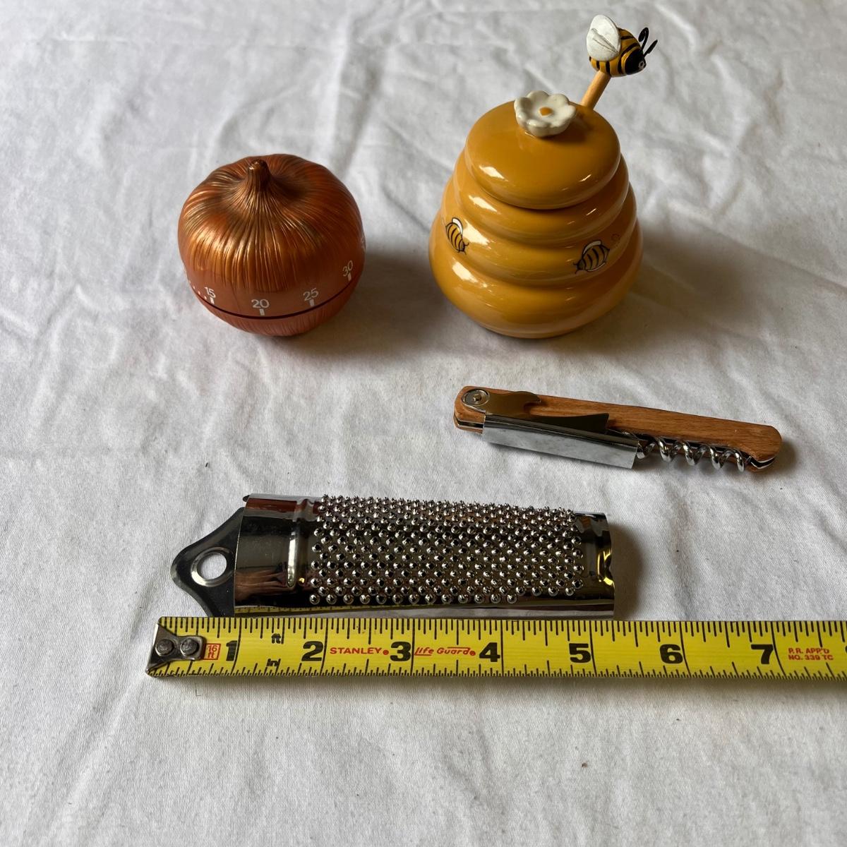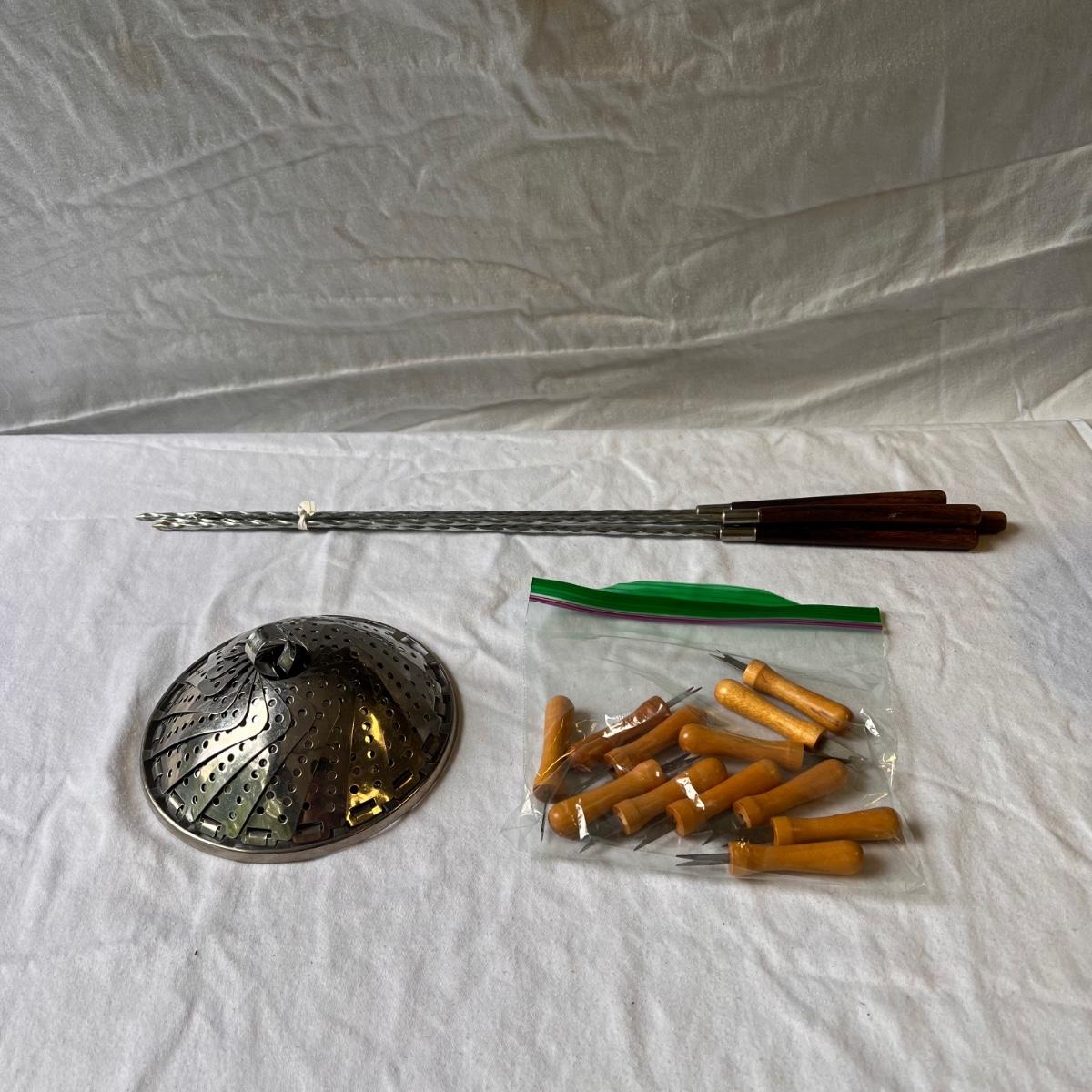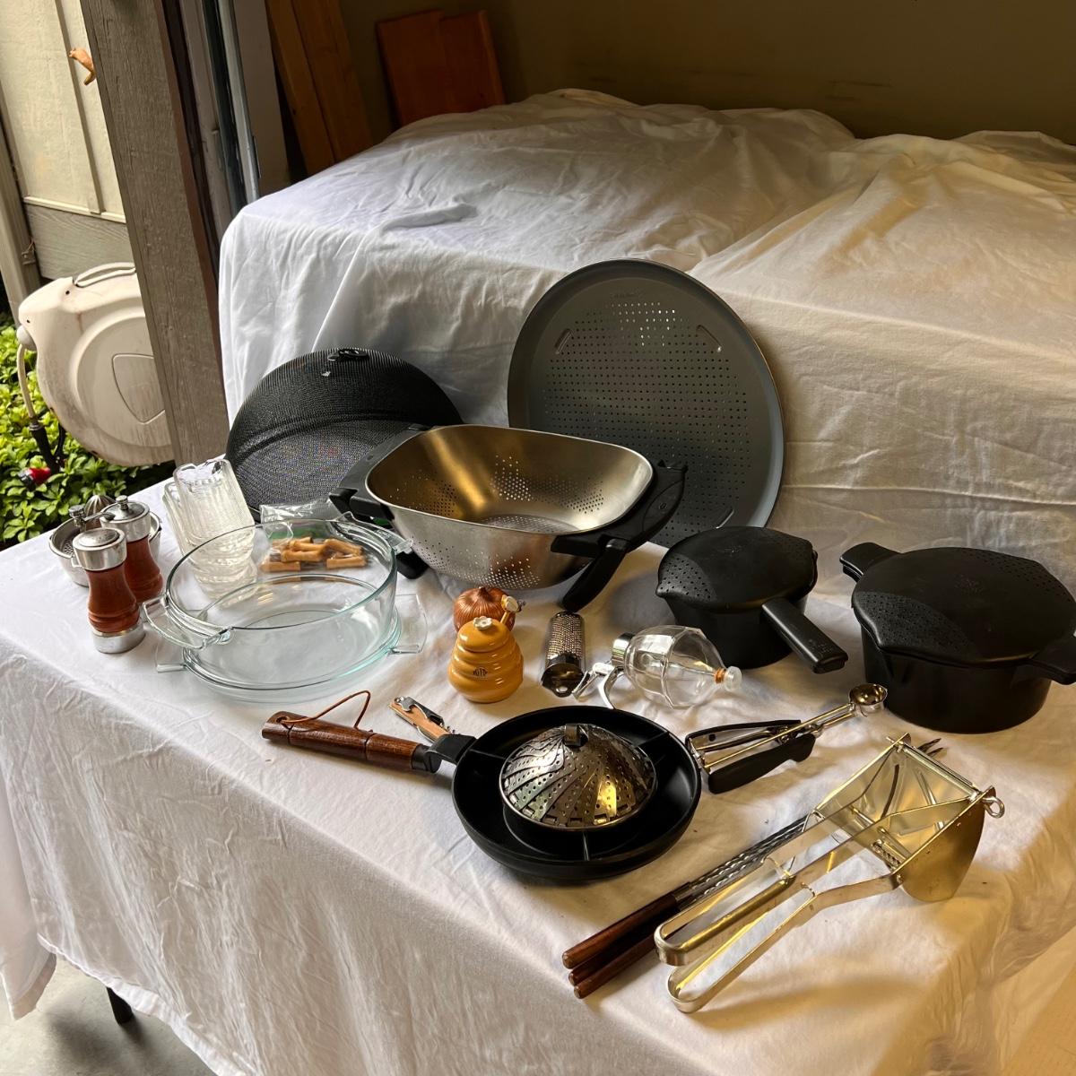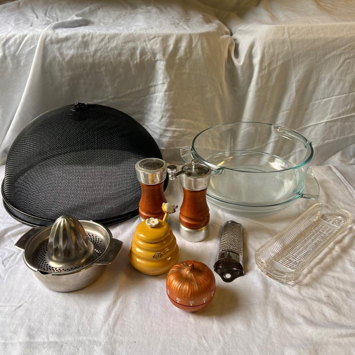 Lot includes 12 small skewers, four large skewers, two glass Pyrex dishes, salt and pepper shakers, a citrus juicer, a glass honey dispenser, an onion kitchen timer, a ceramic honey dish, a garlic grater, a pocket bottle opener/knife, a potato press, a cookie dough scooper, two plastic micro cookers by Pampered Chef, a Nordic Ware Aluminum Crepe Pan, two mesh food covers, four corn on the cob glass dishes, one good grip colander, and one pizza pan. The strainer is the largest item that measures 23” x 9”H. Shipping available.