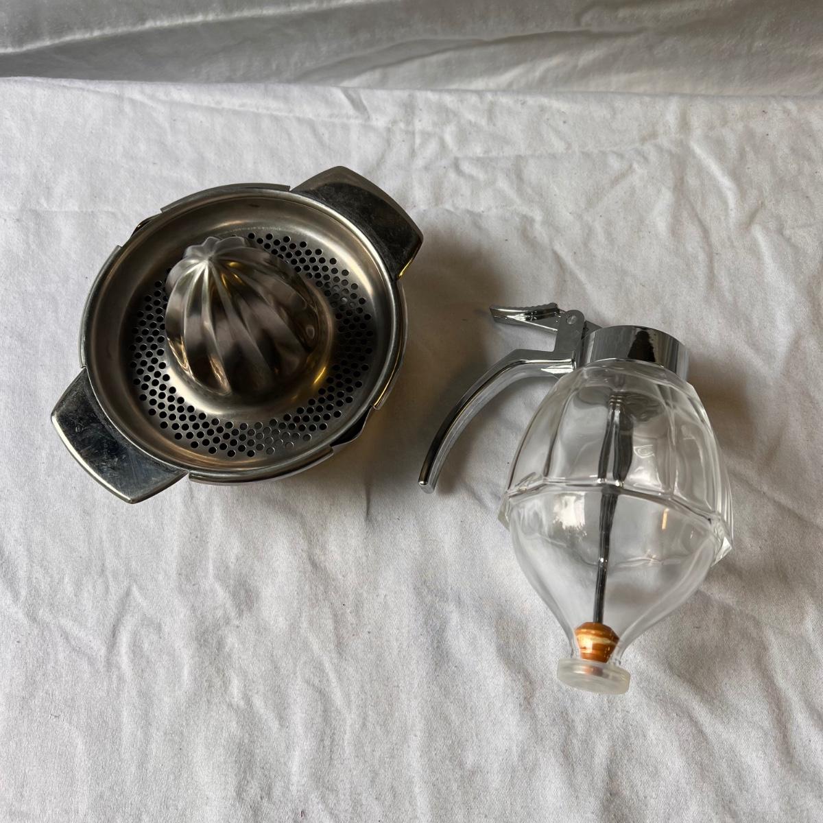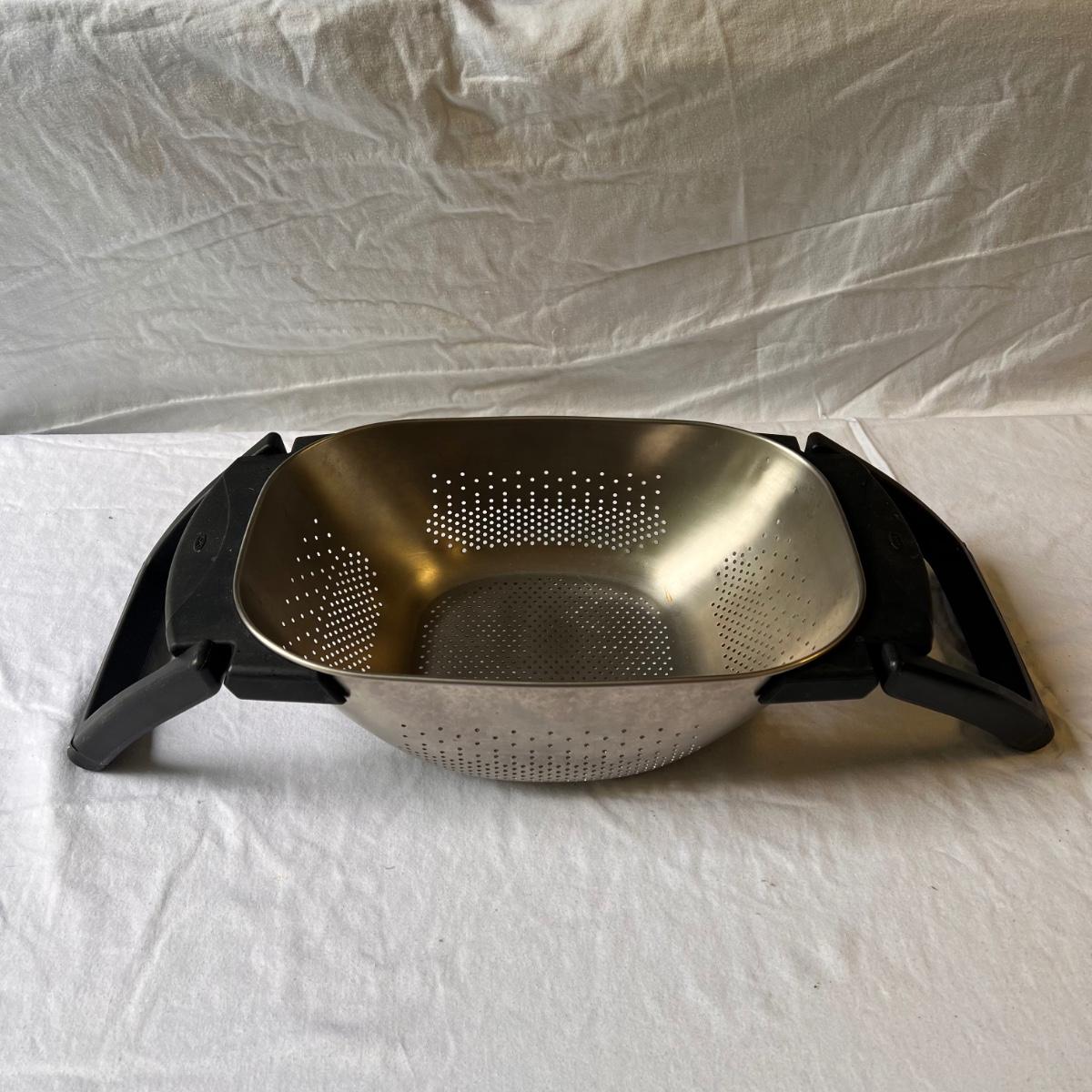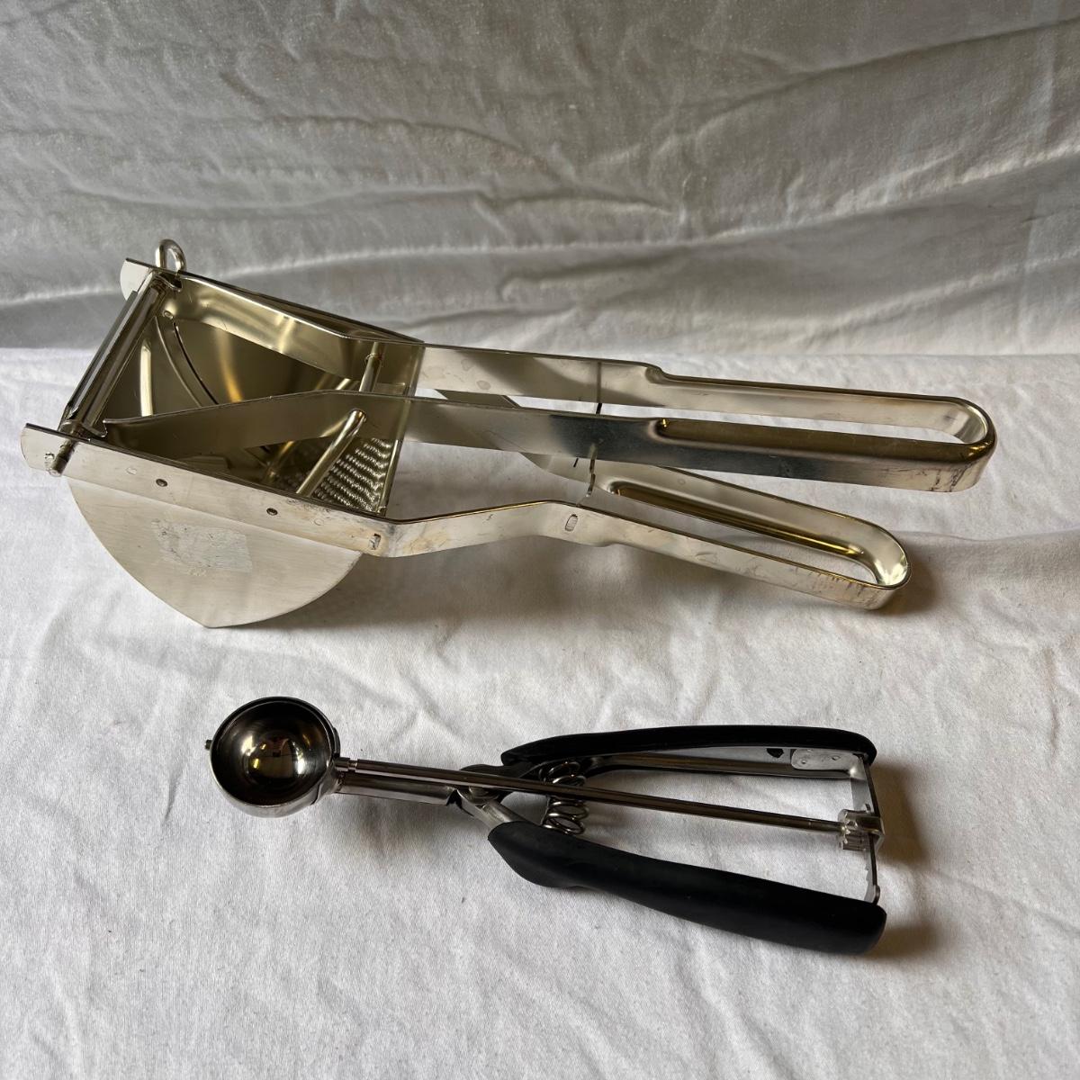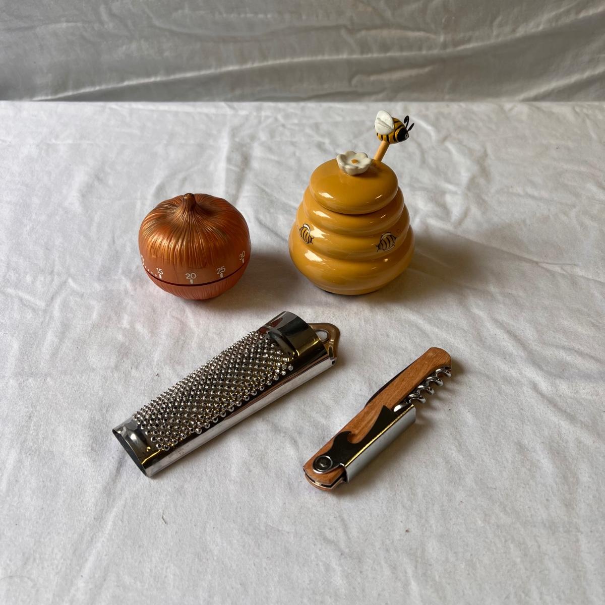 Lot includes 12 small skewers, four large skewers, two glass Pyrex dishes, salt and pepper shakers, a citrus juicer, a glass honey dispenser, an onion kitchen timer, a ceramic honey dish, a garlic grater, a pocket bottle opener/knife, a potato press, a cookie dough scooper, two plastic micro cookers by Pampered Chef, a Nordic Ware Aluminum Crepe Pan, two mesh food covers, four corn on the cob glass dishes, one good grip colander, and one pizza pan. The strainer is the largest item that measures 23” x 9”H. Shipping available.