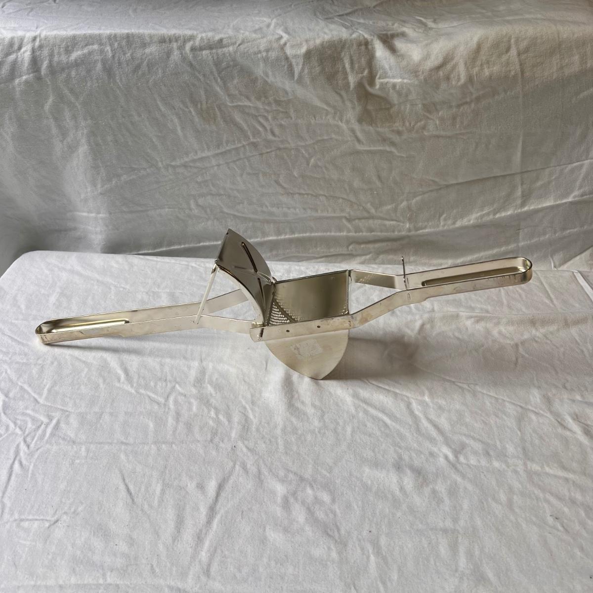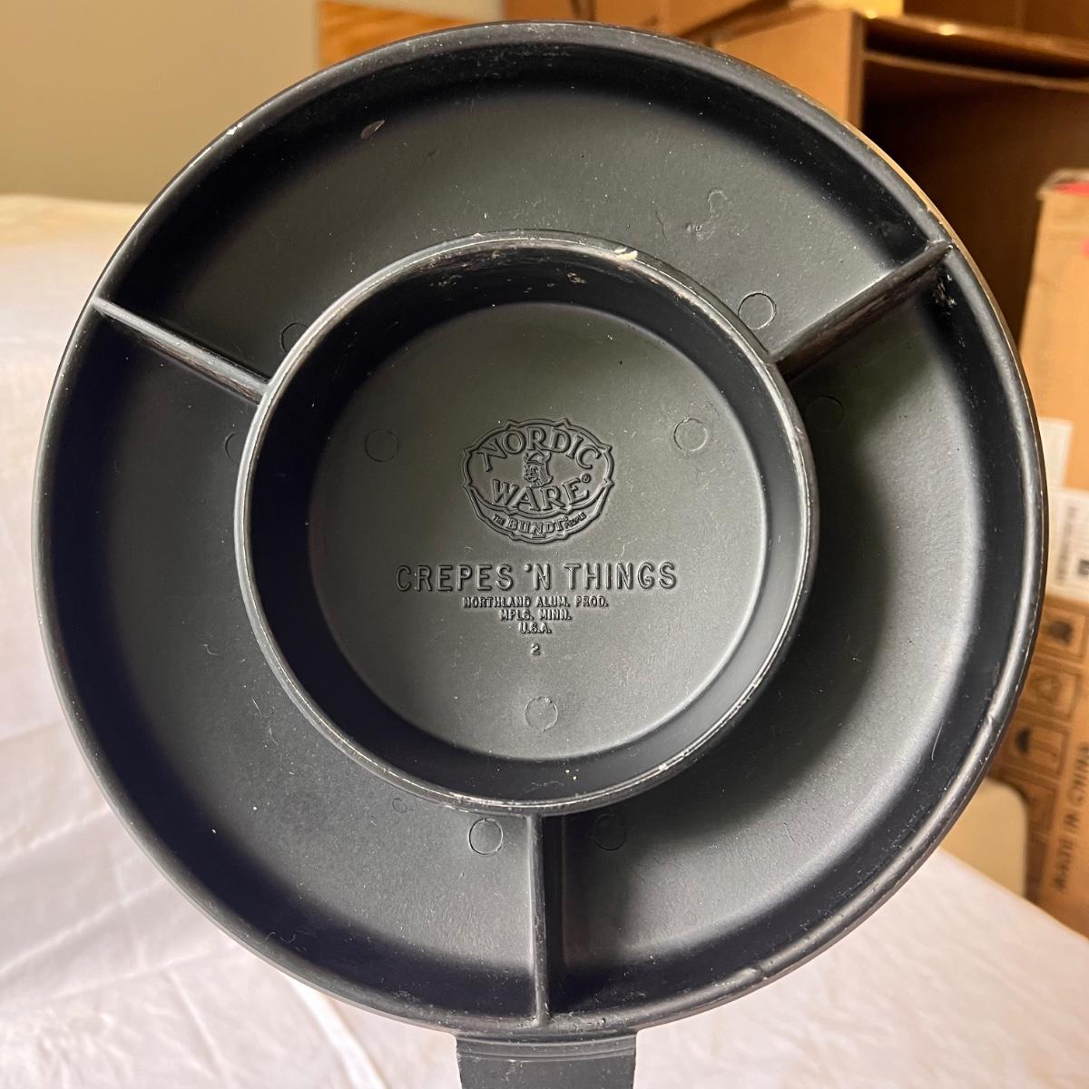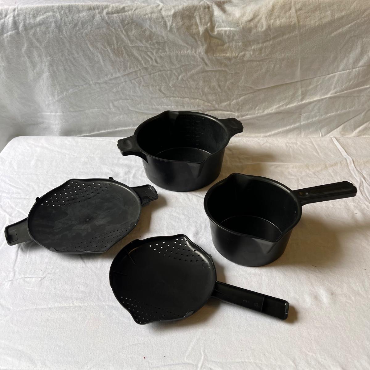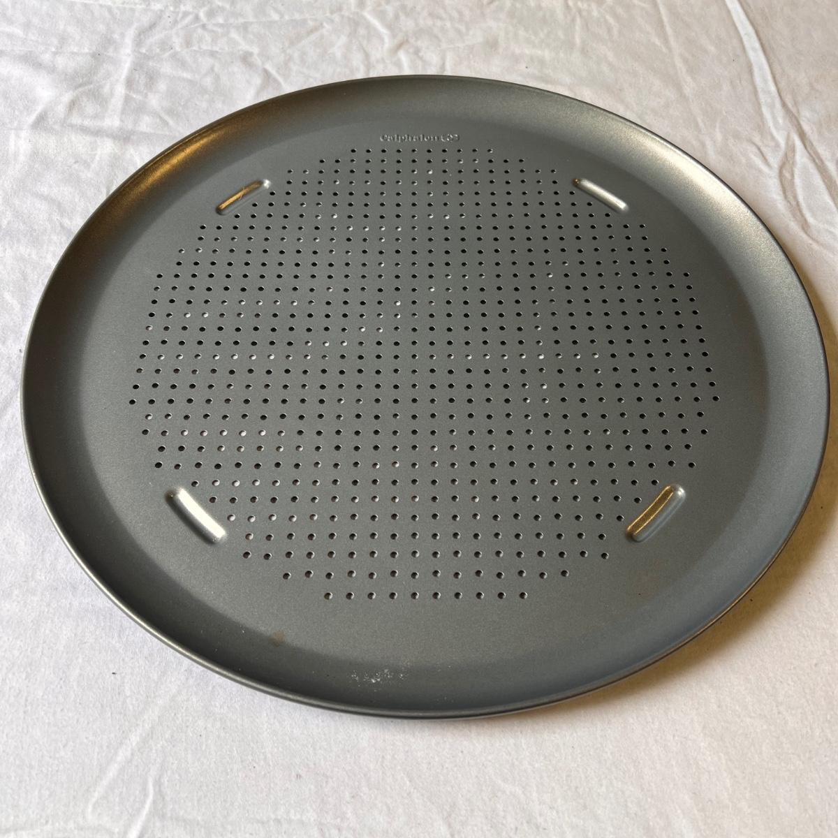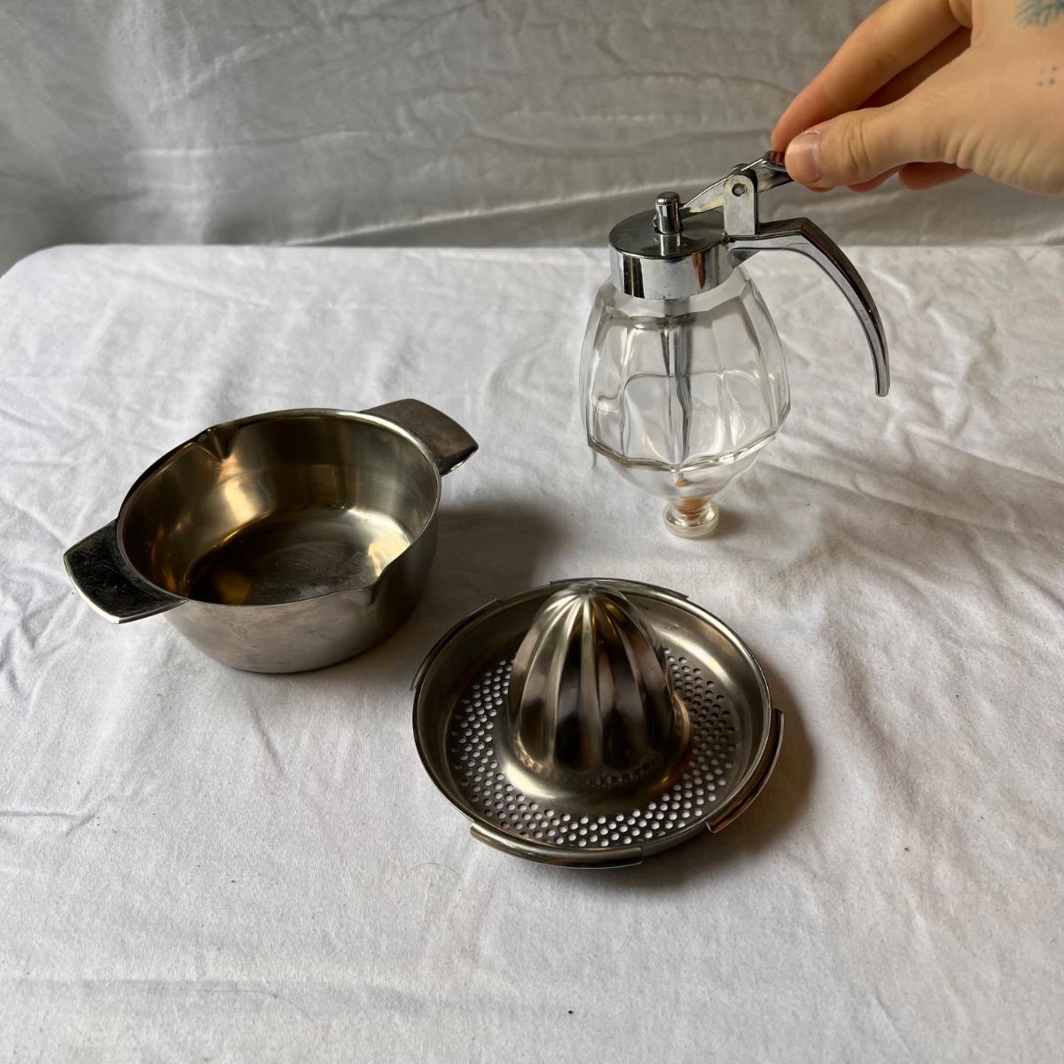 Lot includes 12 small skewers, four large skewers, two glass Pyrex dishes, salt and pepper shakers, a citrus juicer, a glass honey dispenser, an onion kitchen timer, a ceramic honey dish, a garlic grater, a pocket bottle opener/knife, a potato press, a cookie dough scooper, two plastic micro cookers by Pampered Chef, a Nordic Ware Aluminum Crepe Pan, two mesh food covers, four corn on the cob glass dishes, one good grip colander, and one pizza pan. The strainer is the largest item that measures 23” x 9”H. Shipping available.
