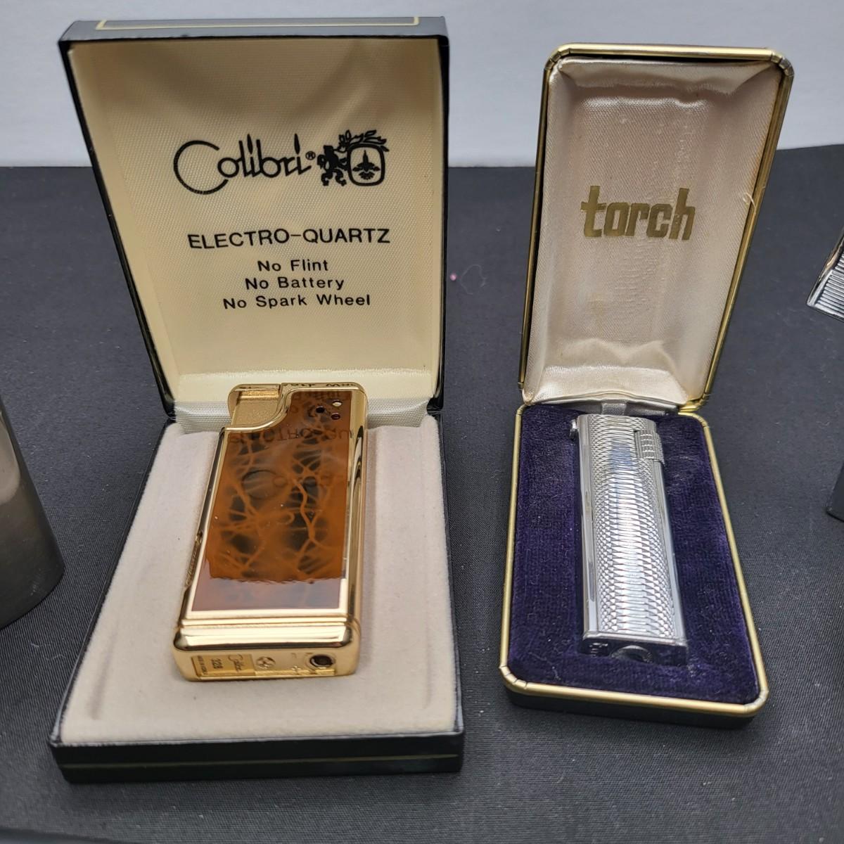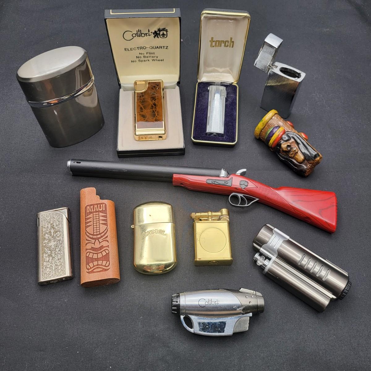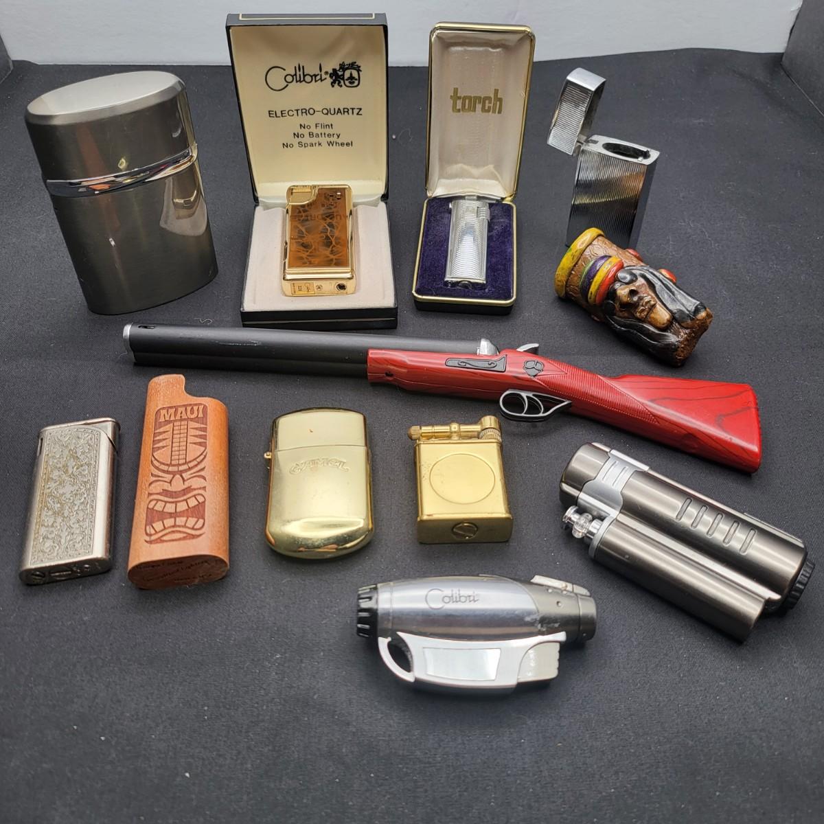 Vintage Colibri Electro-Quartz #328, Korea. Colibri grenade shape lighter (US Pat. D-448.112, refillable. Colibri refillable, silver etched, Japan. Silver tone Bic case. Large torch lighter(works). Compass torch (works). Rifle shaped lighter. Refillable gold tone Camel lighter. Severalbother Bic/standard lighter cases. Most just need to be refilled, some still have fluid and work.