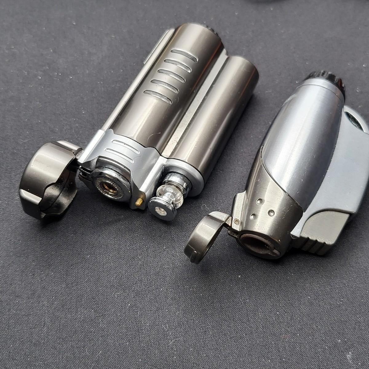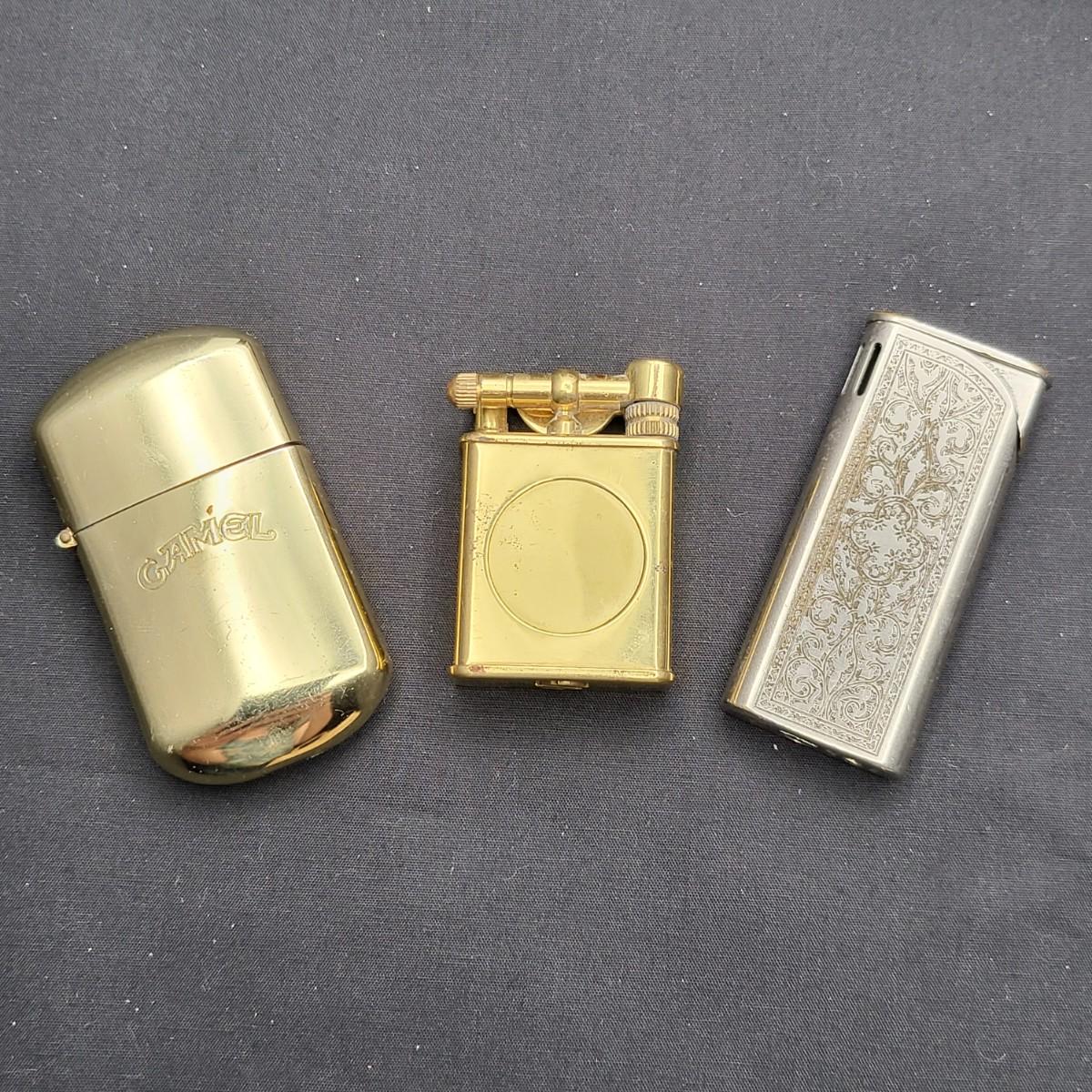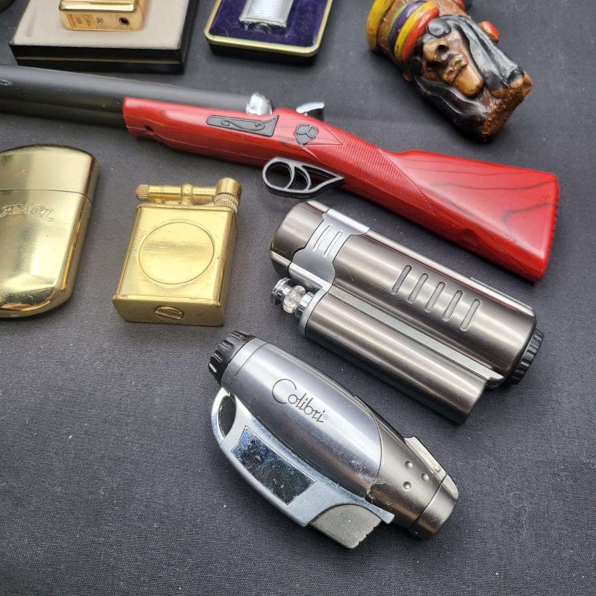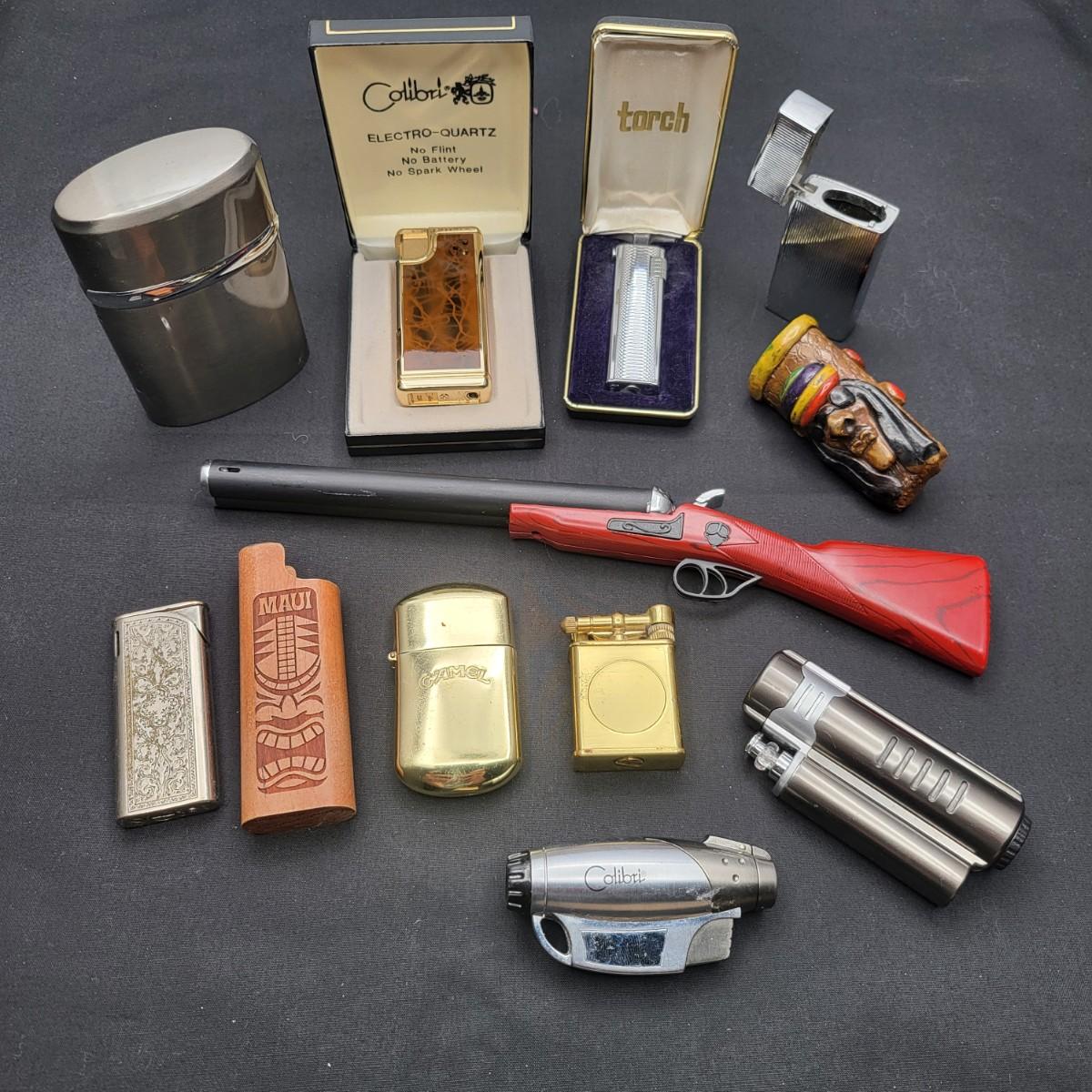 Vintage Colibri Electro-Quartz #328, Korea. Colibri grenade shape lighter (US Pat. D-448.112, refillable. Colibri refillable, silver etched, Japan. Silver tone Bic case. Large torch lighter(works). Compass torch (works). Rifle shaped lighter. Refillable gold tone Camel lighter. Severalbother Bic/standard lighter cases. Most just need to be refilled, some still have fluid and work.