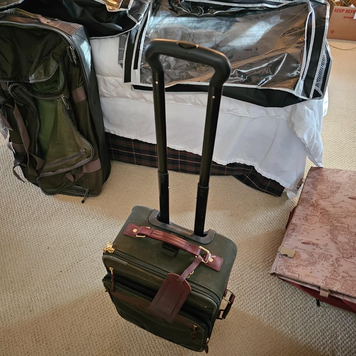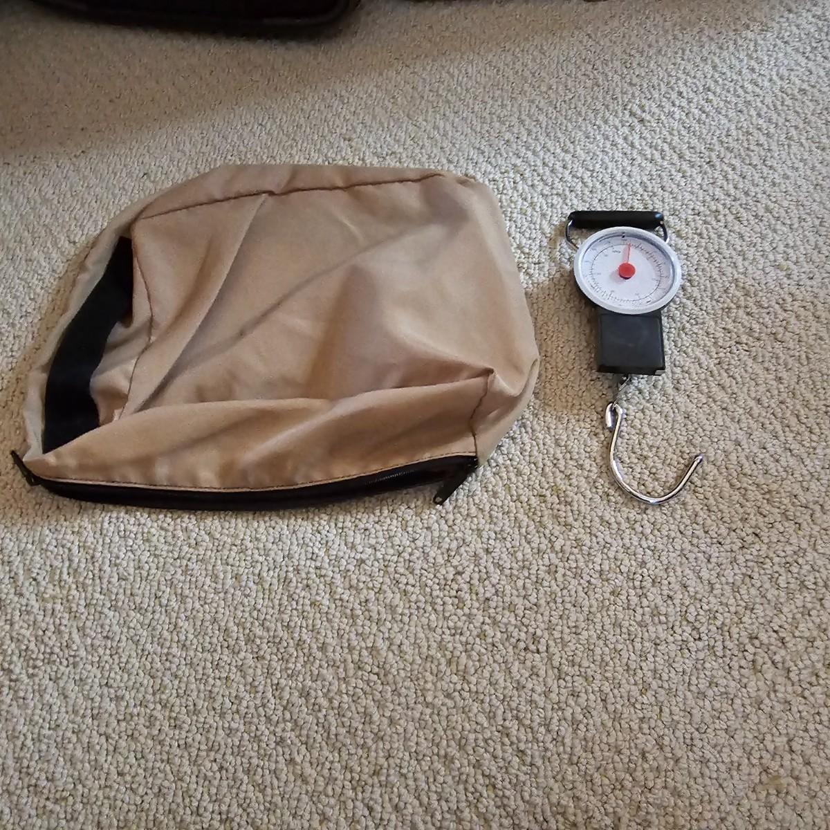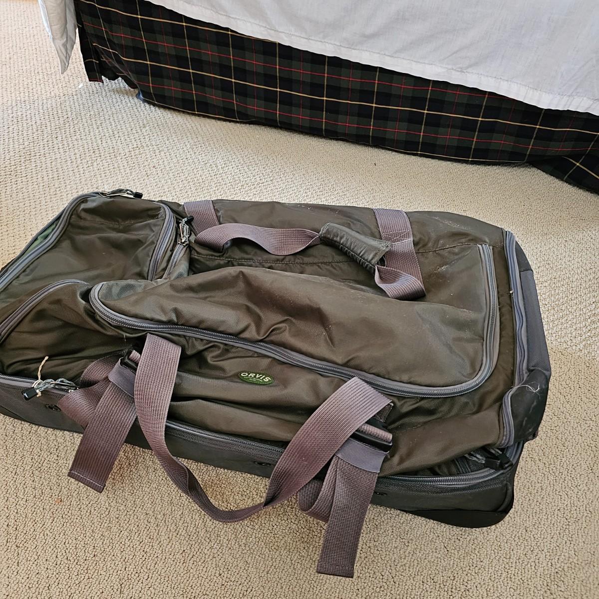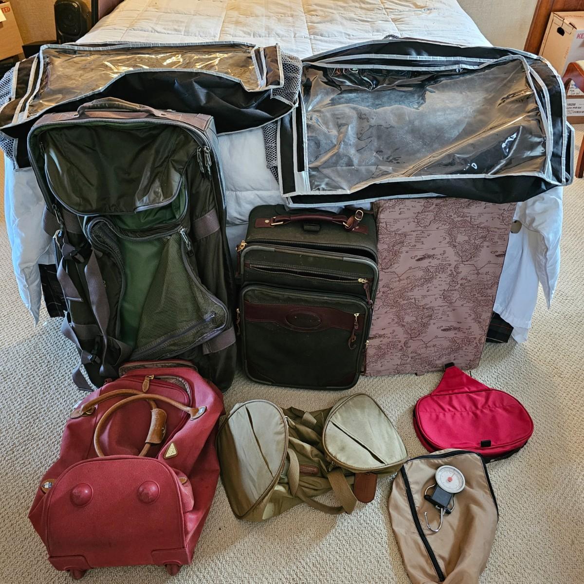Four duffle/traditional style pieces and some other items, hanging bags, pouches, etc. Two pieces of Orvis travel gear, largest is 18" x 9" x 32"H, smaller is 14" x 8" x 22" H. Two container bags with large D rings, 17" x 31". Red Jump duffle is 14" x 10" x 21". Also includes one portable weighing scale. See photos for details. Local pickup only.