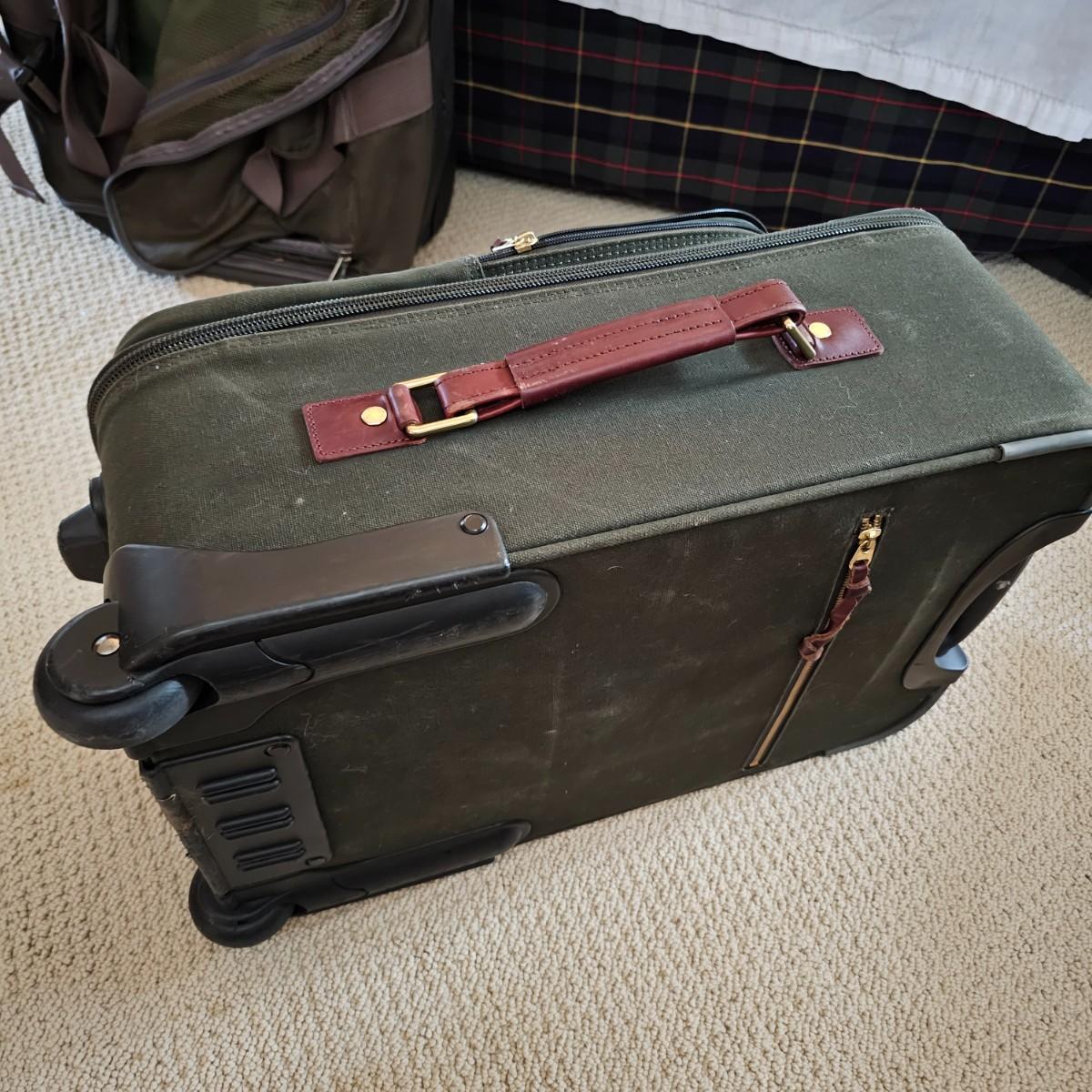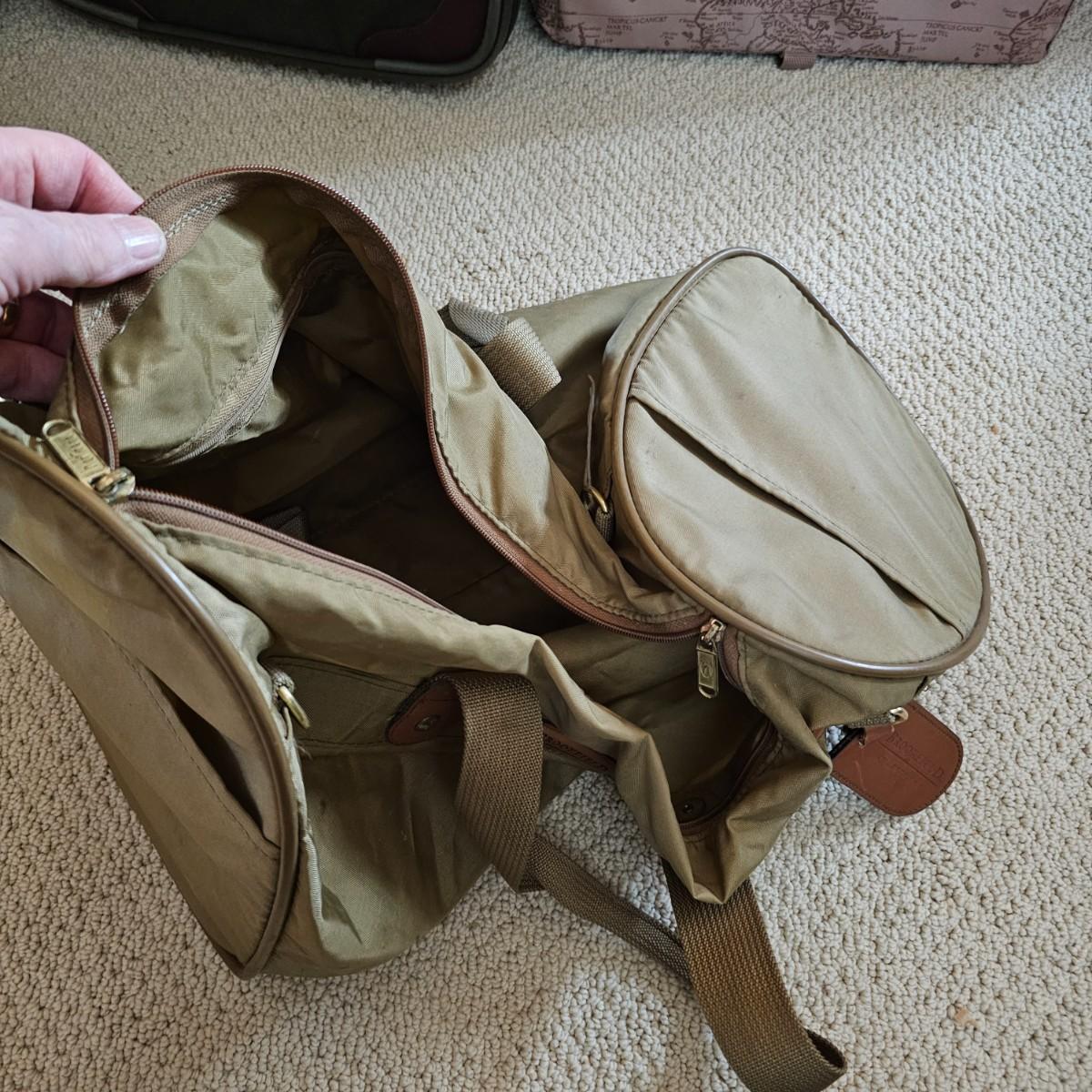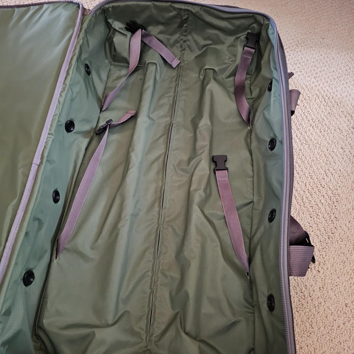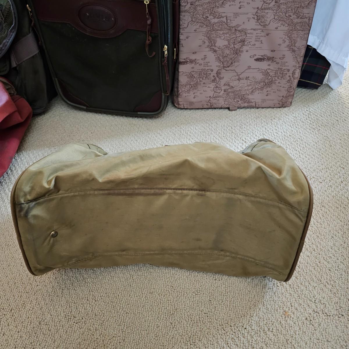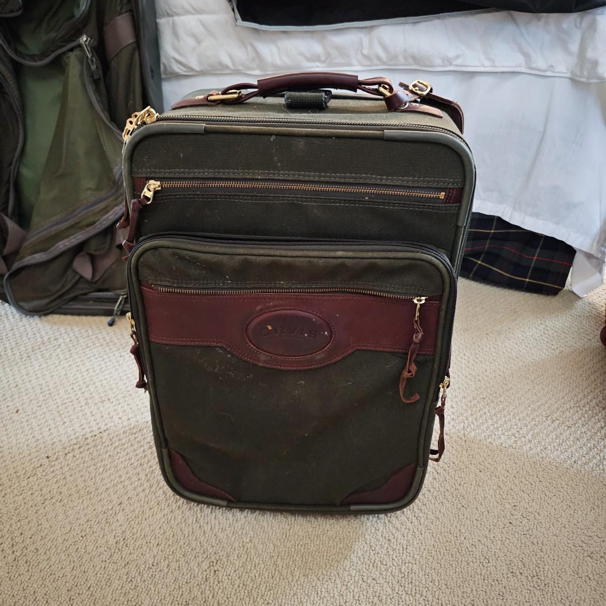 Four duffle/traditional style pieces and some other items, hanging bags, pouches, etc. Two pieces of Orvis travel gear, largest is 18" x 9" x 32"H, smaller is 14" x 8" x 22" H. Two container bags with large D rings, 17" x 31". Red Jump duffle is 14" x 10" x 21". Also includes one portable weighing scale. See photos for details. Local pickup only.