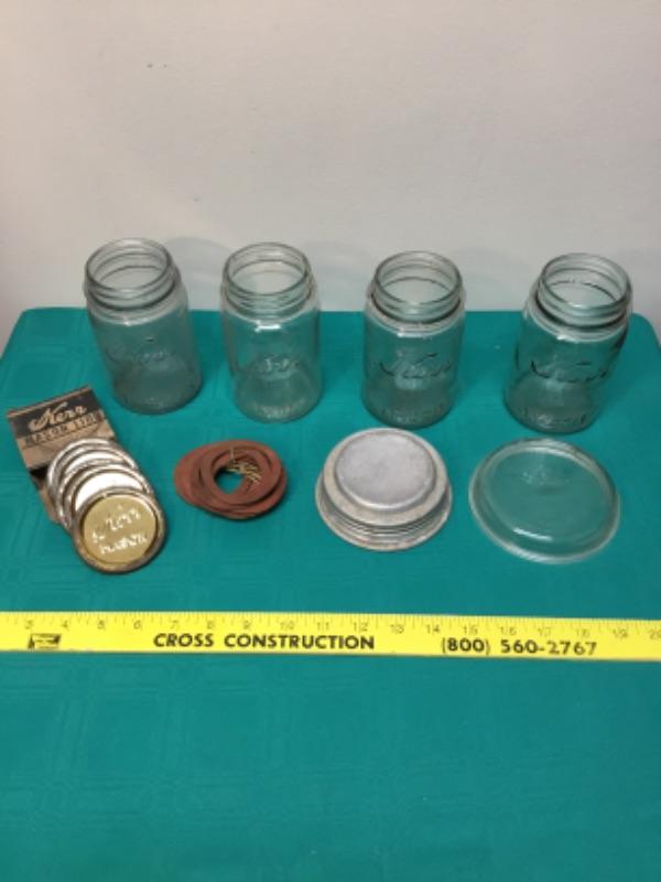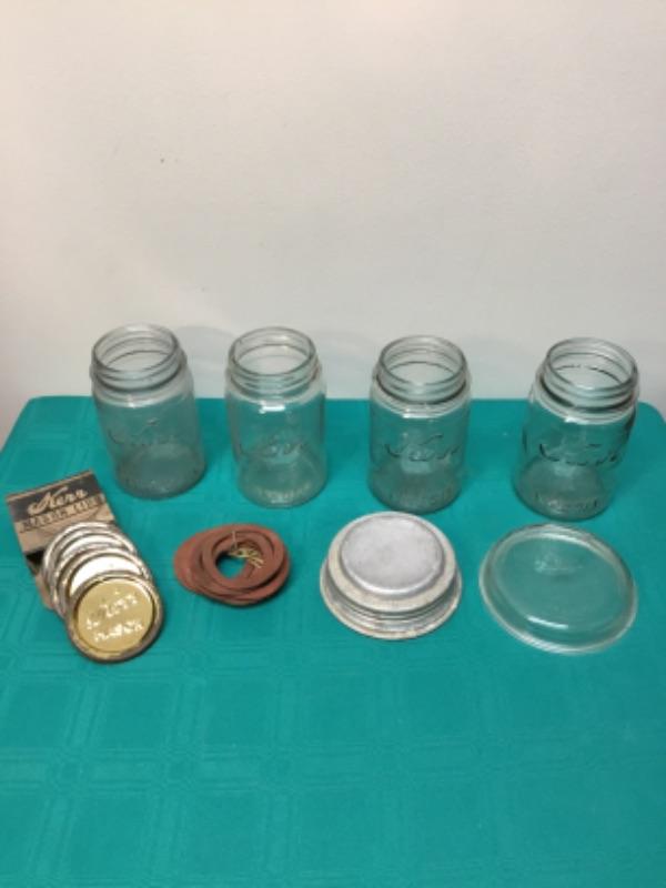 Variety of Kerr Mason Jars, Lids and Rubber seals. Box of Kerr Mason Lids.