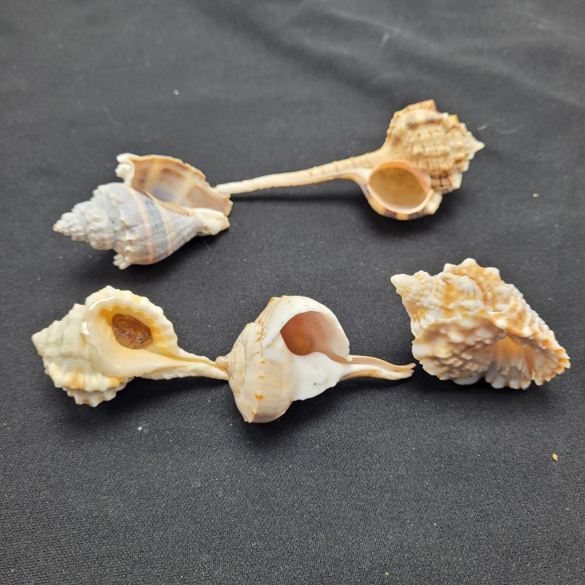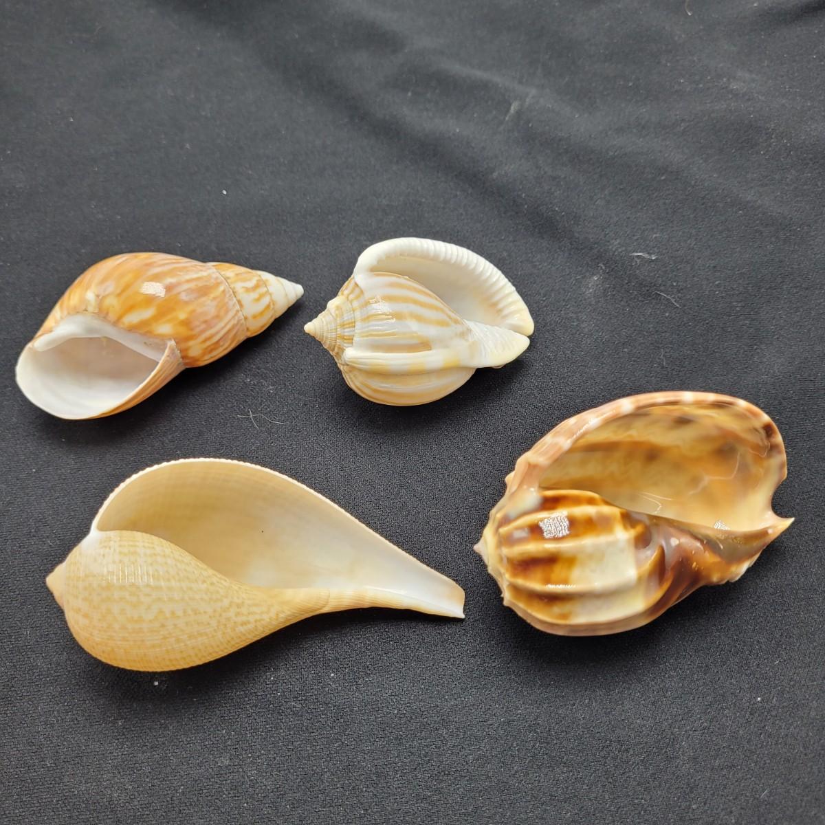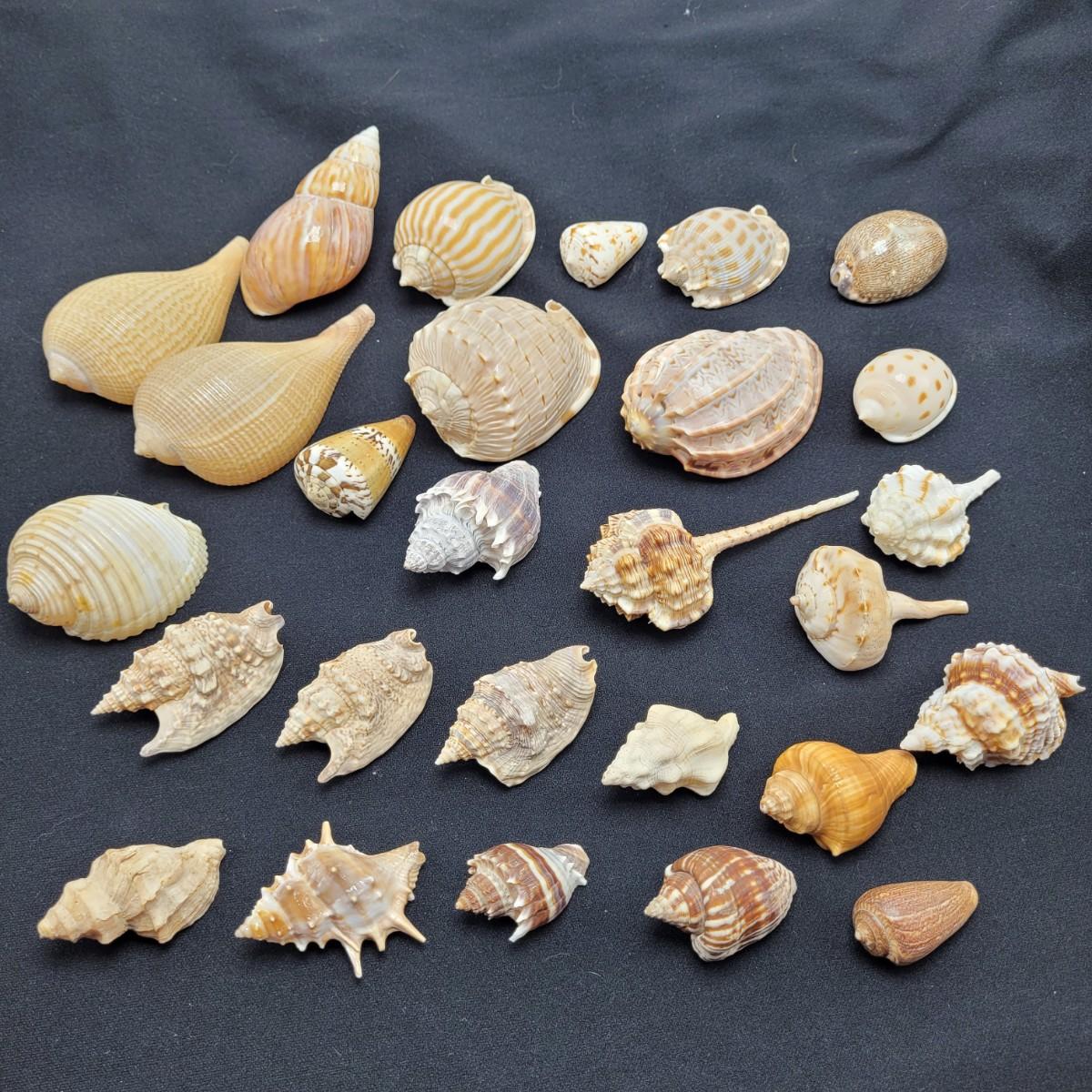 This lot includes a large variety of mollusk shells. There are 27 total shells. Shells appear to derive from conchs, whelks, tuns, wrinkles, and cowries. The largest shell measures 4.5" x 2.5" x 1.5"H and the smallest shell measures 1.5" x 1" x .5"H. There is a large multitude of shapes and colors of shells included. See photos for more detail.