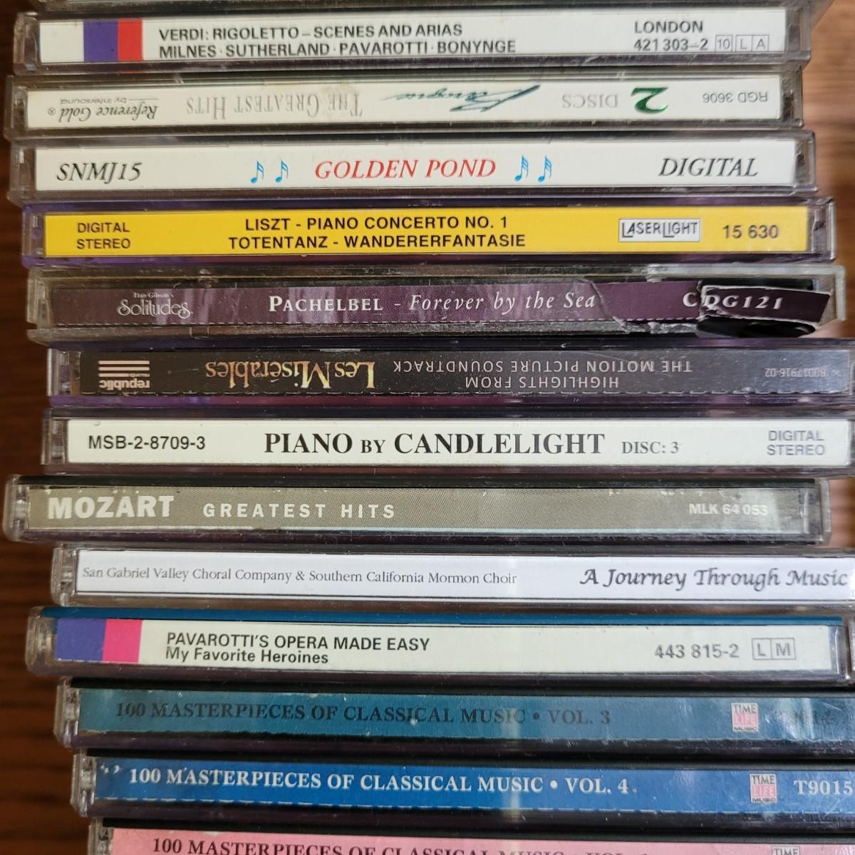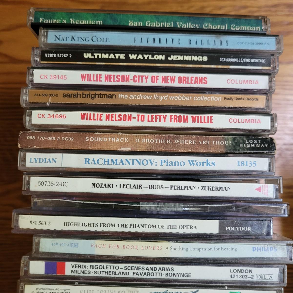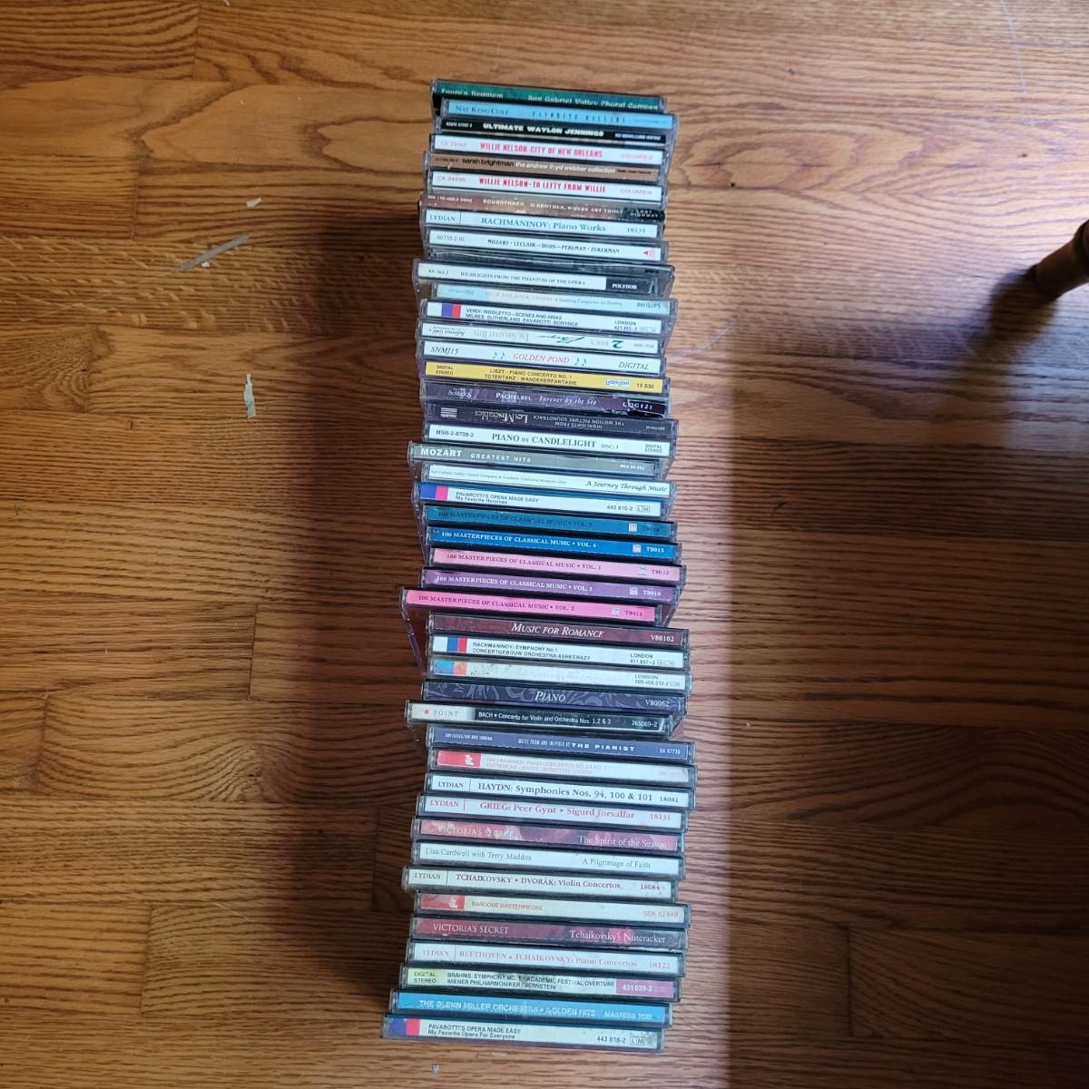 CD's all in cases except for the two shown in photos. Largely comprised of classical and opera, with other notable artists such as Willie Nelson and Nat King Cole. Discs in cases appear to be in good condition but can not verify for each disc. Discs without cases heavily scratched. Shipping available.