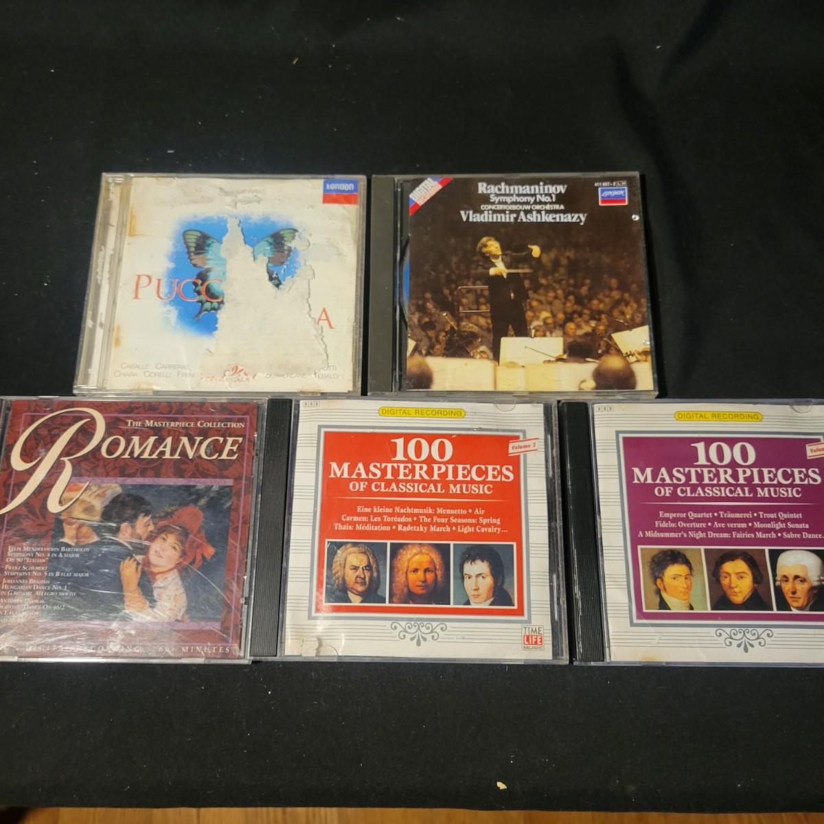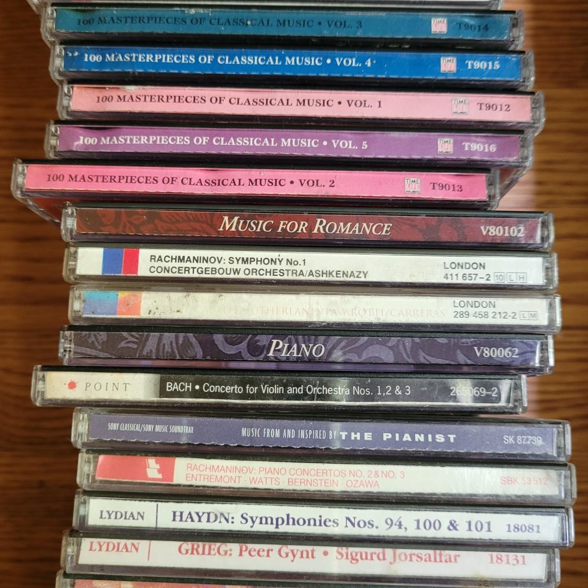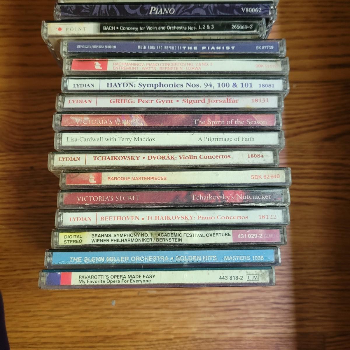 CD's all in cases except for the two shown in photos. Largely comprised of classical and opera, with other notable artists such as Willie Nelson and Nat King Cole. Discs in cases appear to be in good condition but can not verify for each disc. Discs without cases heavily scratched. Shipping available.