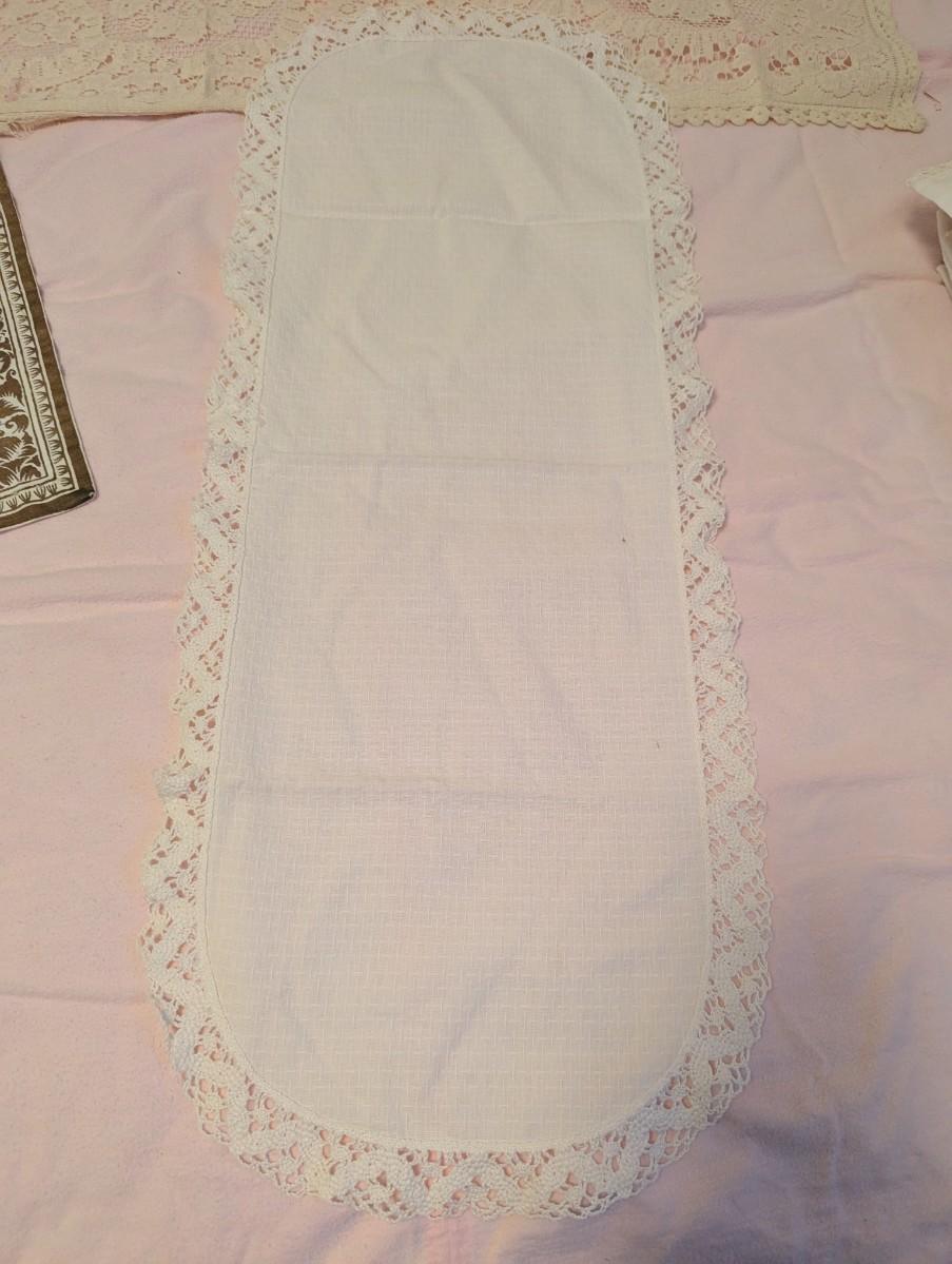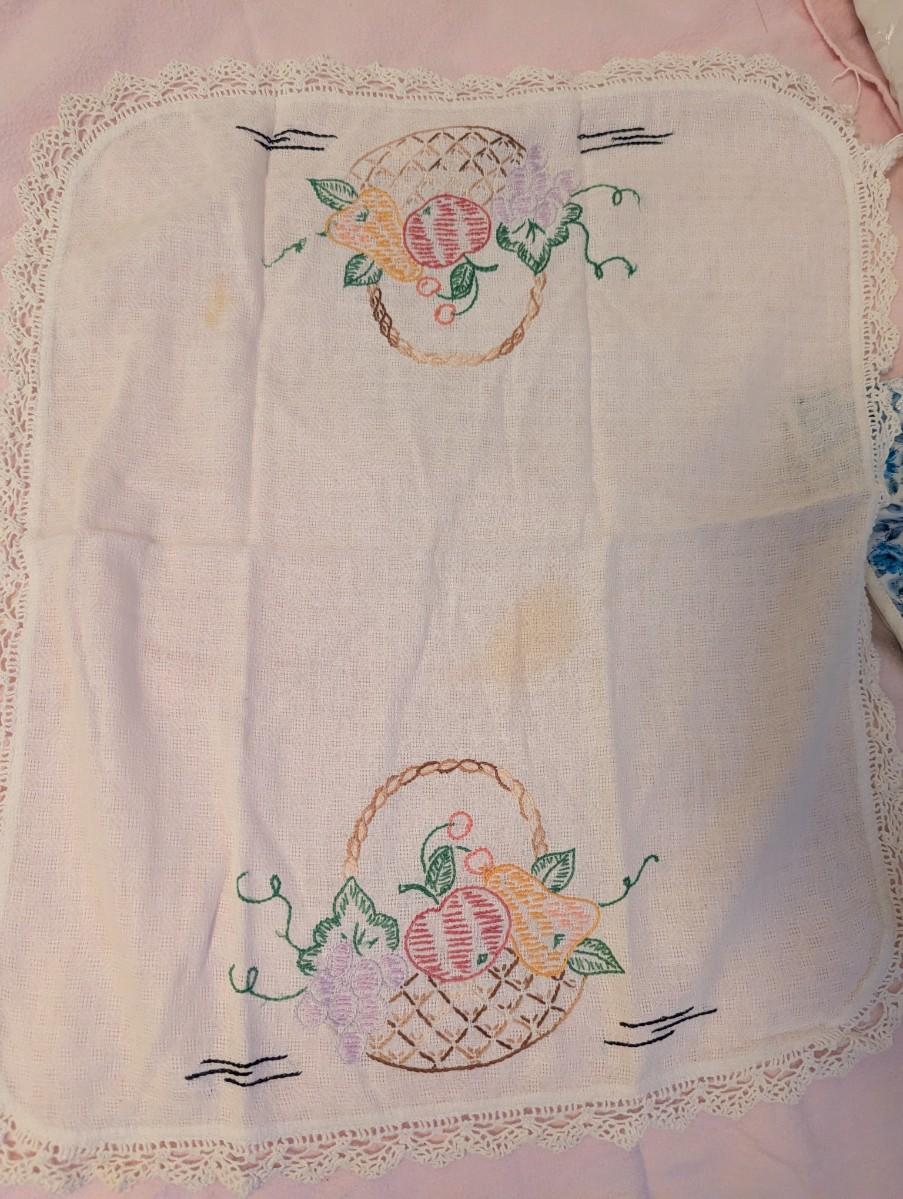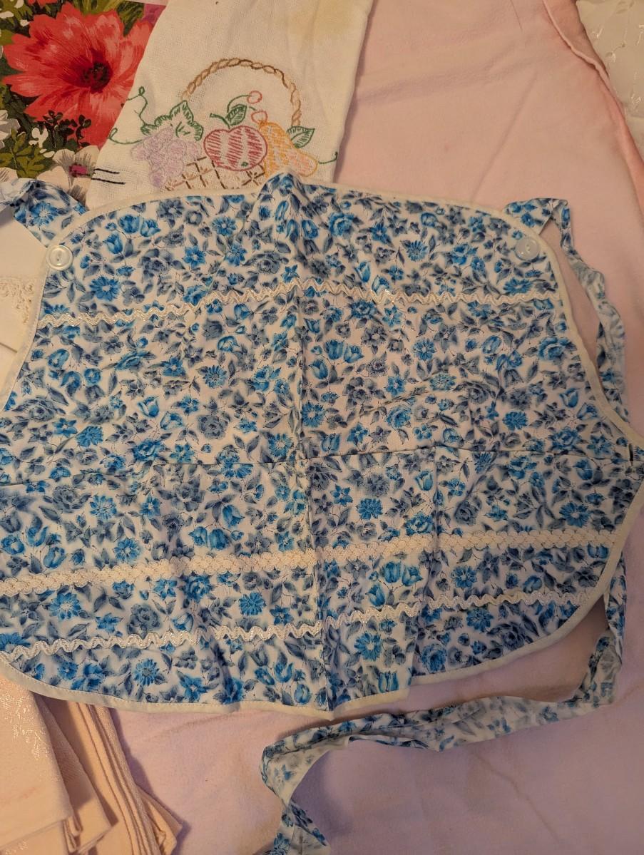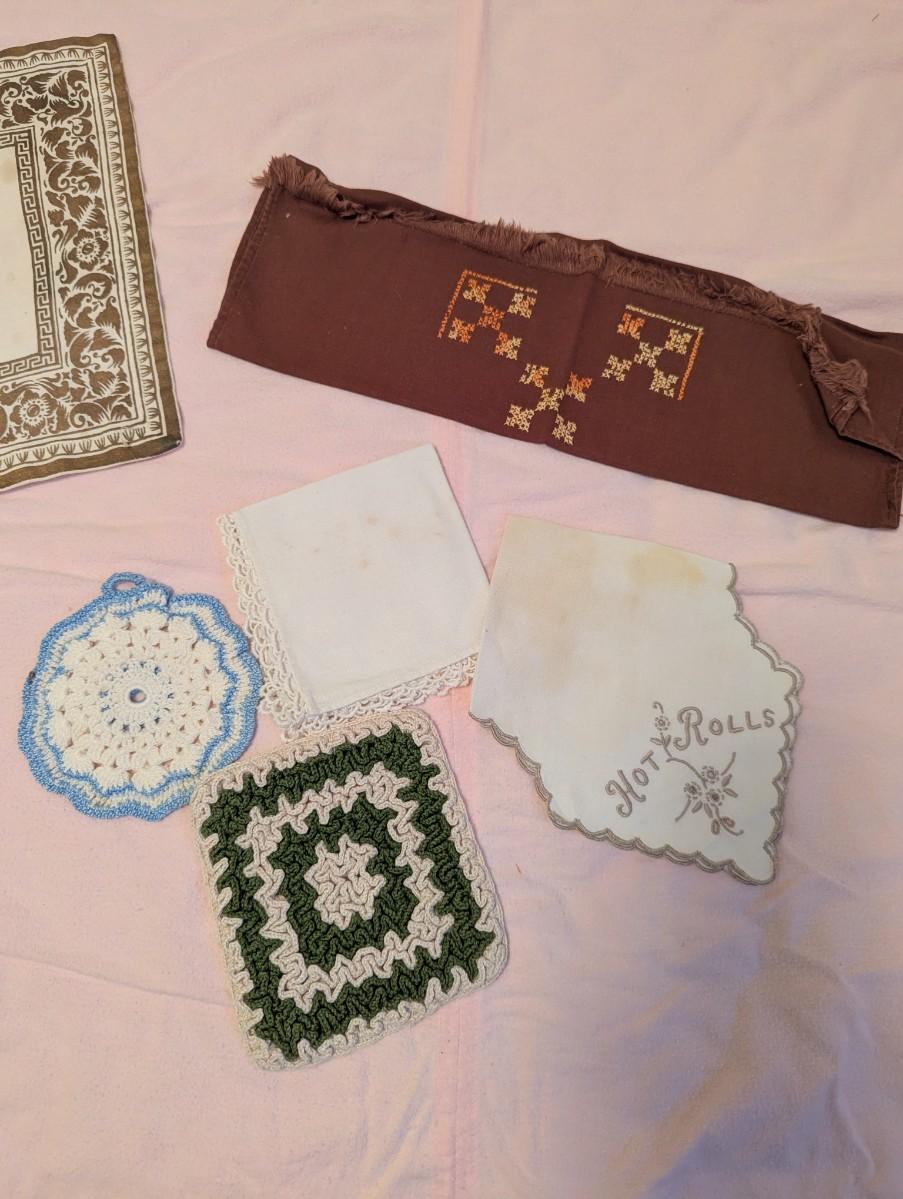 A group of linen napkins, Placemat, dish towels, table runners, vintage apron, and pot holders.