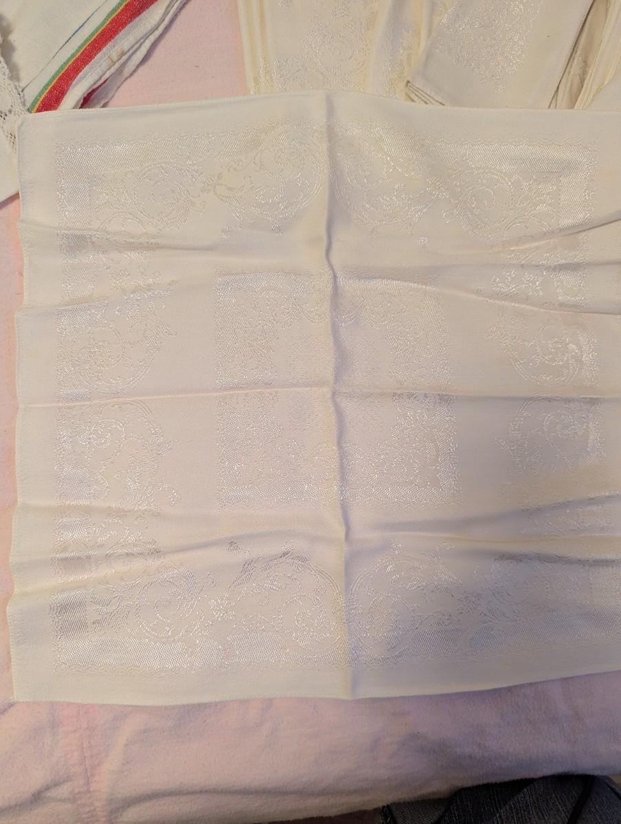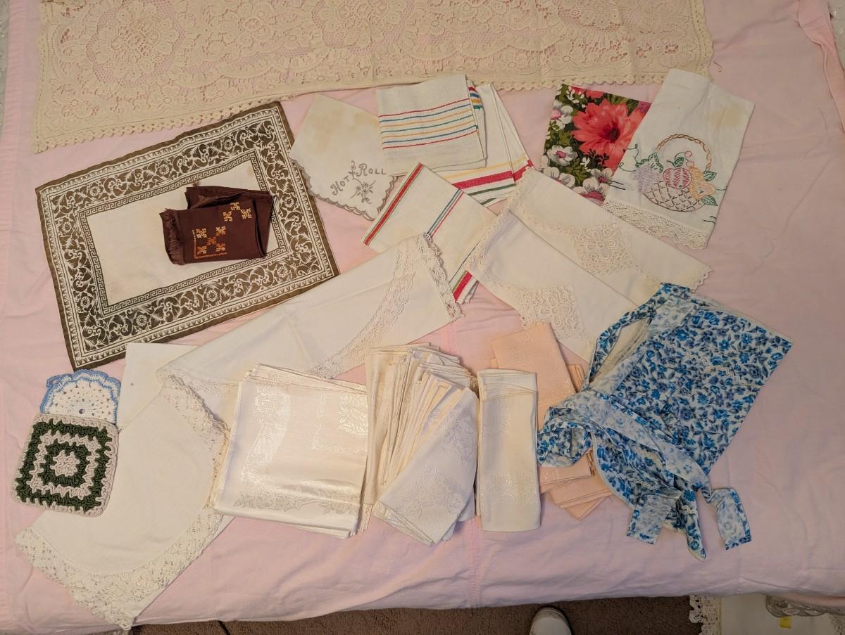 A Nice Lot of Linen Napkins, Dish Towels, Placemat, Vintage Apron, Table Runner.