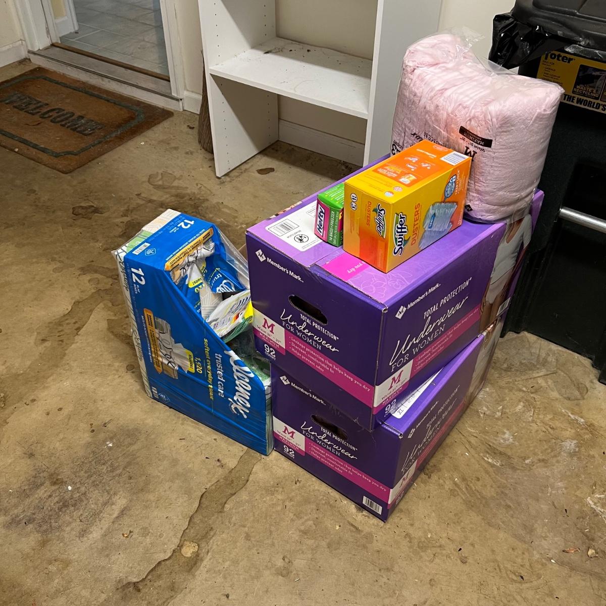 A variety of items that are new in box. A few boxes of tissue boxes are missing. See photos for full inventory.