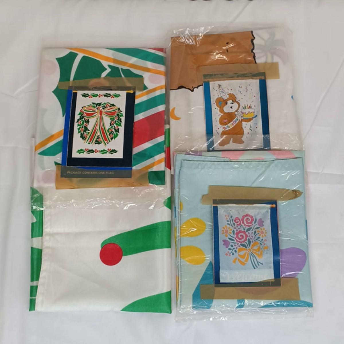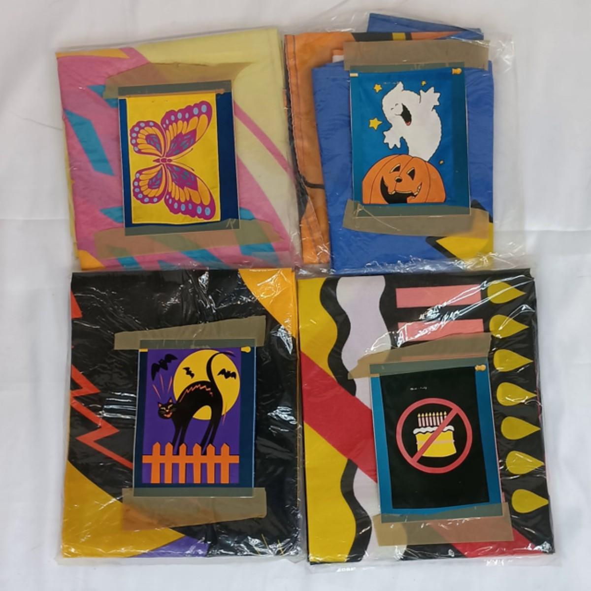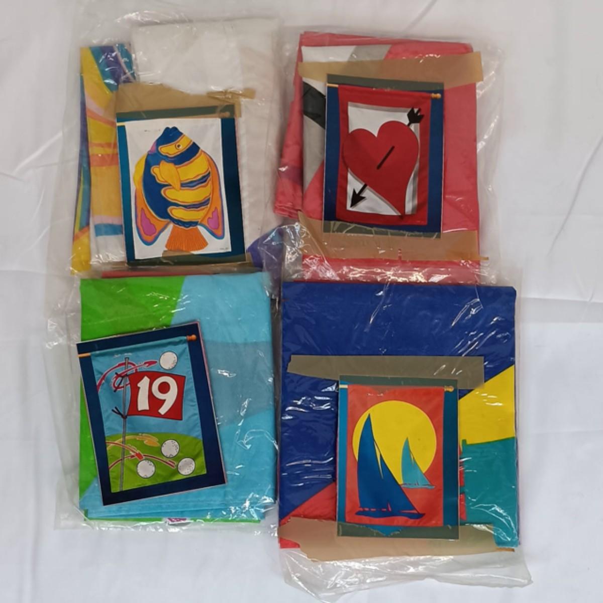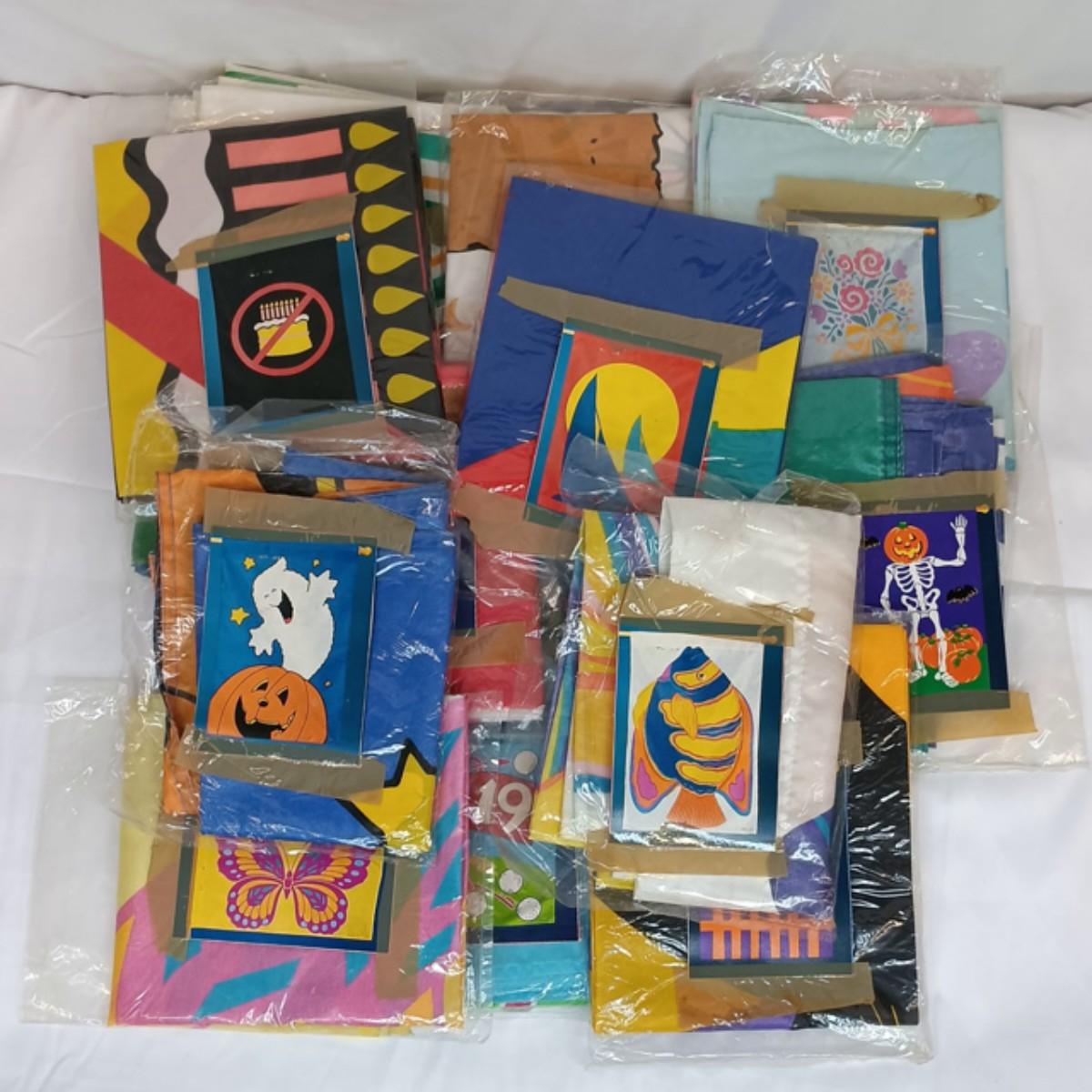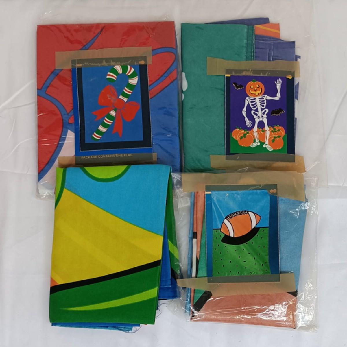 This lot of pre-owned flags includes 16 flags of various designs and themes.