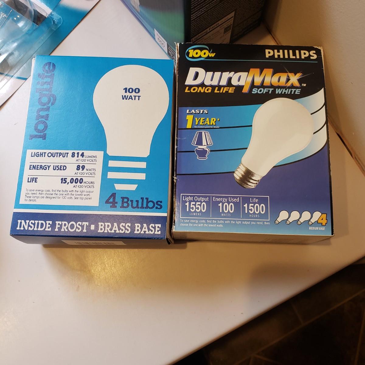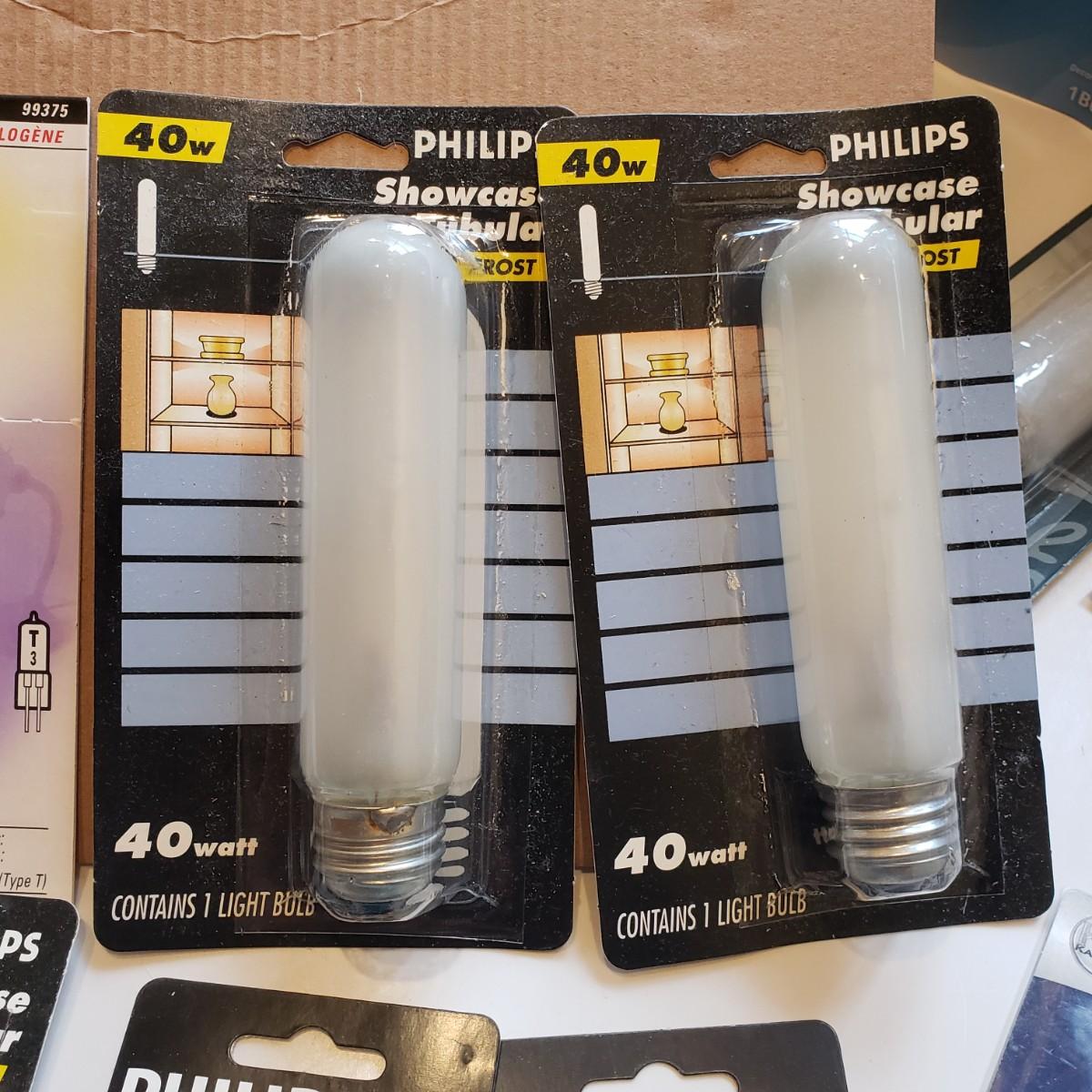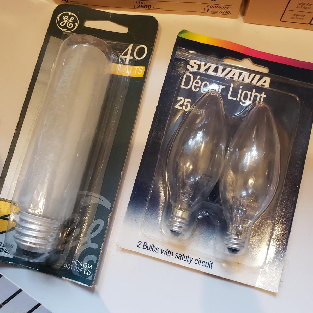 Most of the light bulbs are New In Box, while others have some missing out of the box. See pictures for quantities, sizes and wattage.