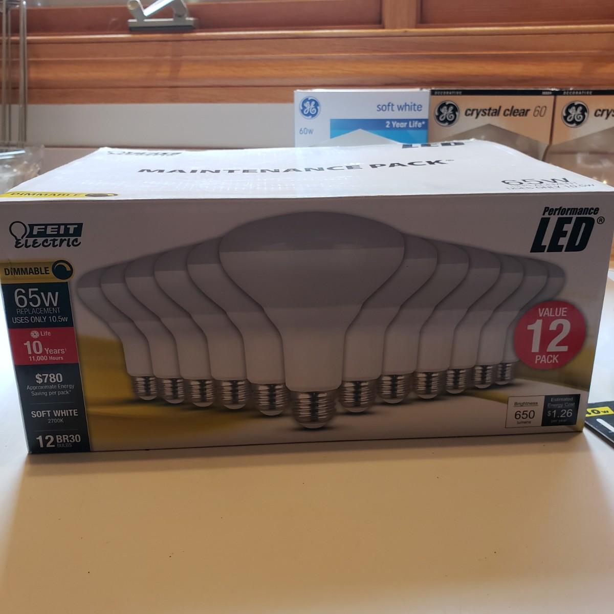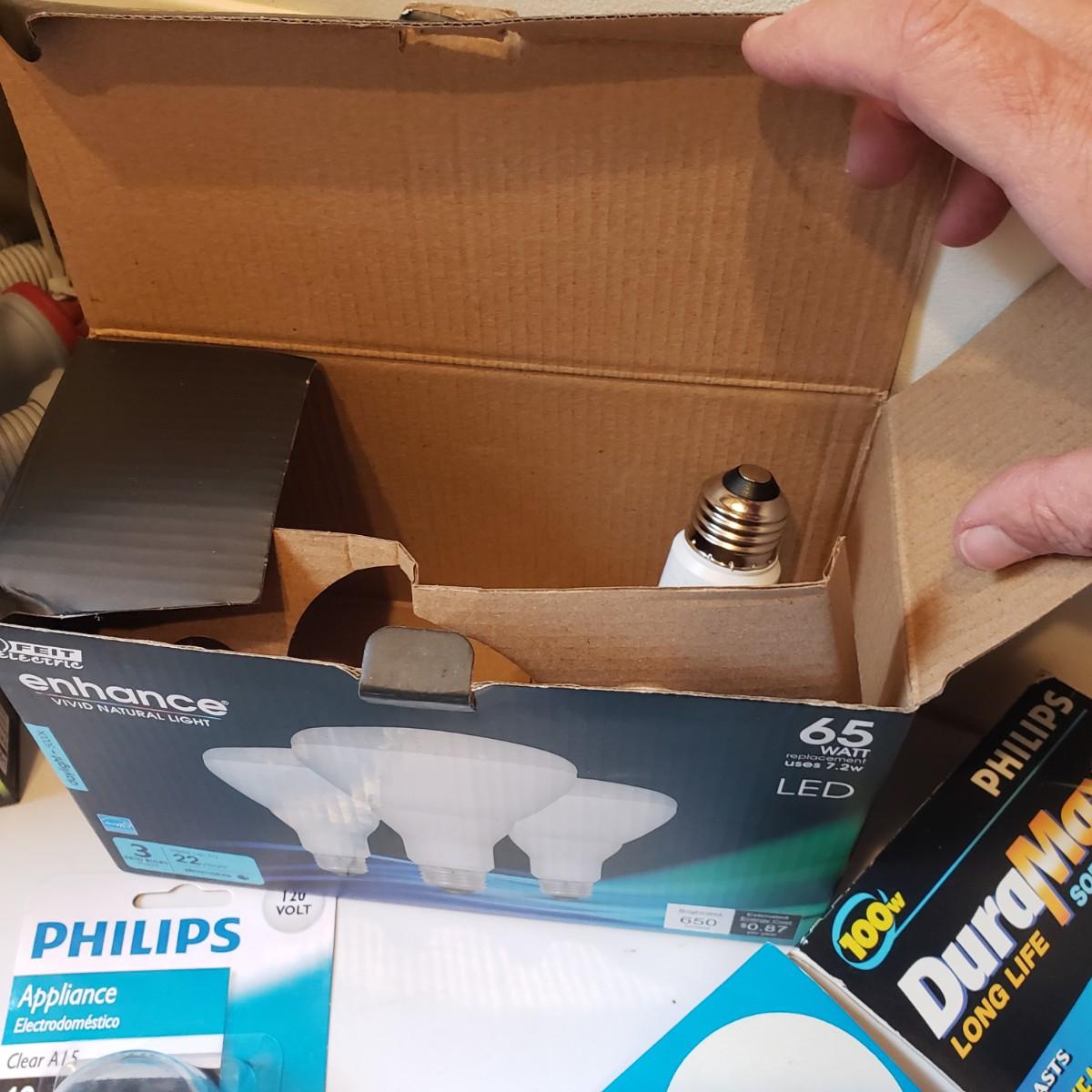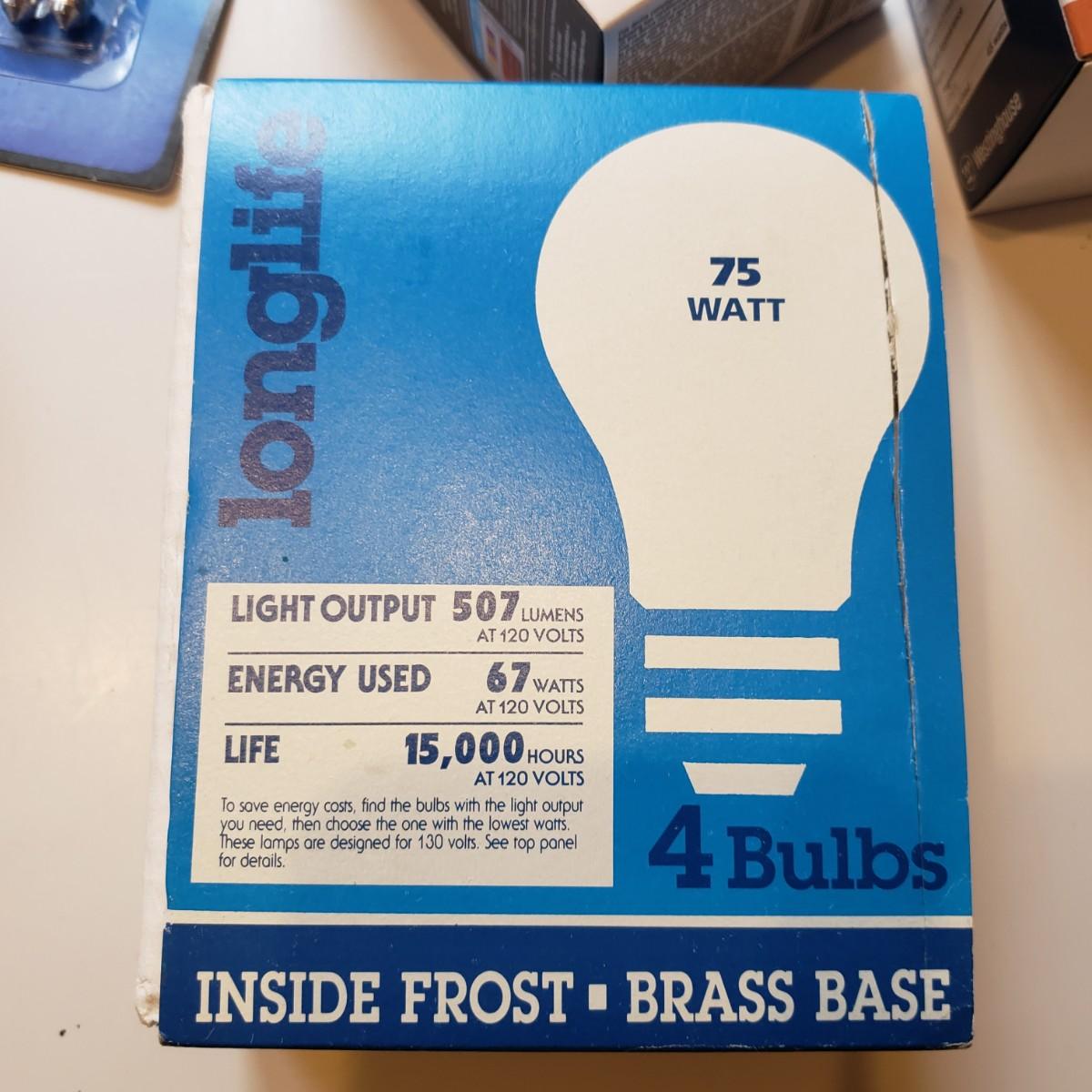Most of the light bulbs are New In Box, while others have some missing out of the box. See pictures for quantities, sizes and wattage.