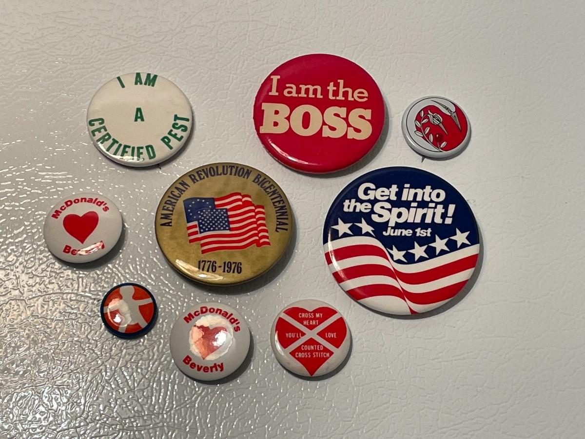 There are 9 buttons in the collection. The two McDonalds buttons are from circa 1967-1968 and they are from the first McDonalds to open in Beverly, Massachusetts.