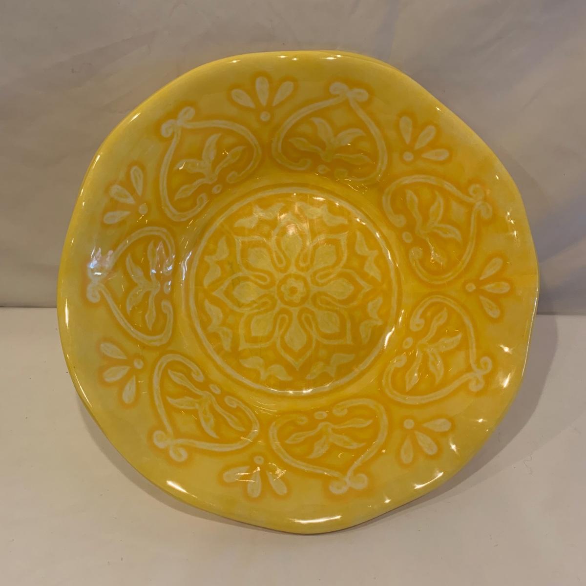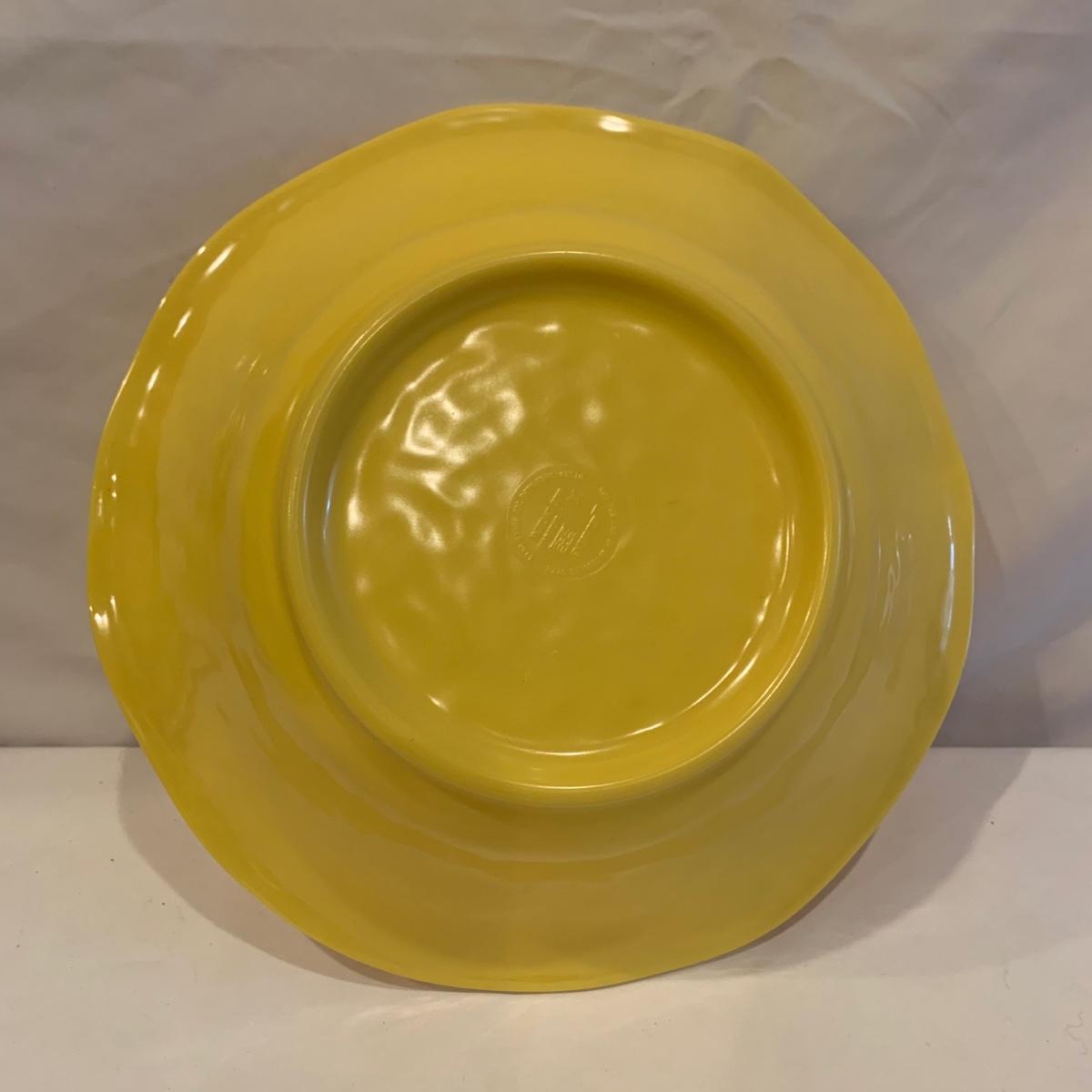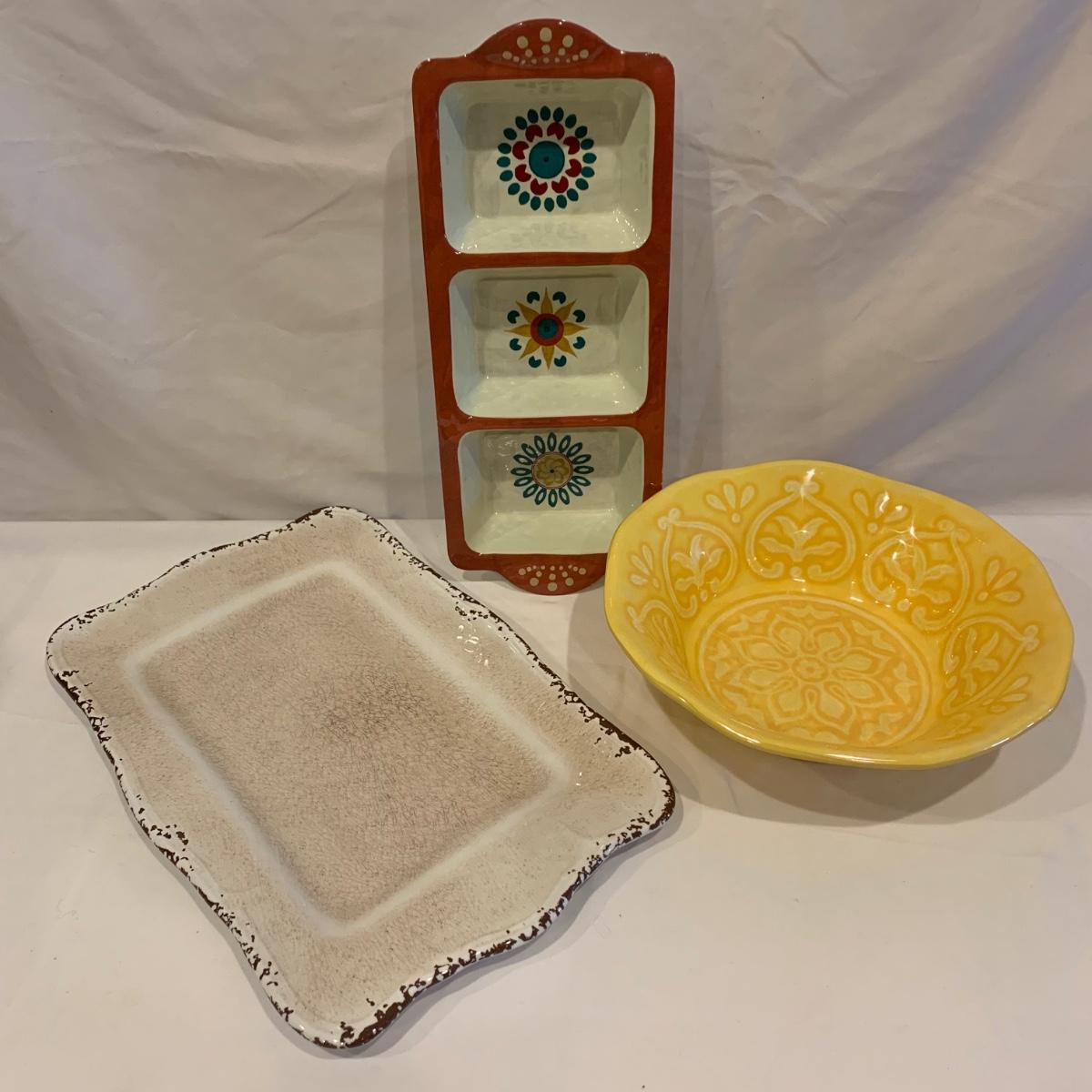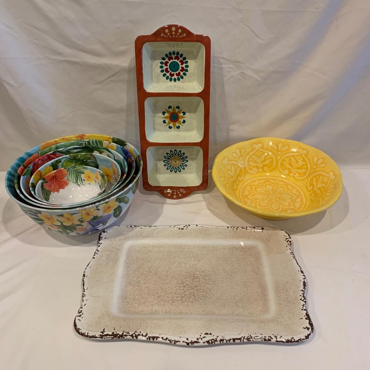 This lot includes colorful variety of plastic serving dishes. Includes set of five tropical flower nesting bowls, large yellow bowl, rectangular platter, and three section platter.