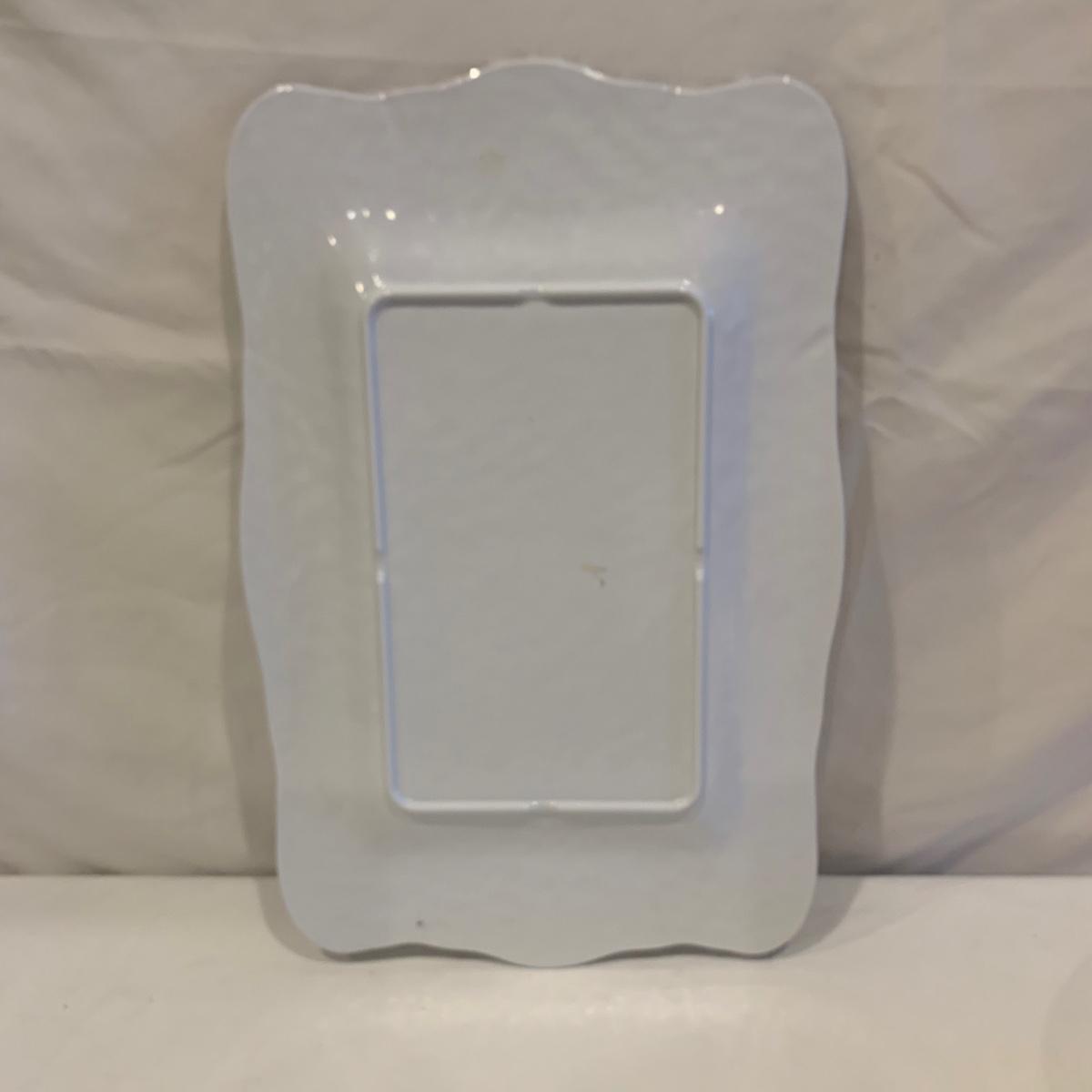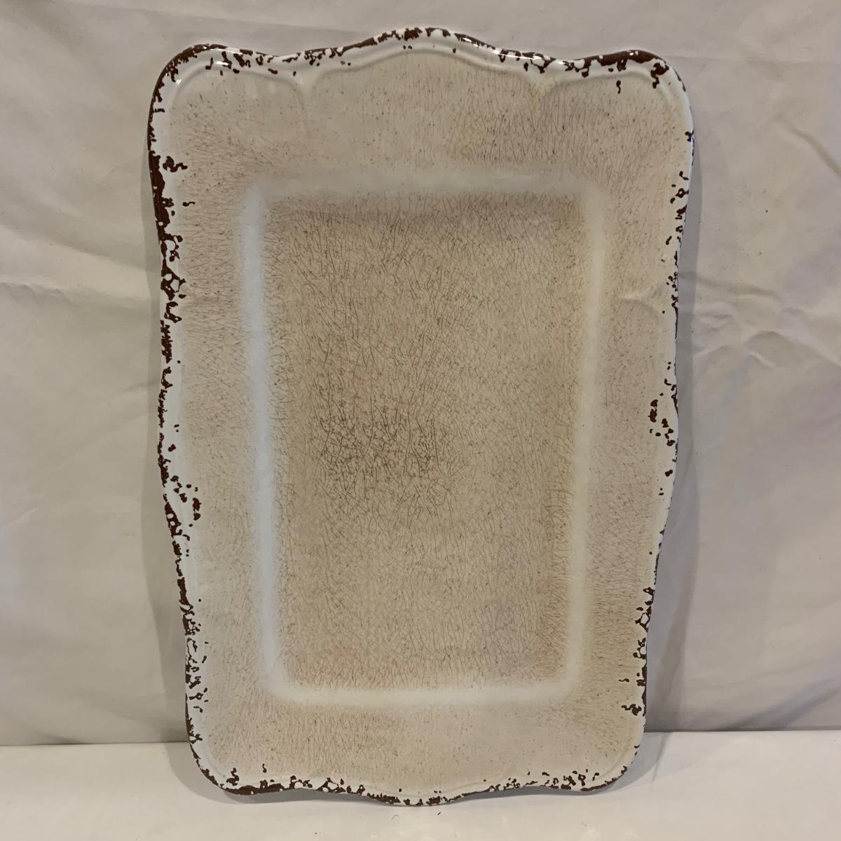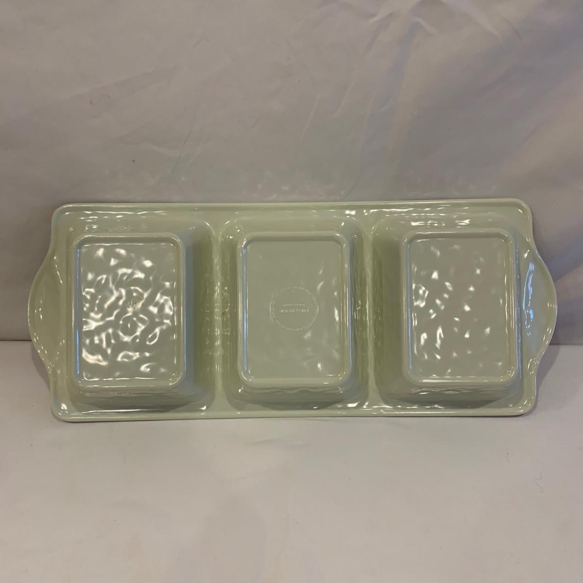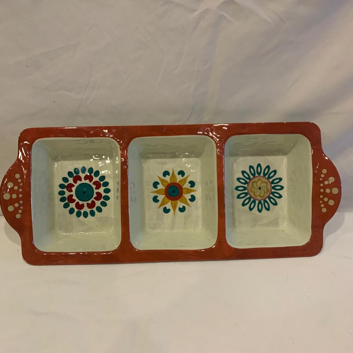 This lot includes colorful variety of plastic serving dishes. Includes set of five tropical flower nesting bowls, large yellow bowl, rectangular platter, and three section platter.