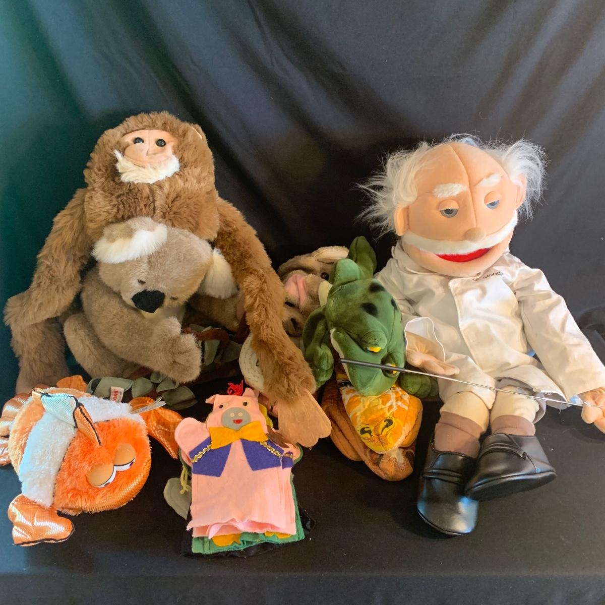 Exciting collection of puppets! Lot includes a 32” “Dr. Moody” puppet, variety of felt puppets, four animal pot holder puppets, one monkey puppet, one koala puppet, one fish puppet, one rhino puppet, and one frog puppet. All items have been used, but have lots of life left. See photos for more details. Shipping available.