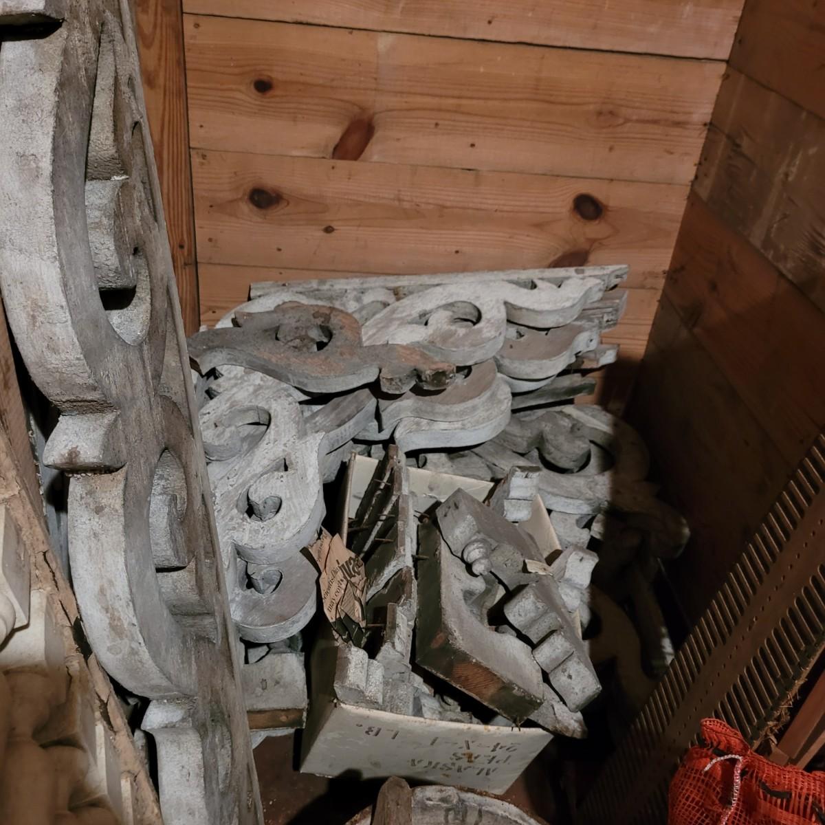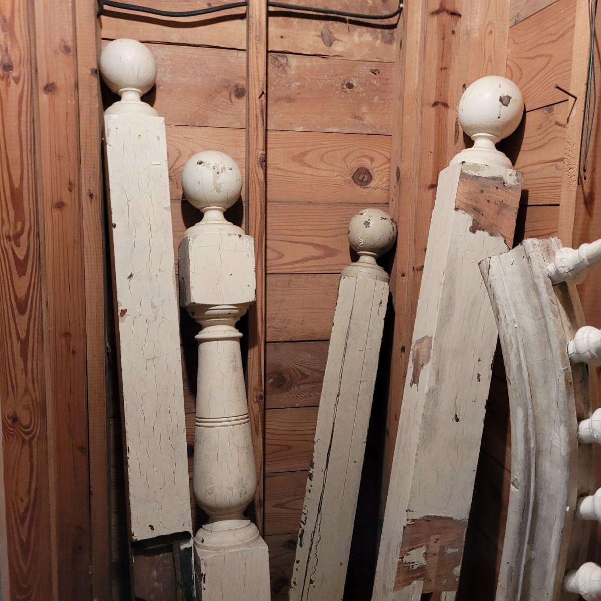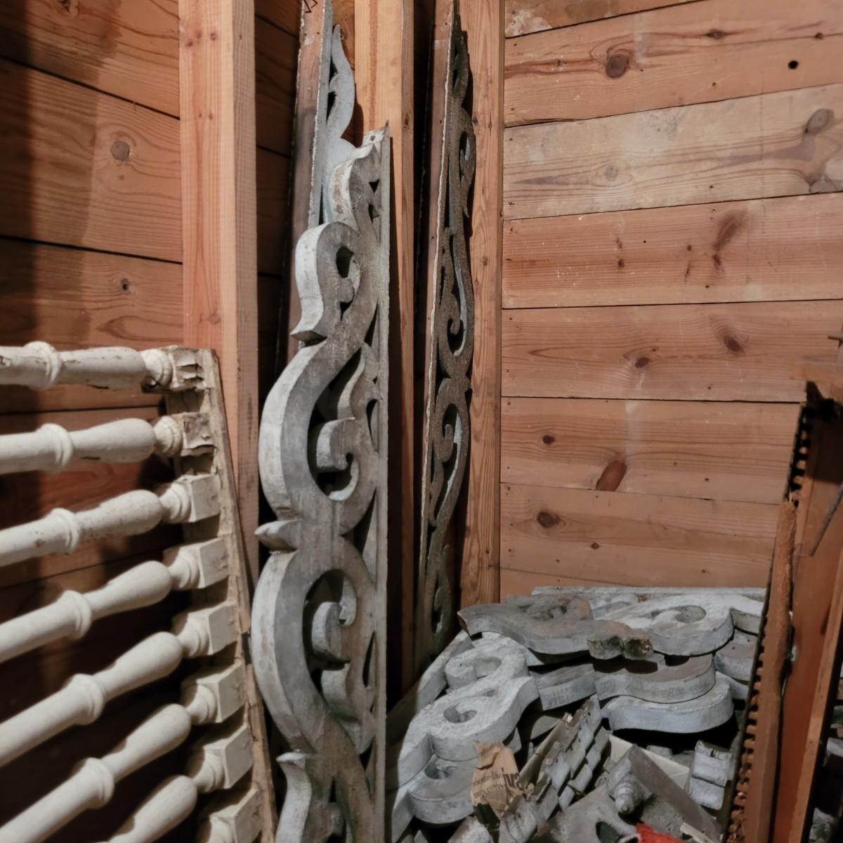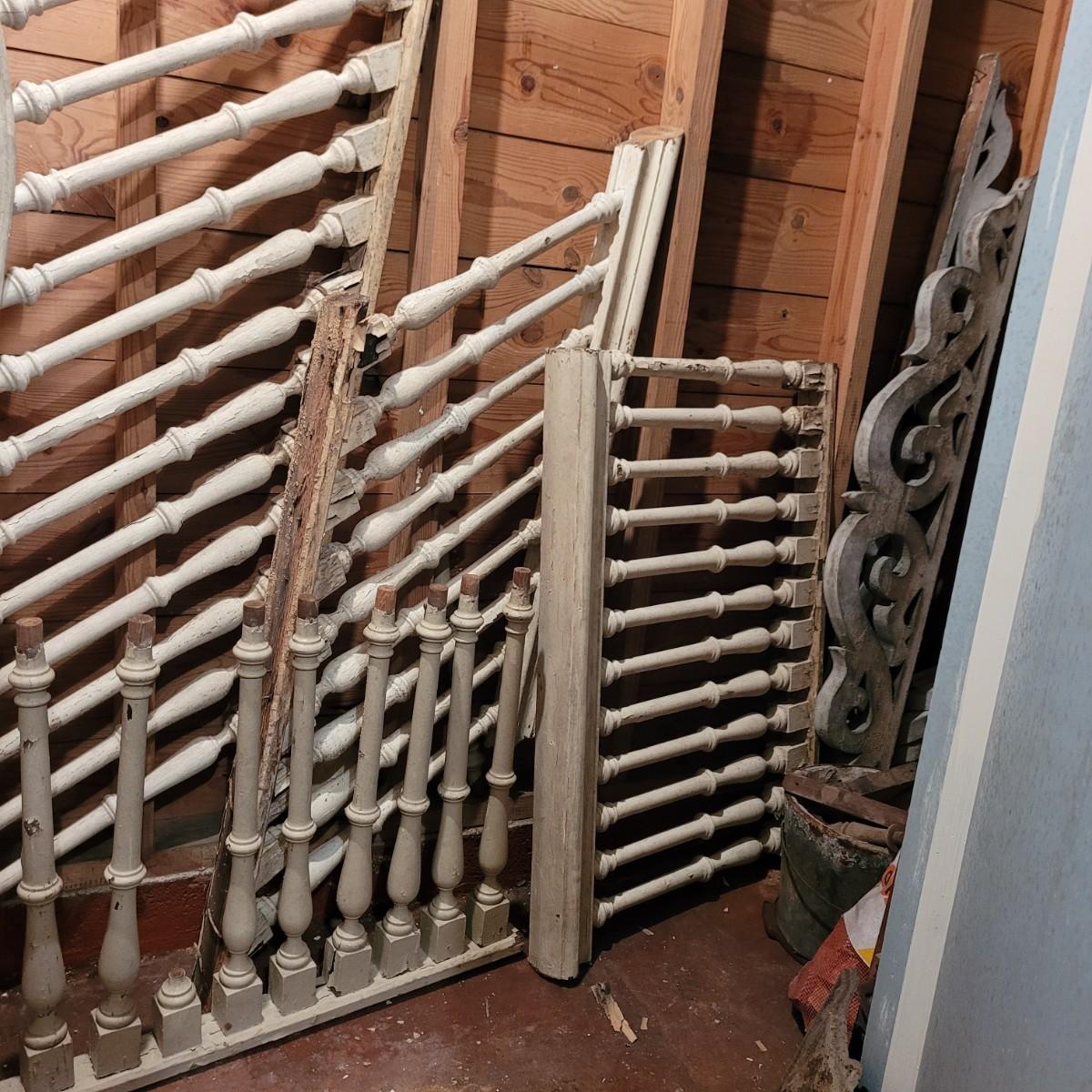 Variety of restorative woods, including decorative posts, railings, filigree pieces and blocks. For reference, large wooden post (farthest right in photo) measures approximately 5"L x5"W x67.5"H. Shortest railing piece on far right measures approximately 38.5"L x4"W x35"H. Large metal light fixture measures approximately 32"DIA x35"H. Local pickup only.