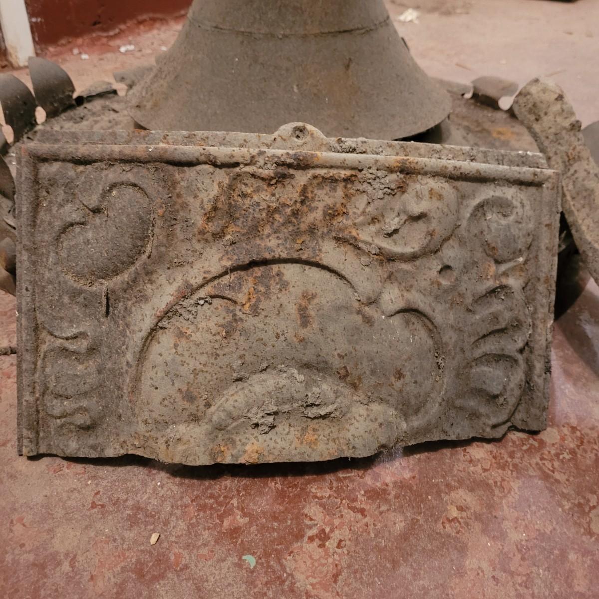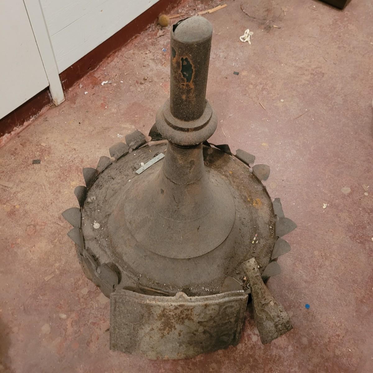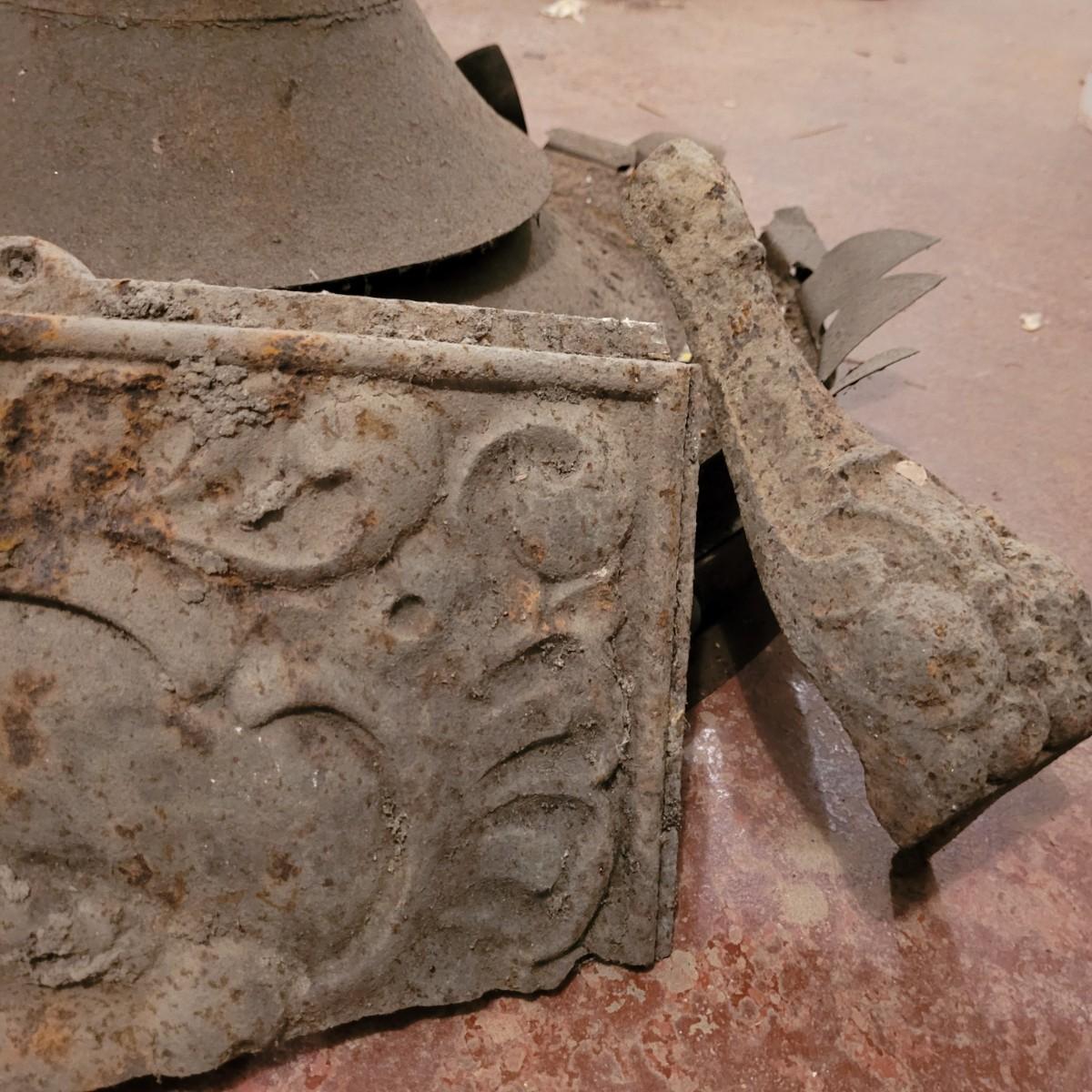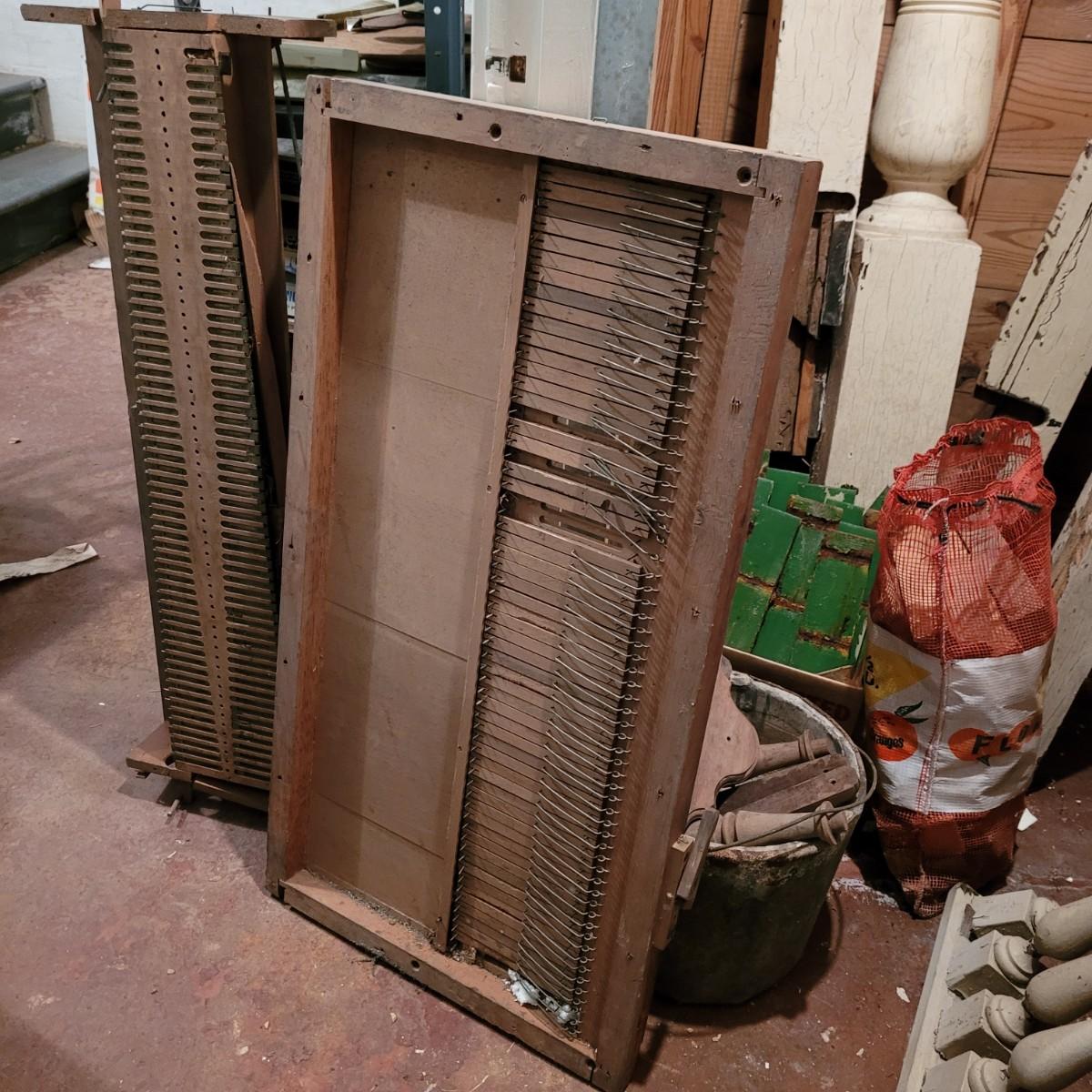 Variety of restorative woods, including decorative posts, railings, filigree pieces and blocks. For reference, large wooden post (farthest right in photo) measures approximately 5"L x5"W x67.5"H. Shortest railing piece on far right measures approximately 38.5"L x4"W x35"H. Large metal light fixture measures approximately 32"DIA x35"H. Local pickup only.