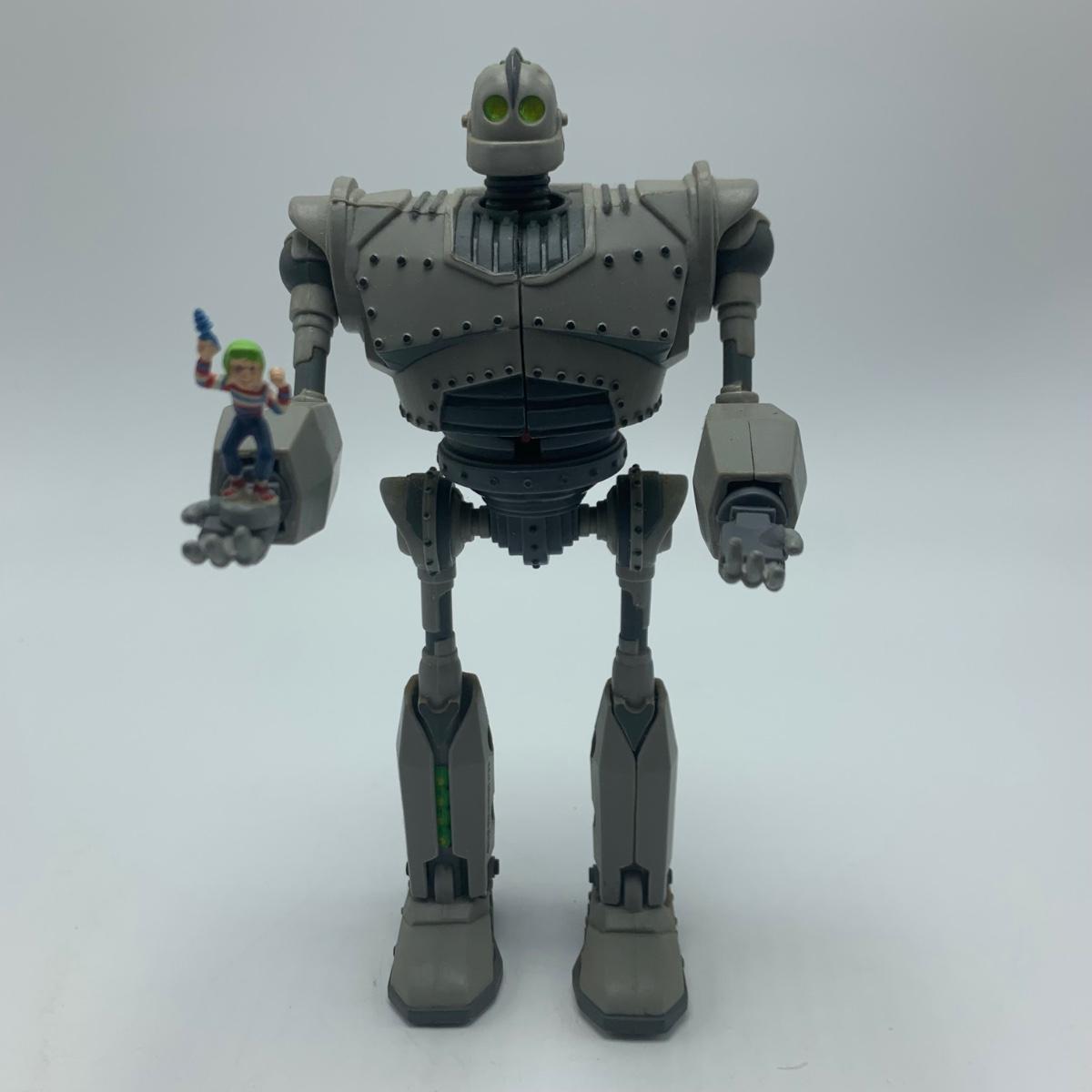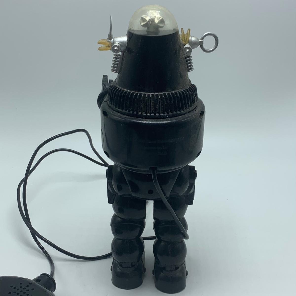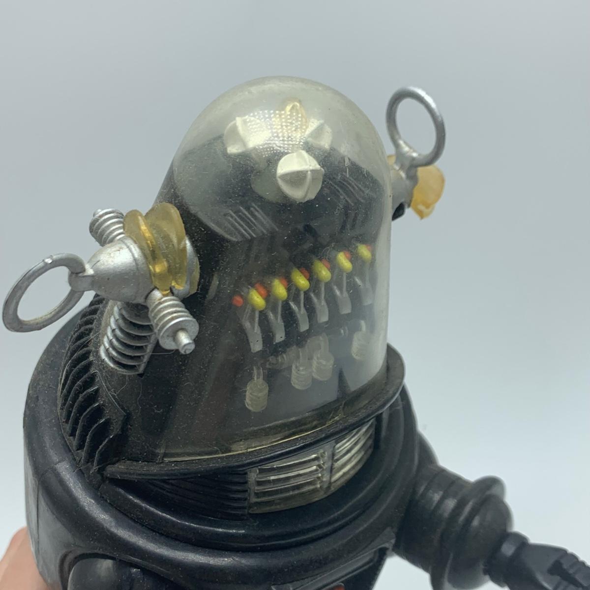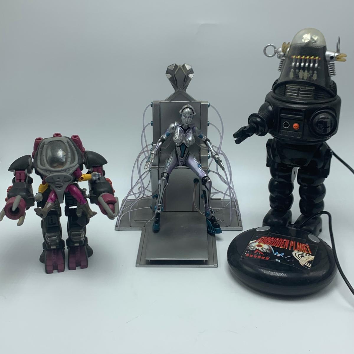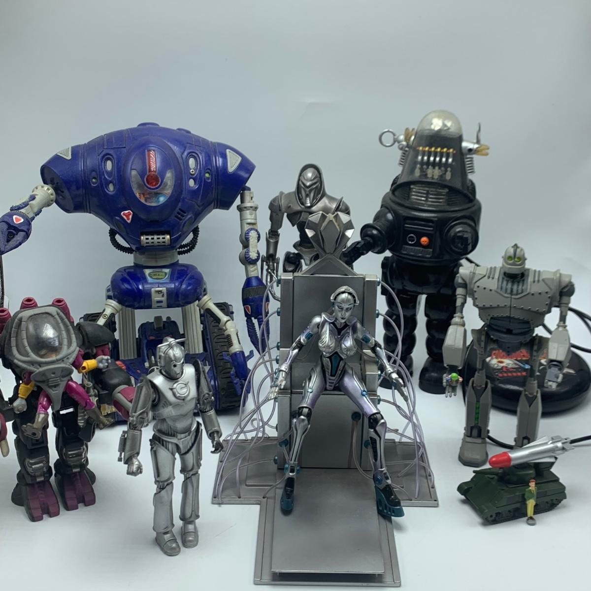 A variety of seven robot action figures. Featuring Maria from Metropolis, Phaeton from Exo Squad, Cyberman from Dr. Who, the Iron Giant, Cylon Centurion from Battlestar Galactica, and a robot from Lost in Space. The Lost in Space is the largest at 8” x 8” x 9”H. All items are plastic. The electronic items did not power on and likely need new batteries.
